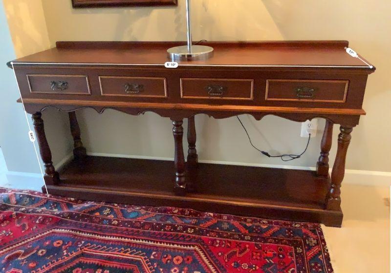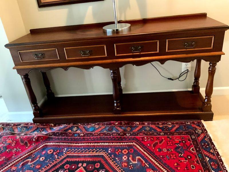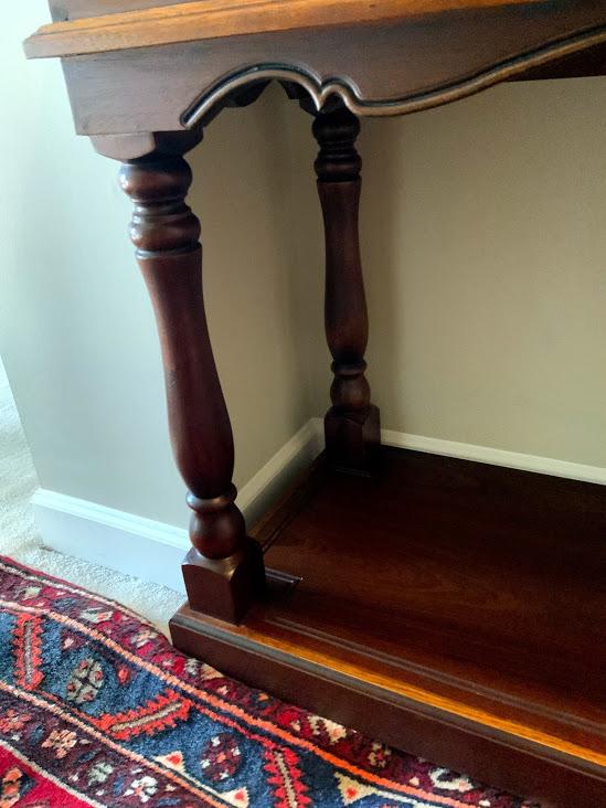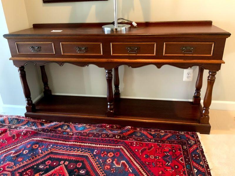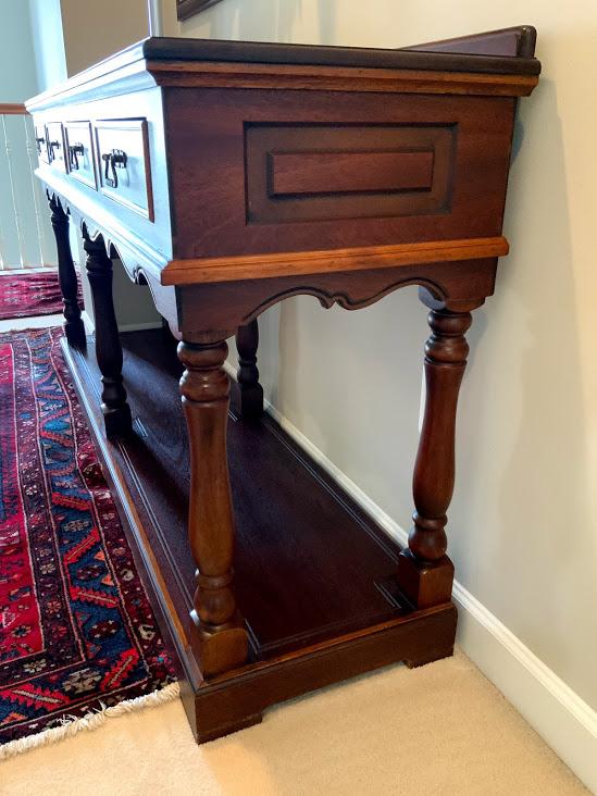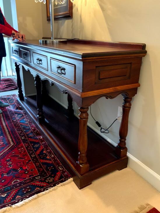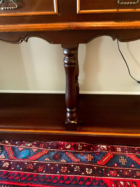 Imported traditional entry table crafted with classical carved solid legs. Rectangular top and bottom provides perfect shelving.