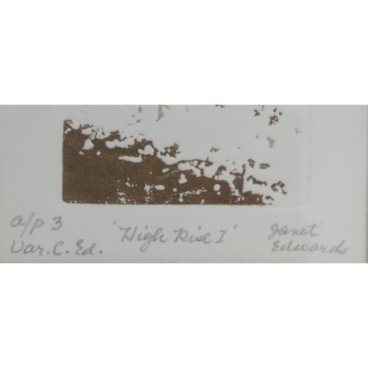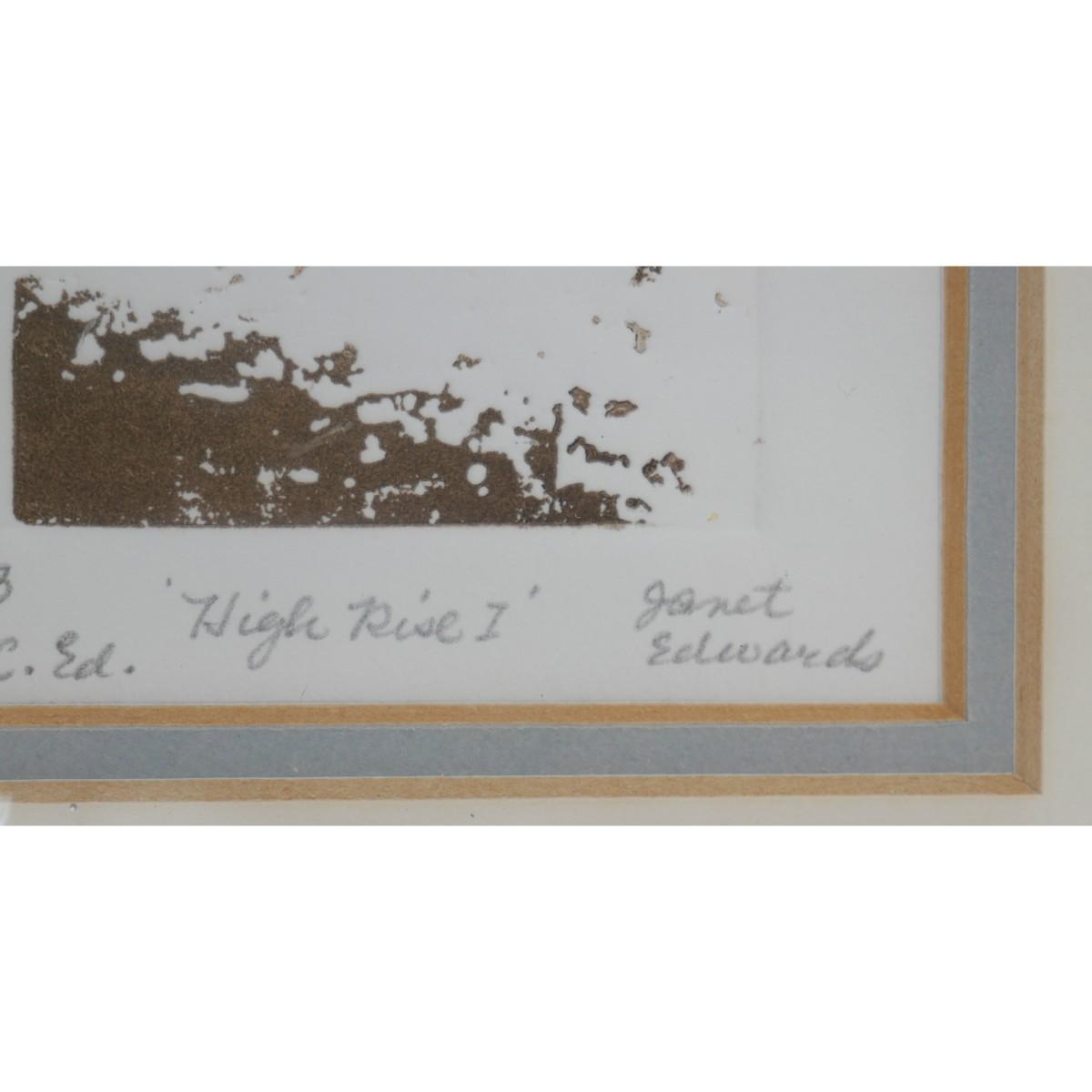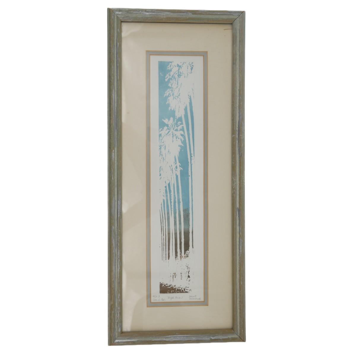 "High Rise I" palm tree artwork by Janet Edwards. A/P 3, hand-signed by artist in pencil. Matted and framed. Art is in excellent condition, frame has tear on back paper. Art measures approximately 3" x 12", total frame measures 7" x 17". (A68)