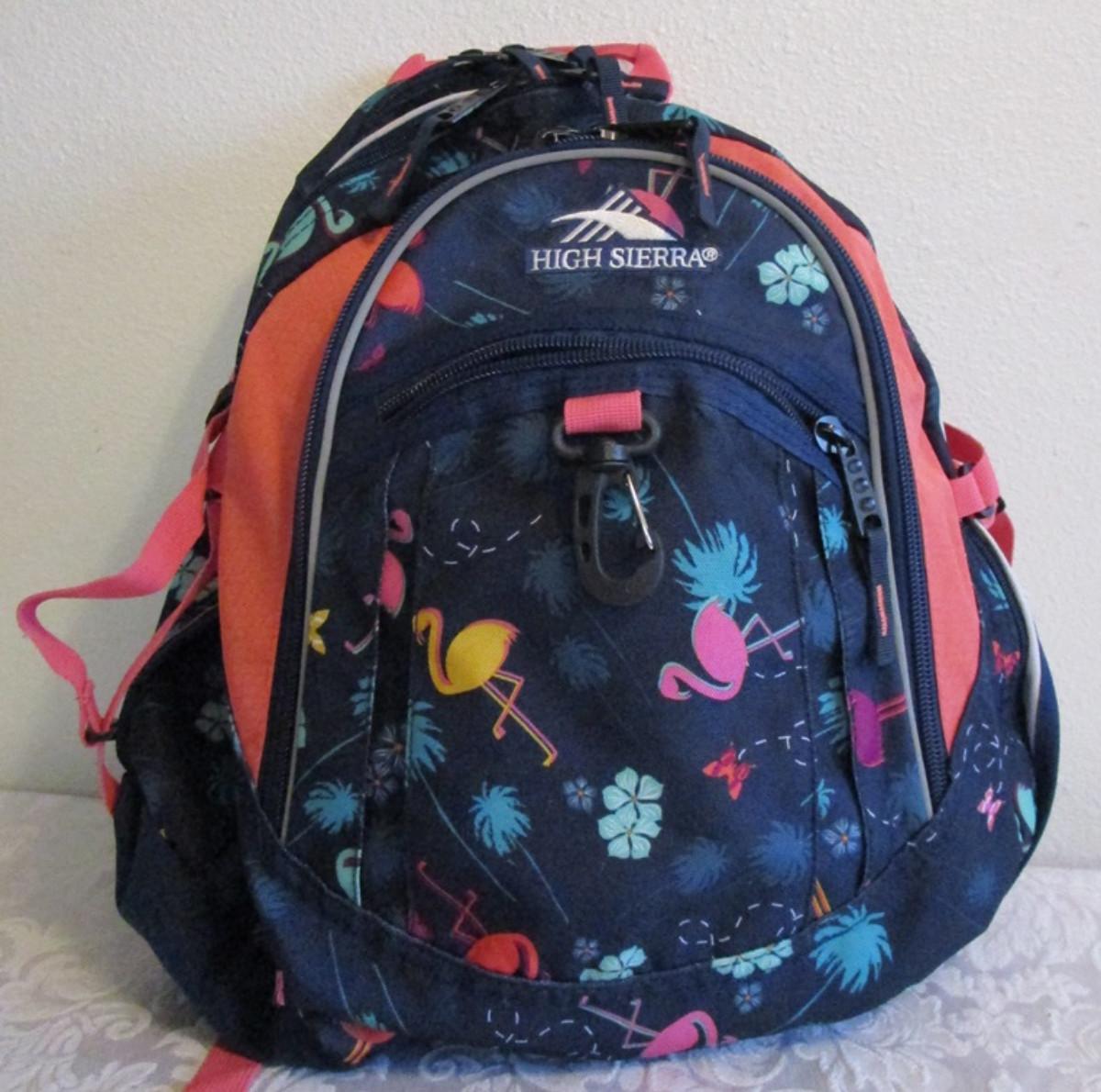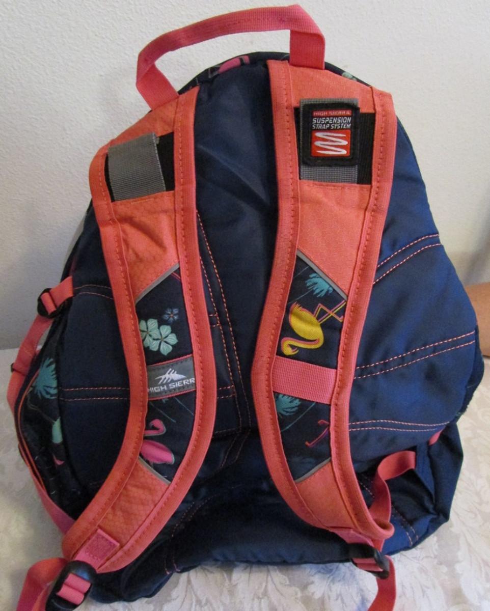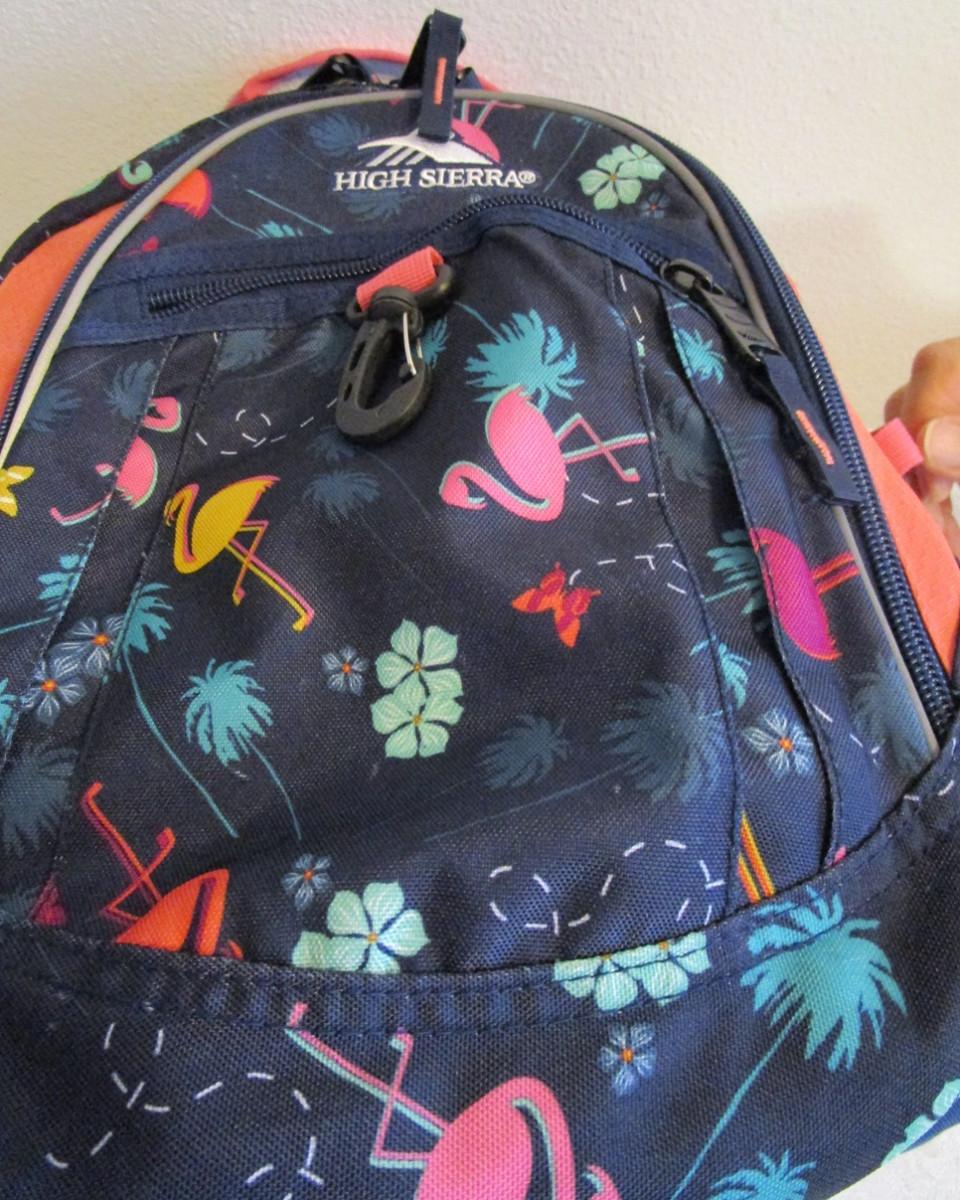 4 zipper openings, flamingo design, 9" deep x 18" tall x 12" wide, padded back, See pictures