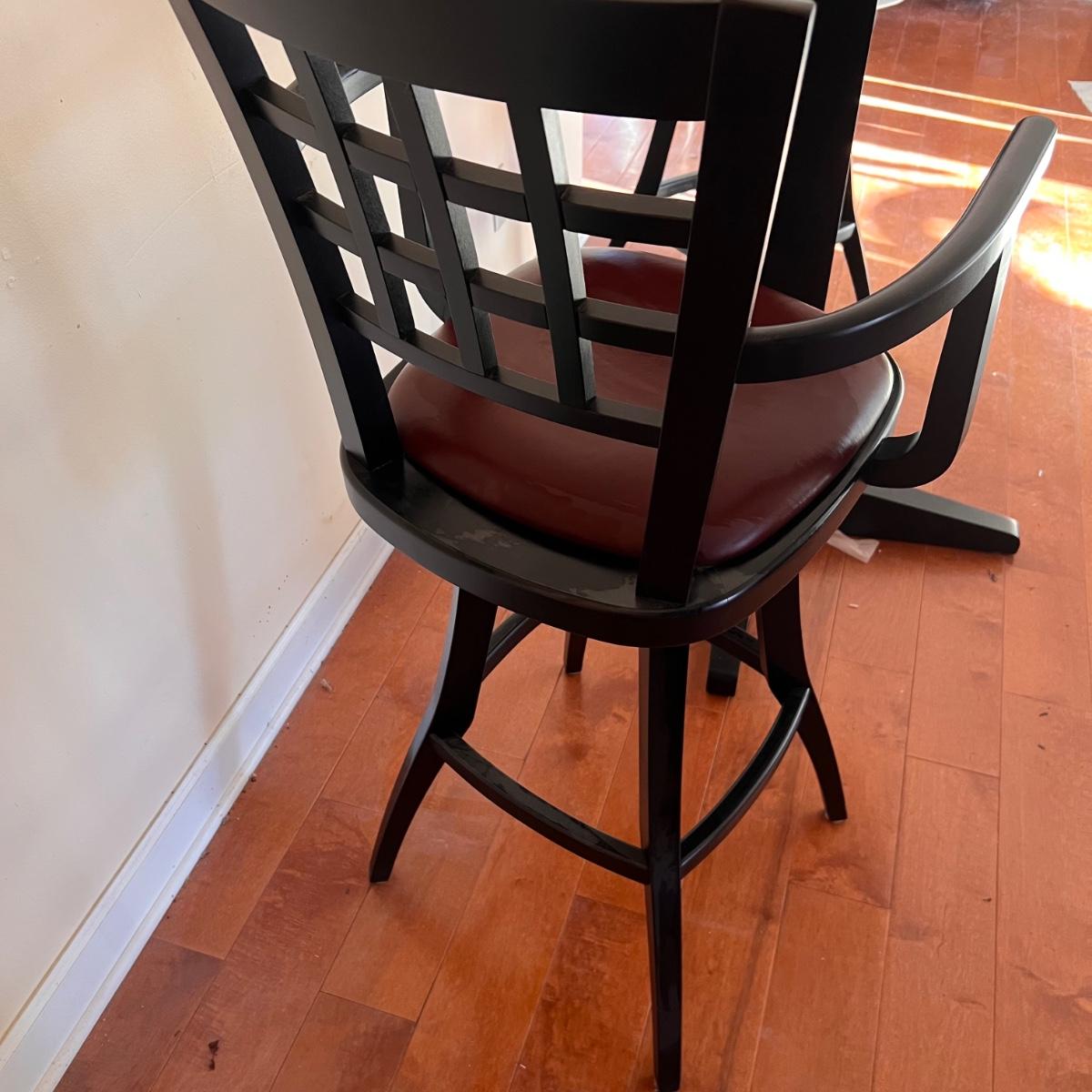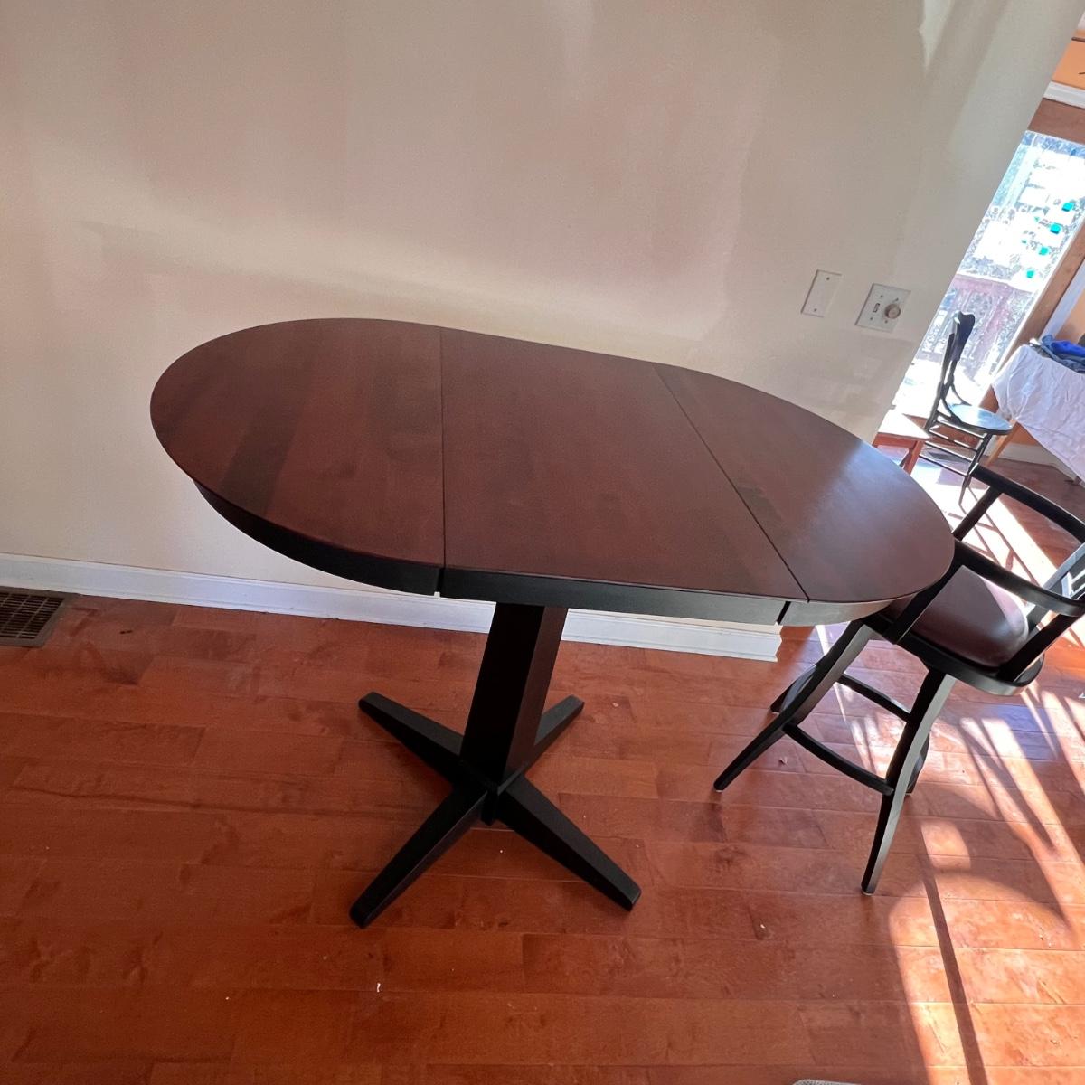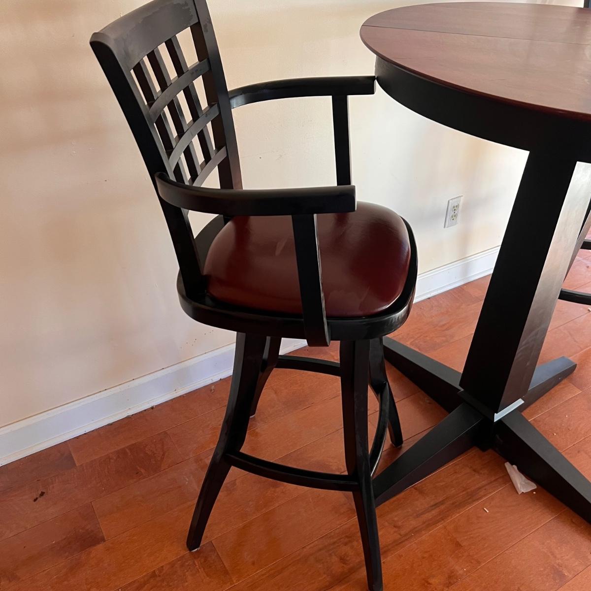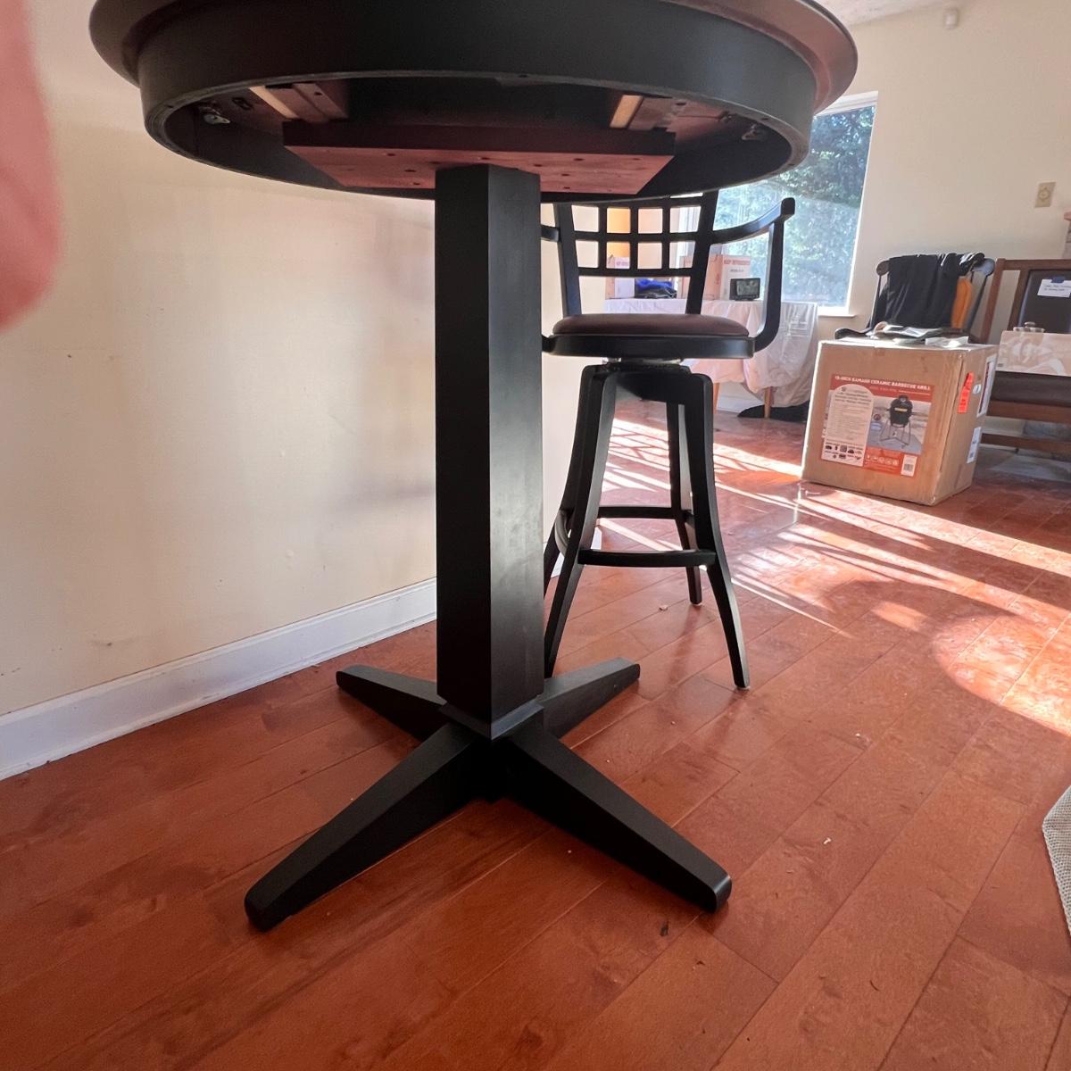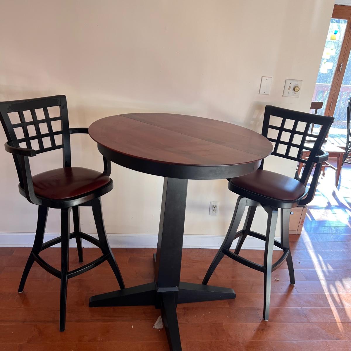 This attractive high-top table has a leaf. Measures 36”D (56” x 36” with leaf in place) x 41”H. The table has one small blemish which likely could be touched up easily to fix. The leaf comes with protective cover that is labeled Haggerty, but as the table has no Haggerty markings, we are unsure if this is the brand. Two chairs with burgundy vinyl padded seats are included. These chairs swivel and measure 21” x 25” x 45”H with 29” seat height.