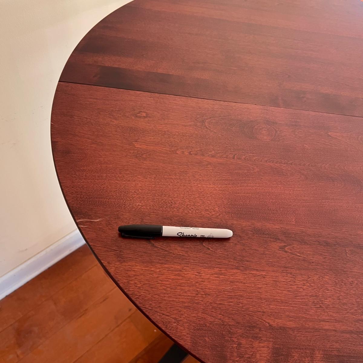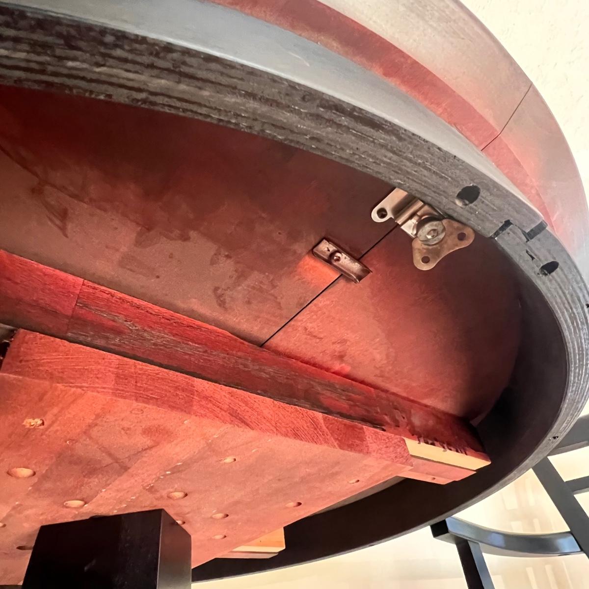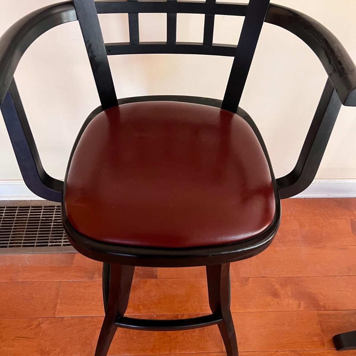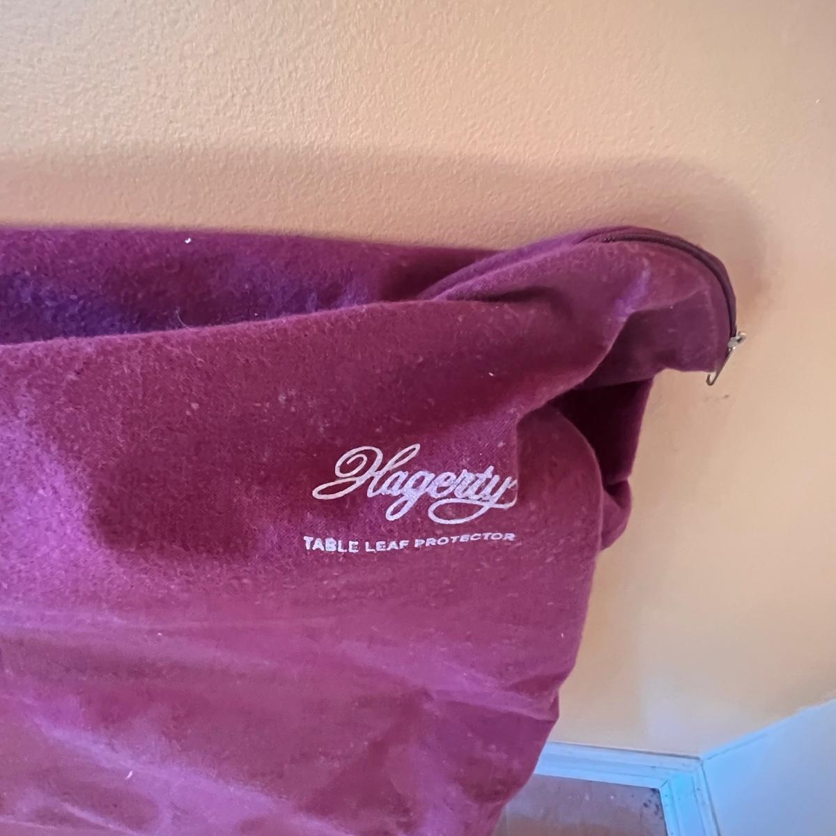 This attractive high-top table has a leaf. Measures 36”D (56” x 36” with leaf in place) x 41”H. The table has one small blemish which likely could be touched up easily to fix. The leaf comes with protective cover that is labeled Haggerty, but as the table has no Haggerty markings, we are unsure if this is the brand. Two chairs with burgundy vinyl padded seats are included. These chairs swivel and measure 21” x 25” x 45”H with 29” seat height.