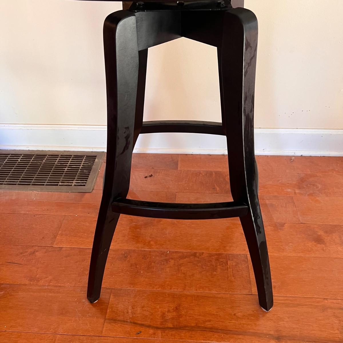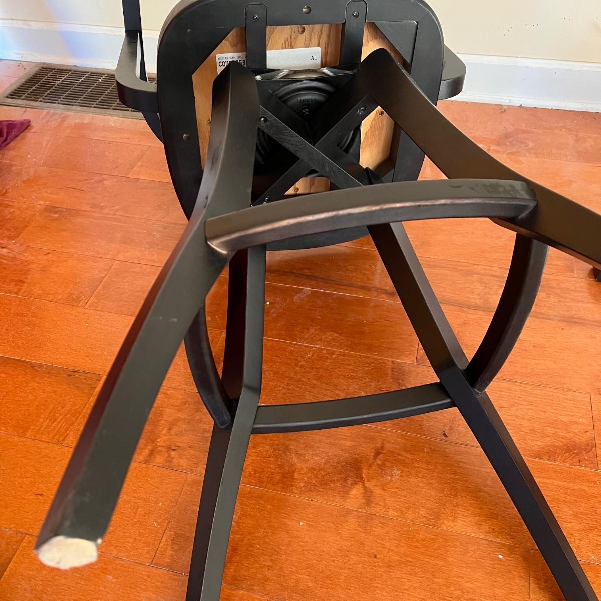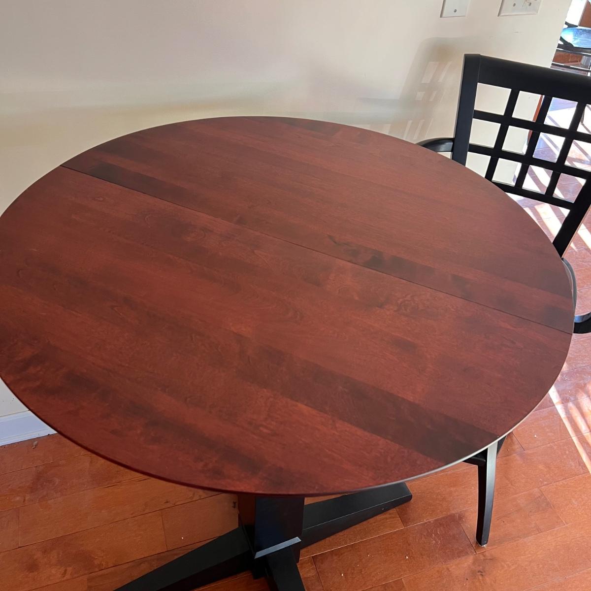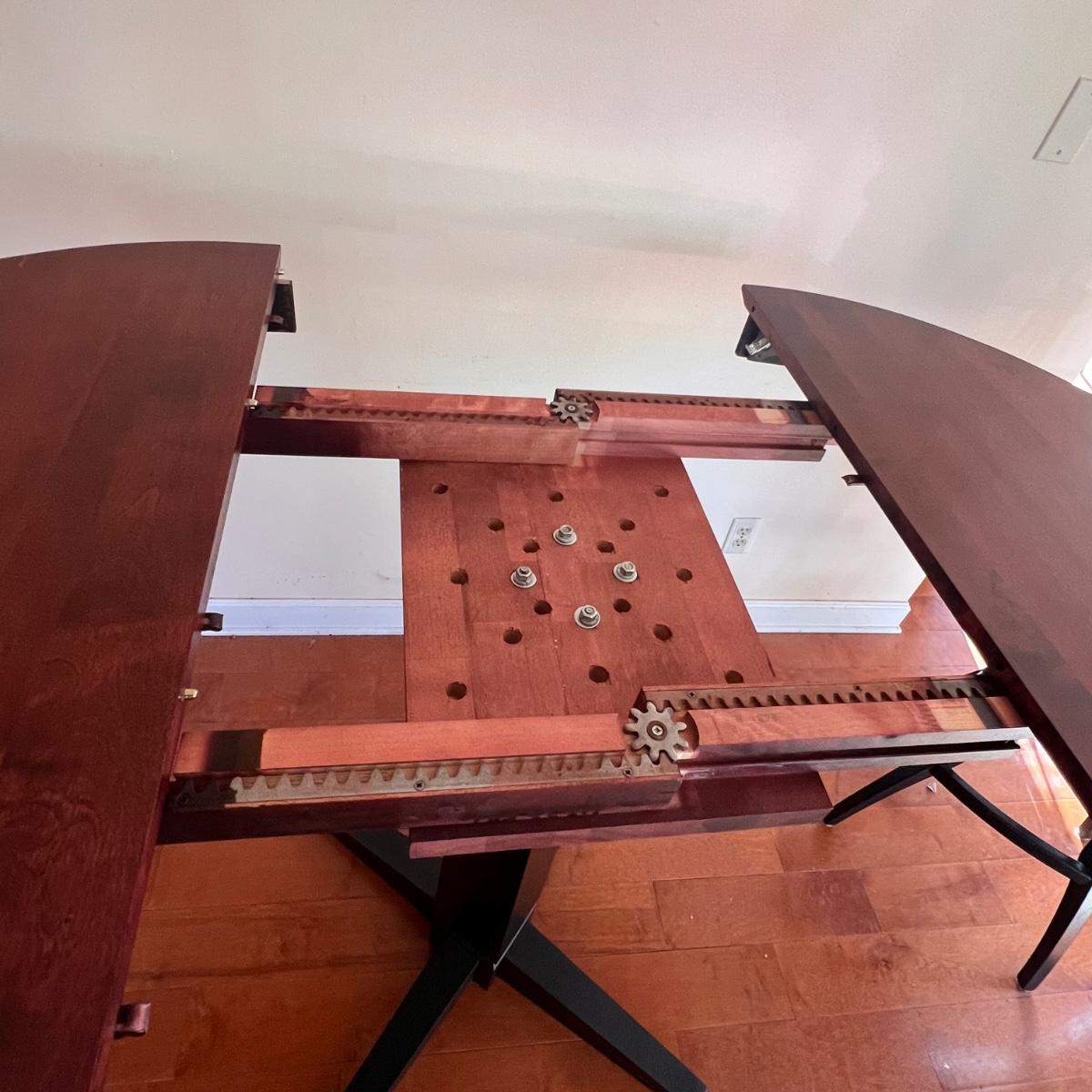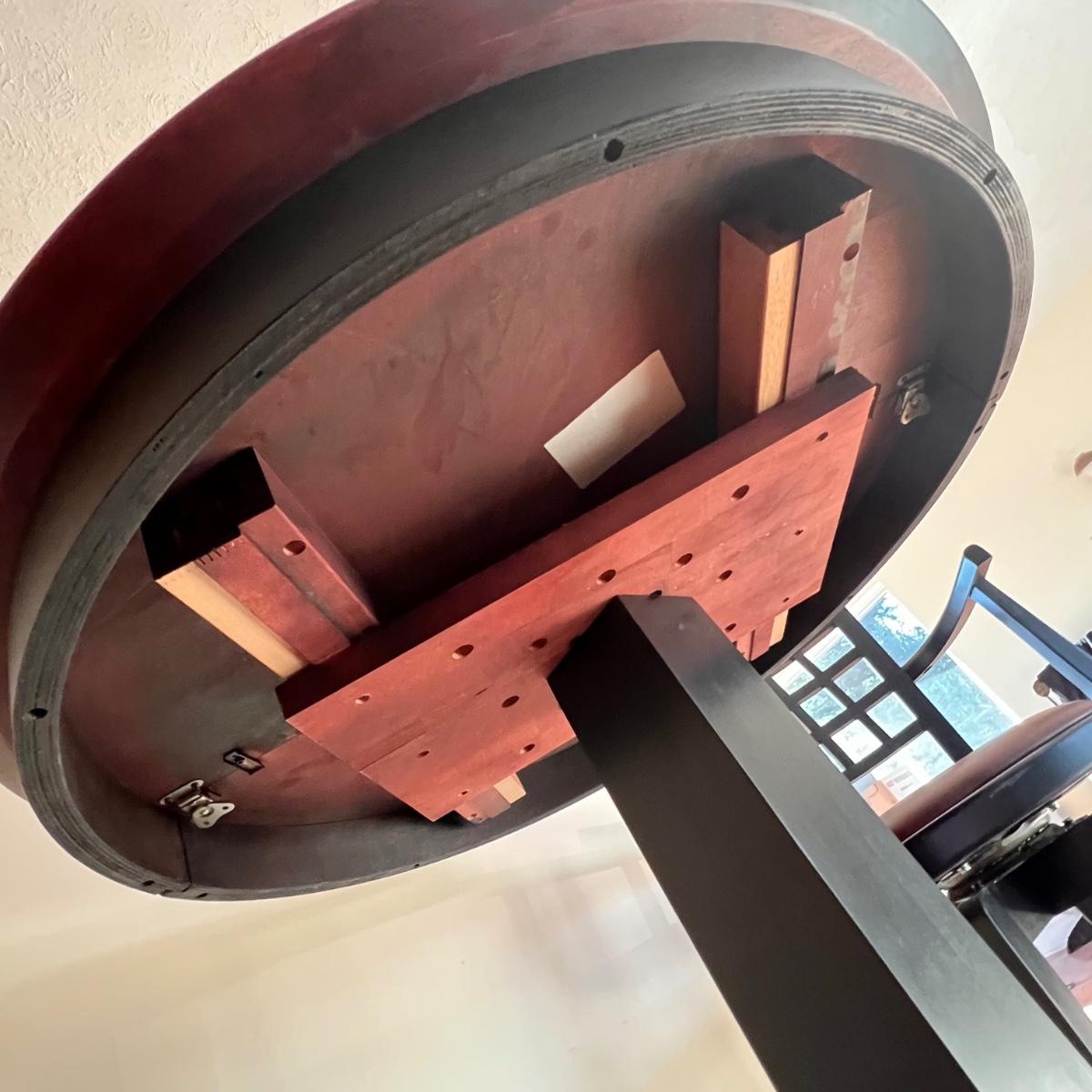 This attractive high-top table has a leaf. Measures 36”D (56” x 36” with leaf in place) x 41”H. The table has one small blemish which likely could be touched up easily to fix. The leaf comes with protective cover that is labeled Haggerty, but as the table has no Haggerty markings, we are unsure if this is the brand. Two chairs with burgundy vinyl padded seats are included. These chairs swivel and measure 21” x 25” x 45”H with 29” seat height.