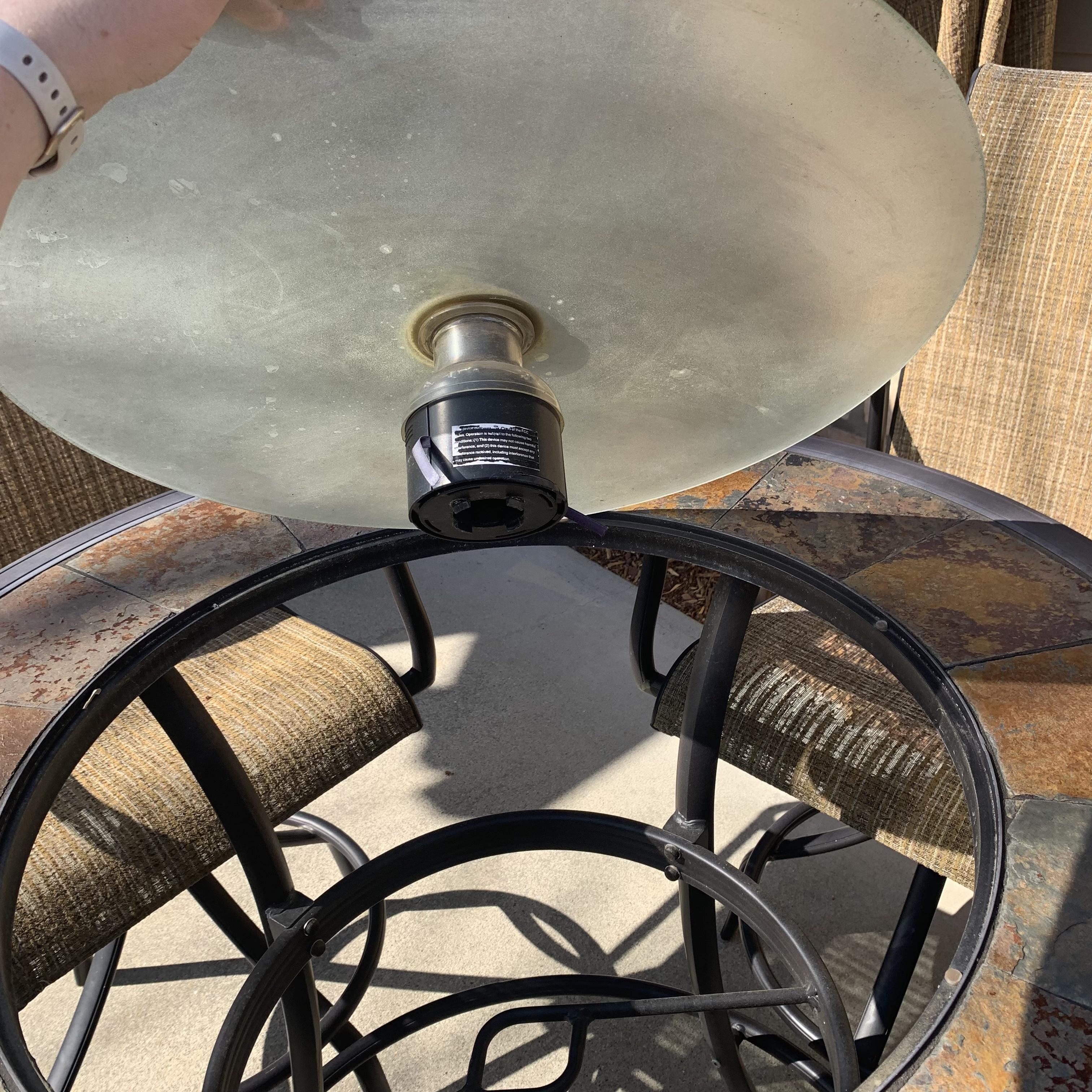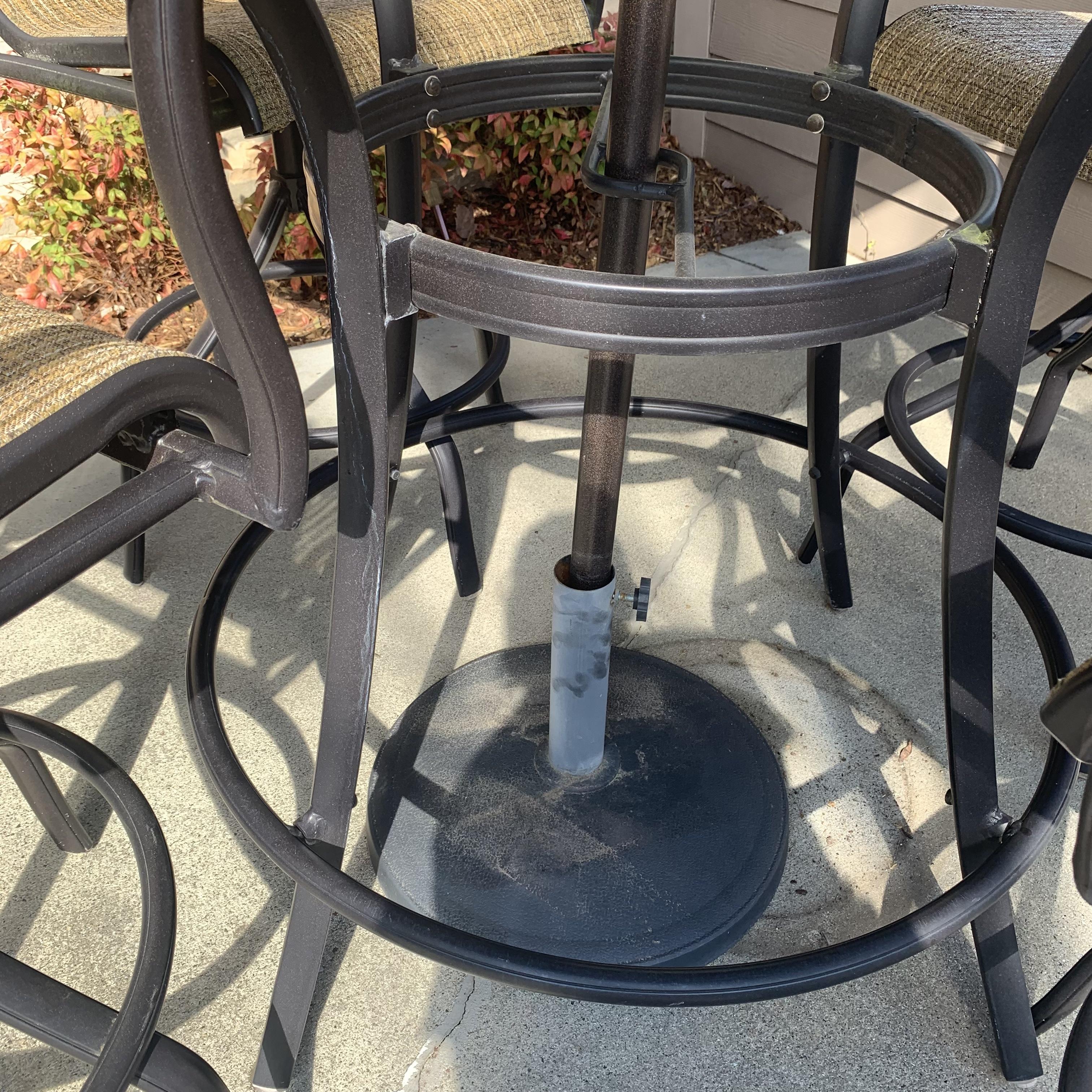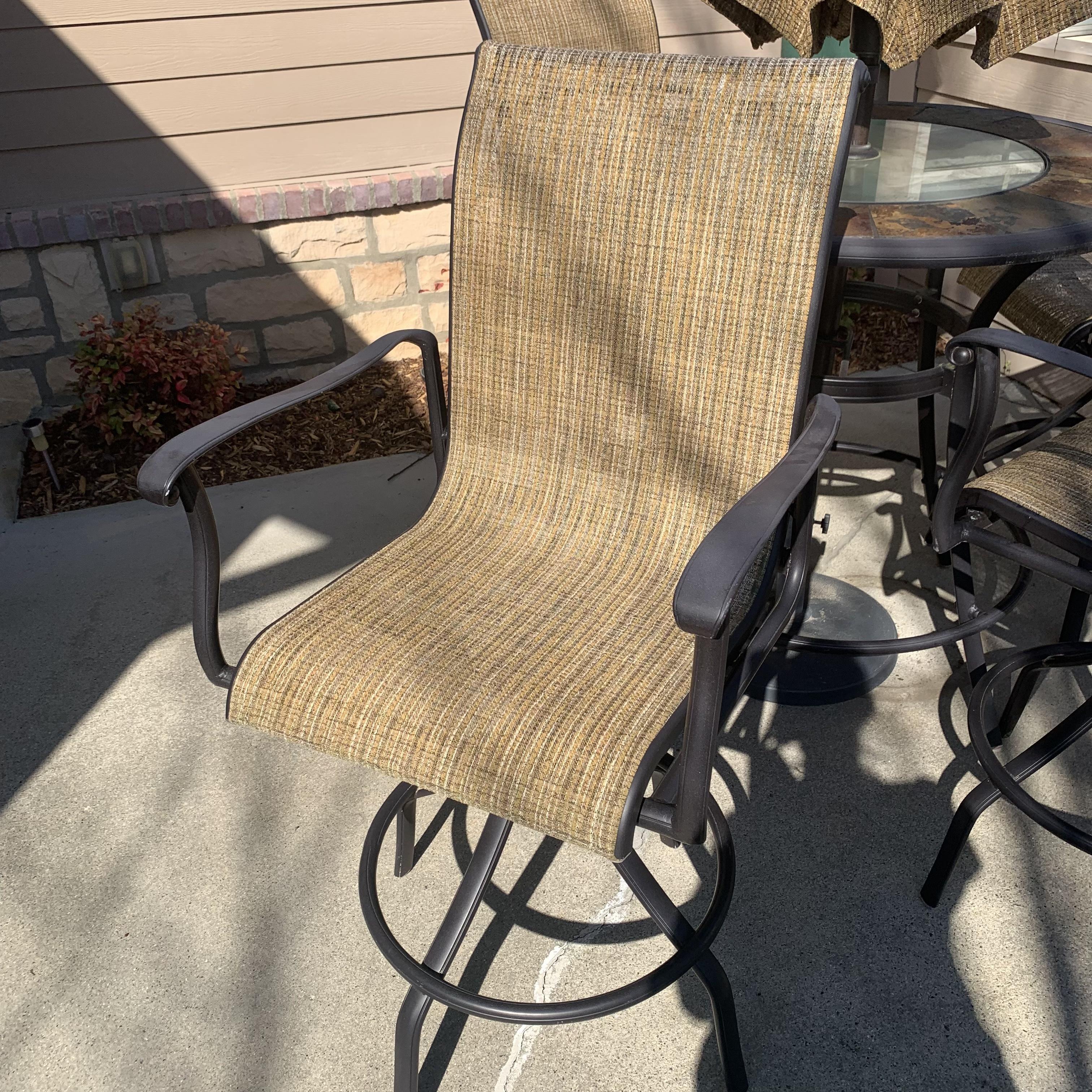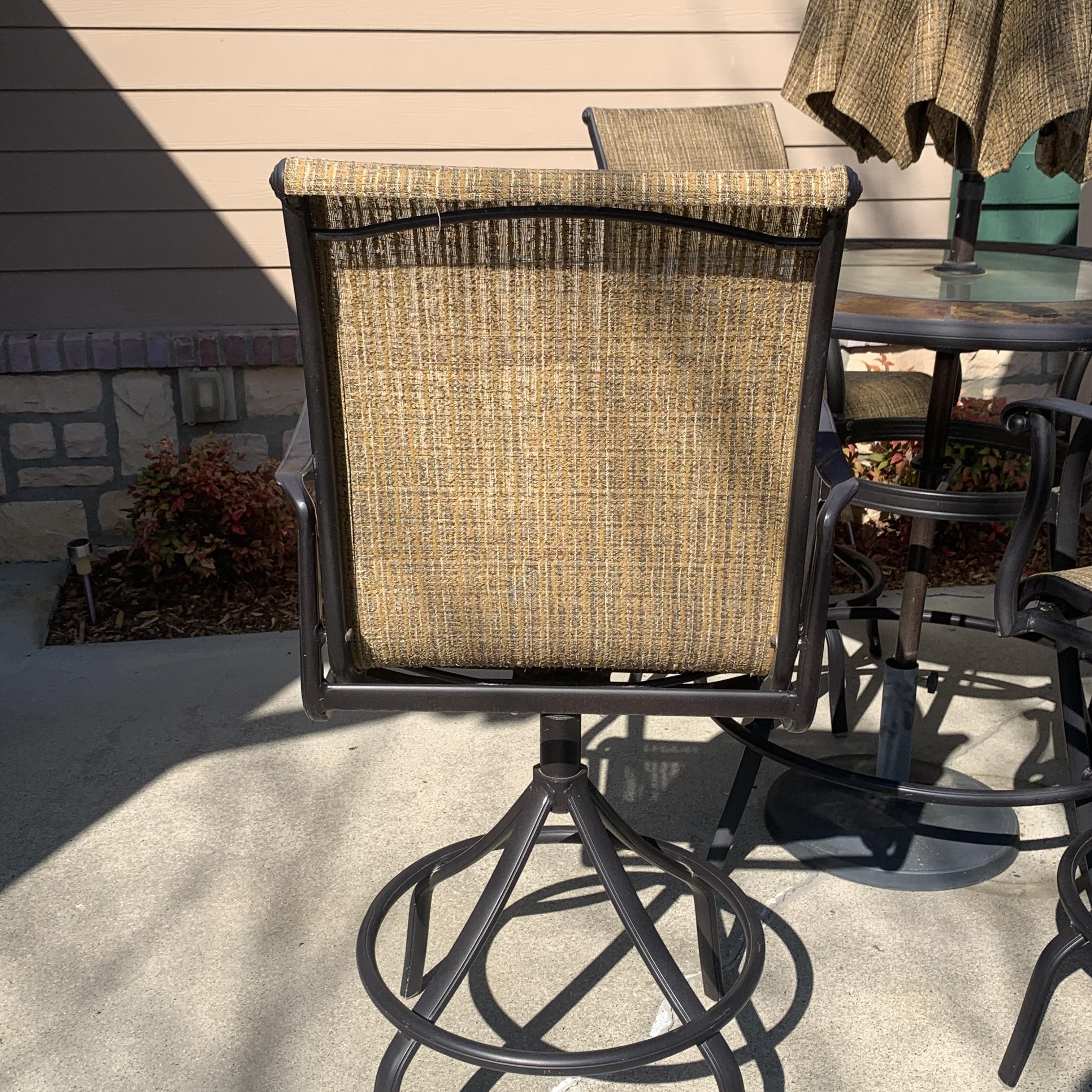Metal-based patio table with a stone and glass tabletop. Glass center is removable. It has a battery powered part which appears to power on small lights, but we are unable to test this. Tabletop measures 40”D and table is 39.5”H. Four swiveling chairs with metal bases and woven seats are included, as well as an umbrella that matches the chairs. Chairs are 25.5” x 21” x 41”H with a seat height of 28”. One seat has notable wear in the fabric; see photos. The umbrella opens and closes easily with a crank.