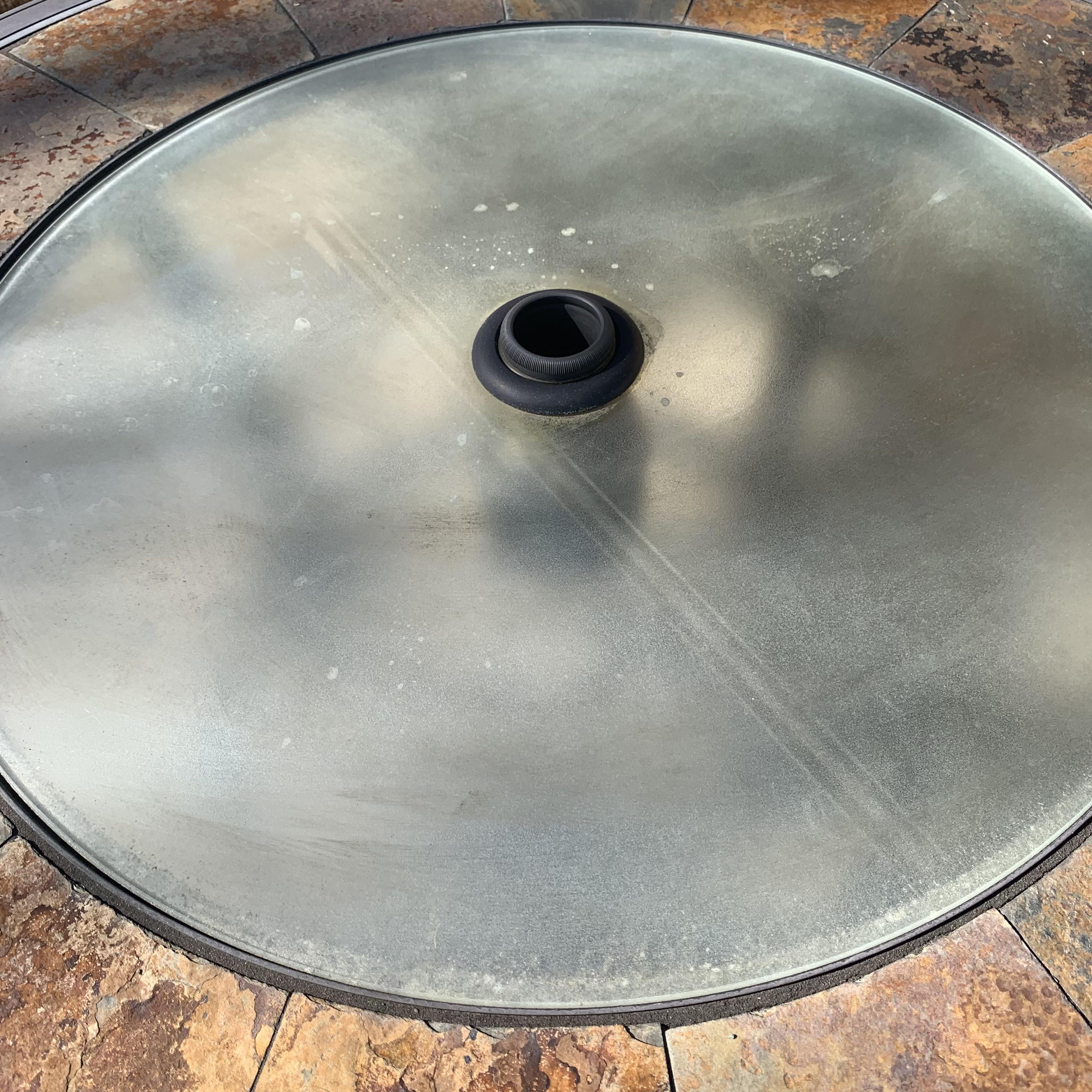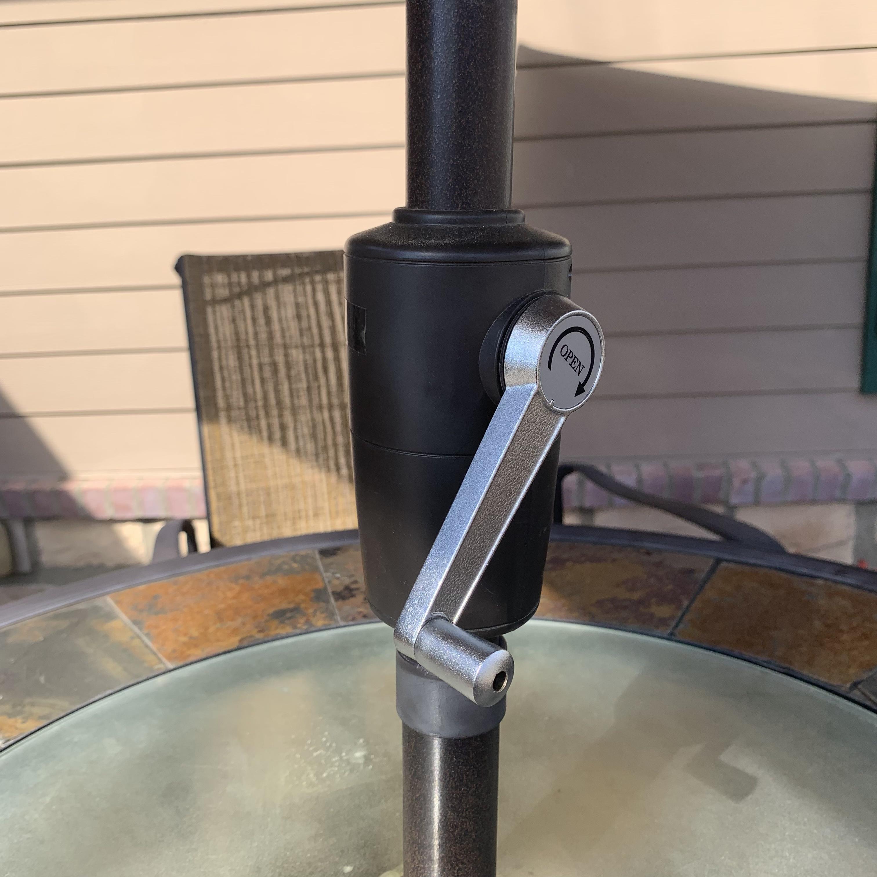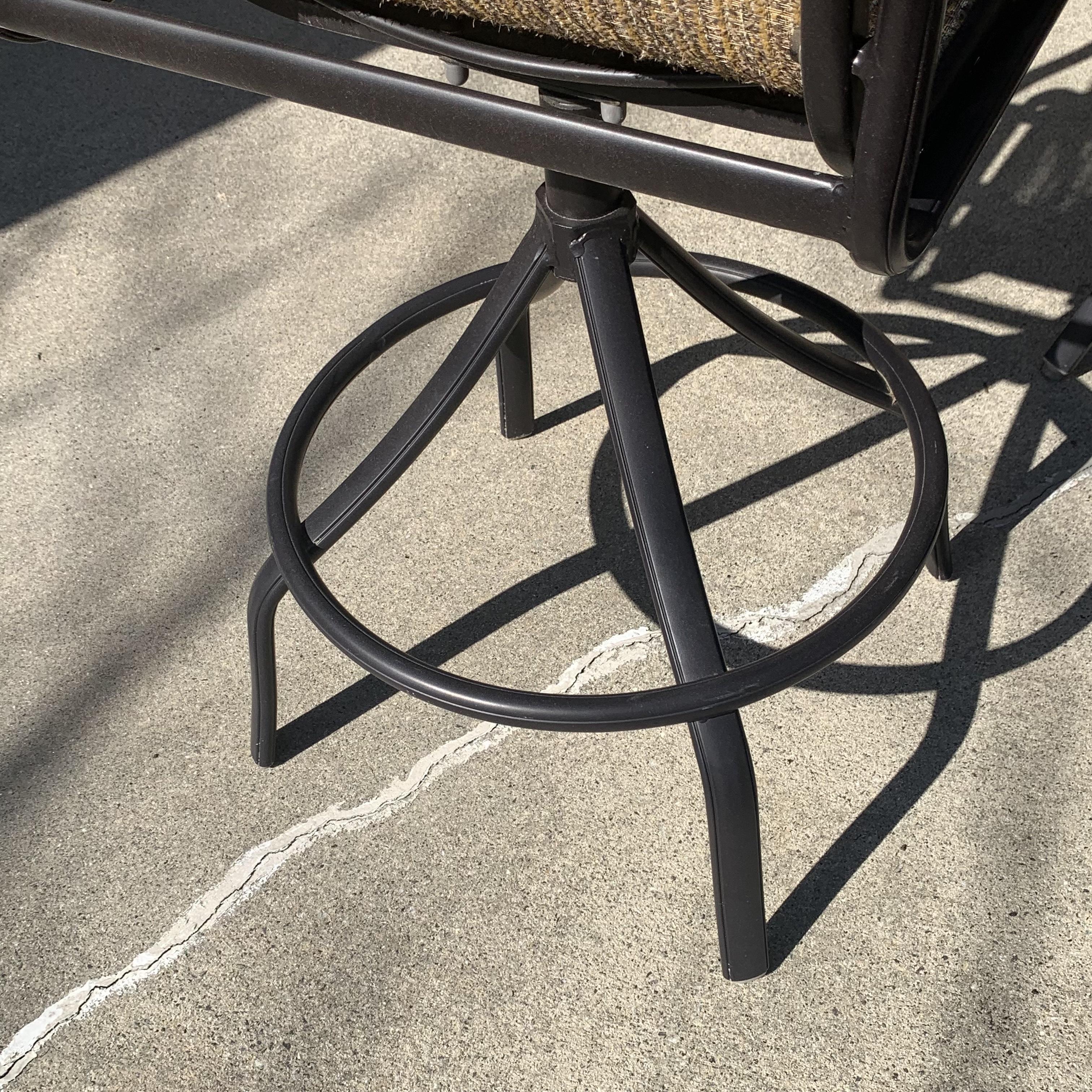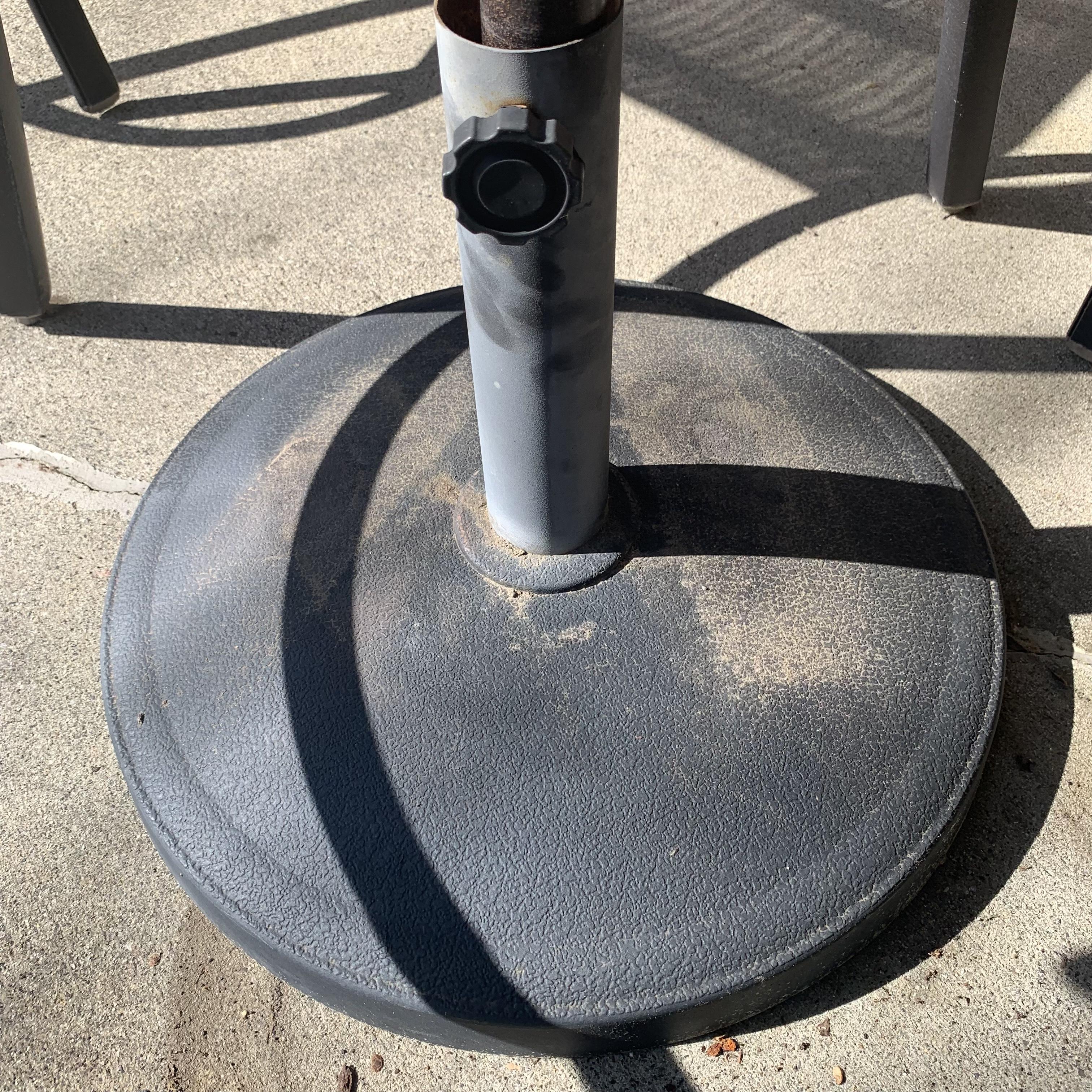 Metal-based patio table with a stone and glass tabletop. Glass center is removable. It has a battery powered part which appears to power on small lights, but we are unable to test this. Tabletop measures 40”D and table is 39.5”H. Four swiveling chairs with metal bases and woven seats are included, as well as an umbrella that matches the chairs. Chairs are 25.5” x 21” x 41”H with a seat height of 28”. One seat has notable wear in the fabric; see photos. The umbrella opens and closes easily with a crank.