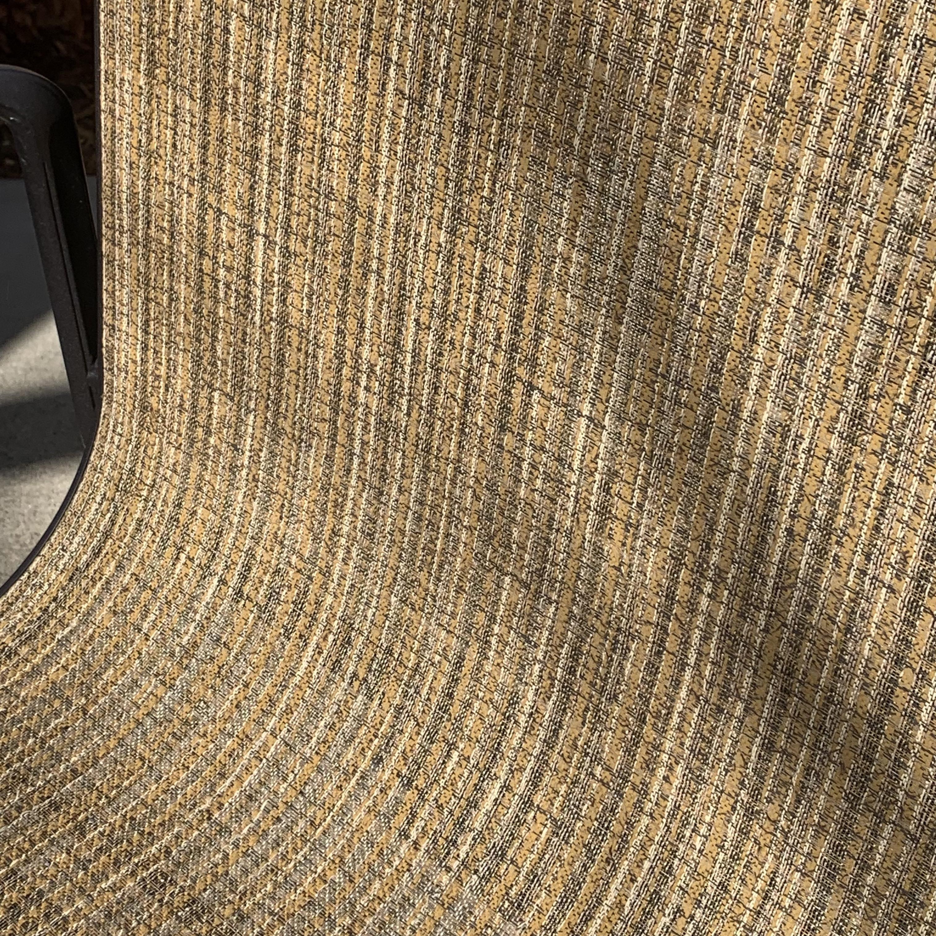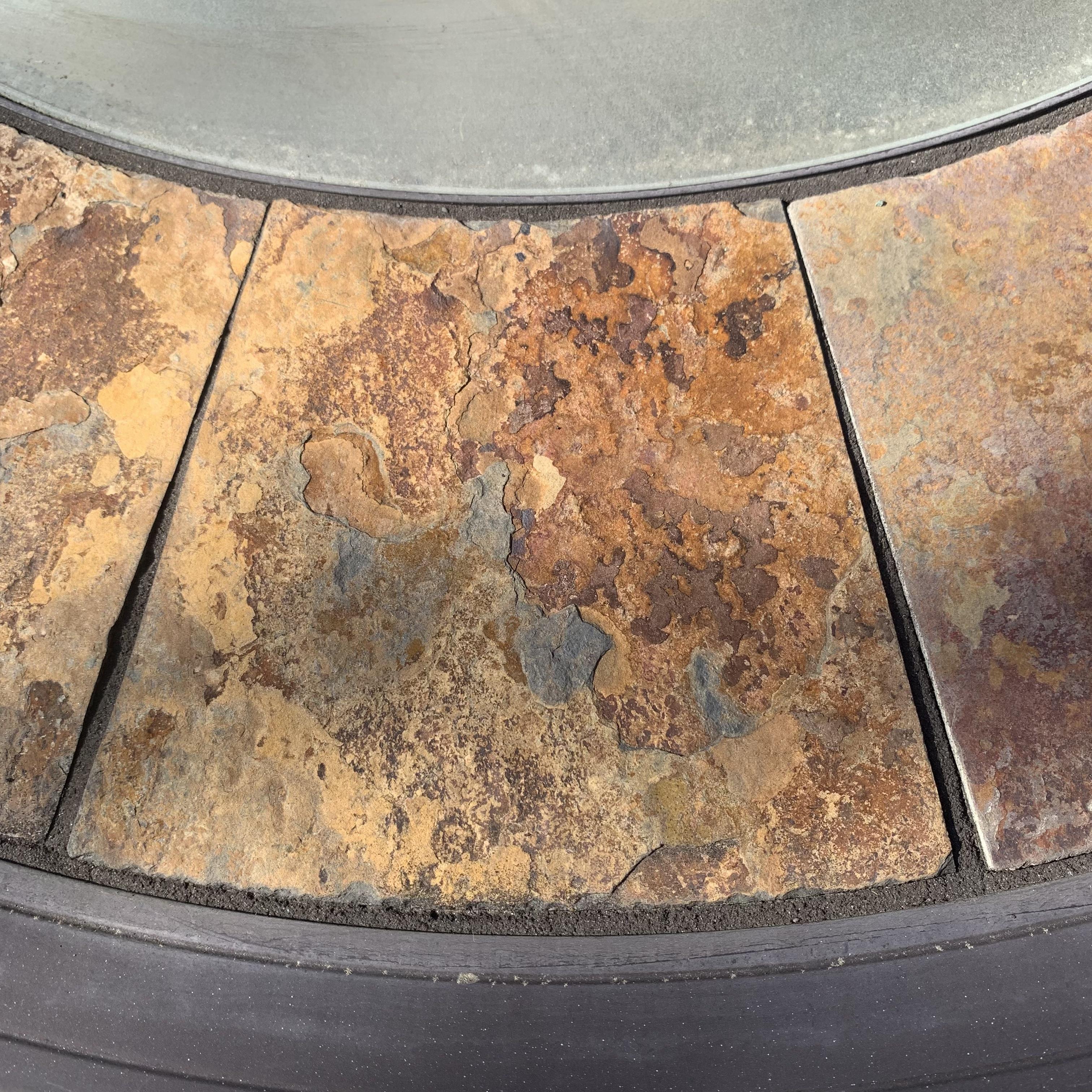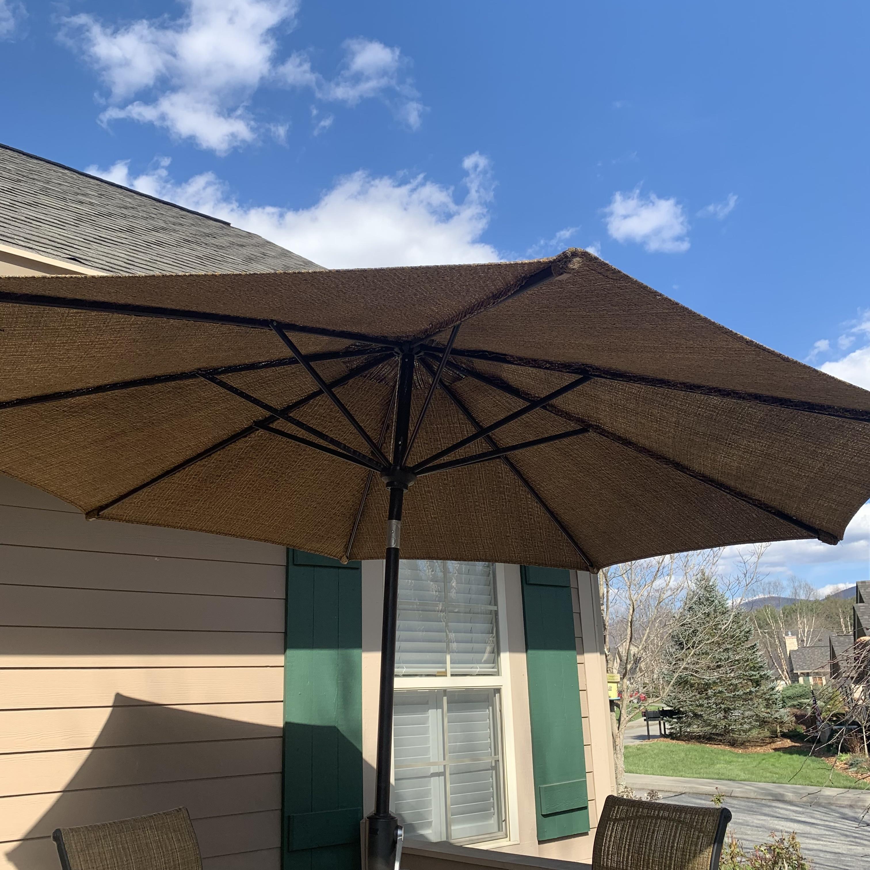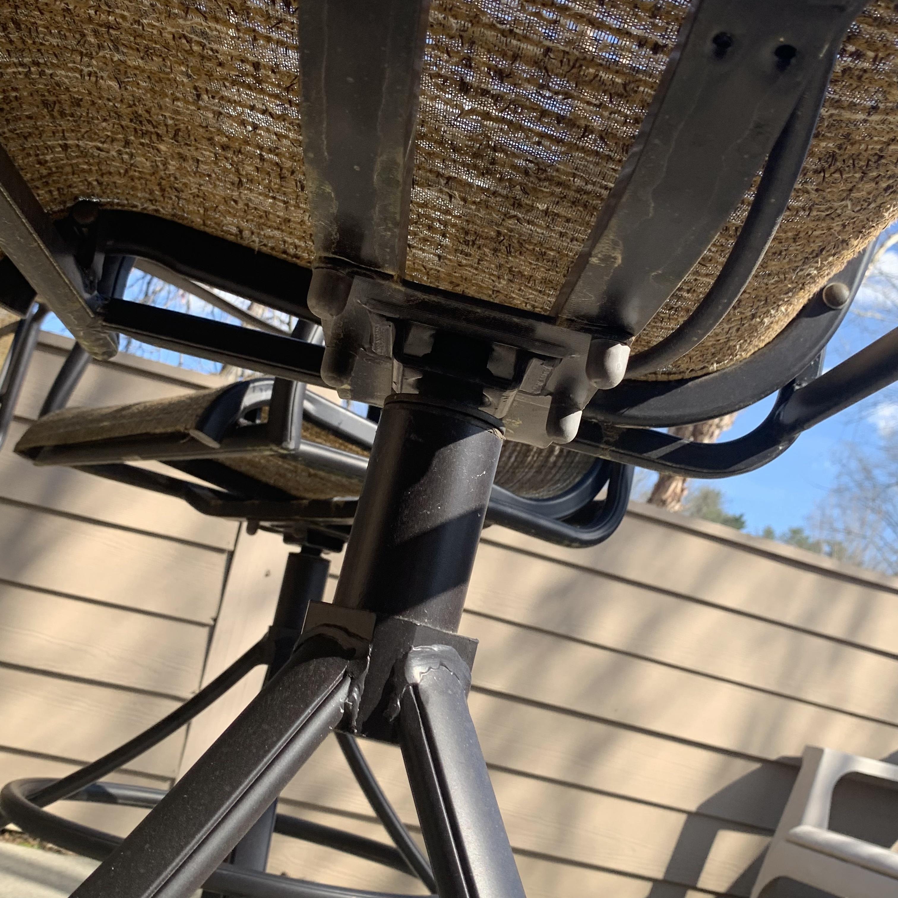 Metal-based patio table with a stone and glass tabletop. Glass center is removable. It has a battery powered part which appears to power on small lights, but we are unable to test this. Tabletop measures 40”D and table is 39.5”H. Four swiveling chairs with metal bases and woven seats are included, as well as an umbrella that matches the chairs. Chairs are 25.5” x 21” x 41”H with a seat height of 28”. One seat has notable wear in the fabric; see photos. The umbrella opens and closes easily with a crank.