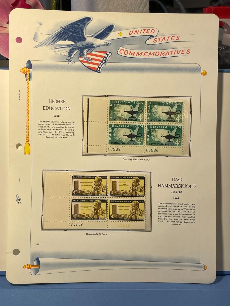Higher Education & Dag Hammarskjold 1962 Mint Condition US Stamp Plate Blocks Page as Pictured. Only One $5 Shipping Charge for 1 or 100 Pages Won.