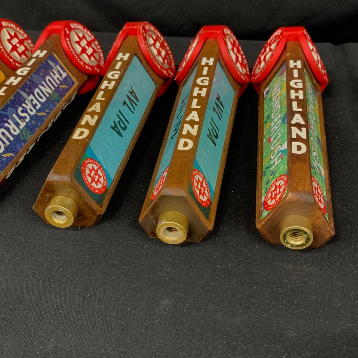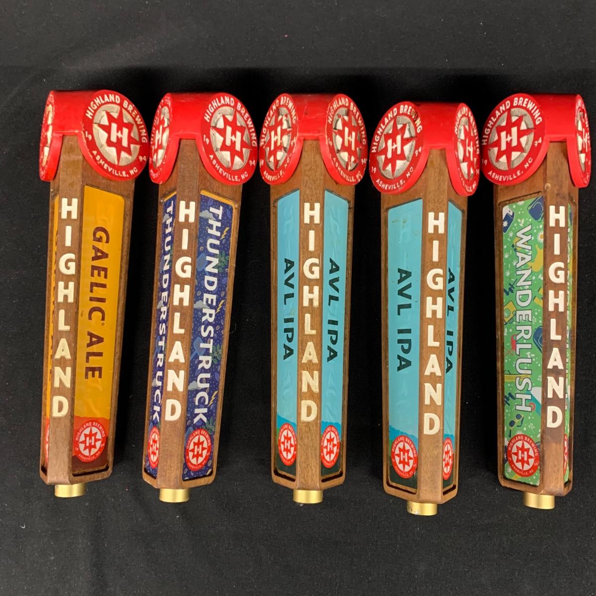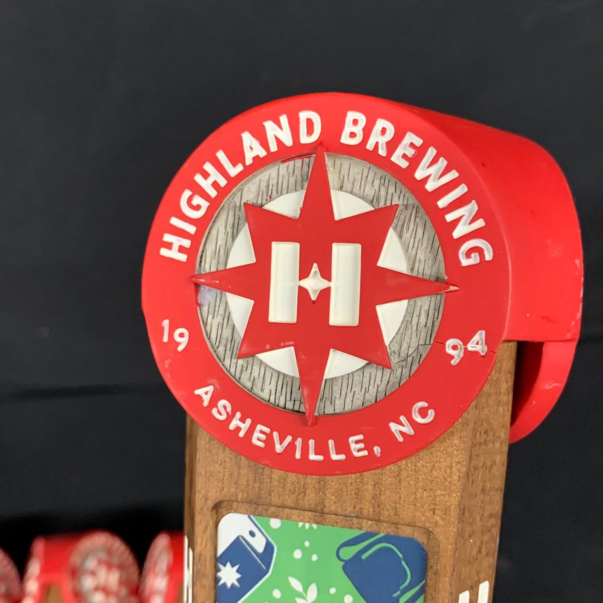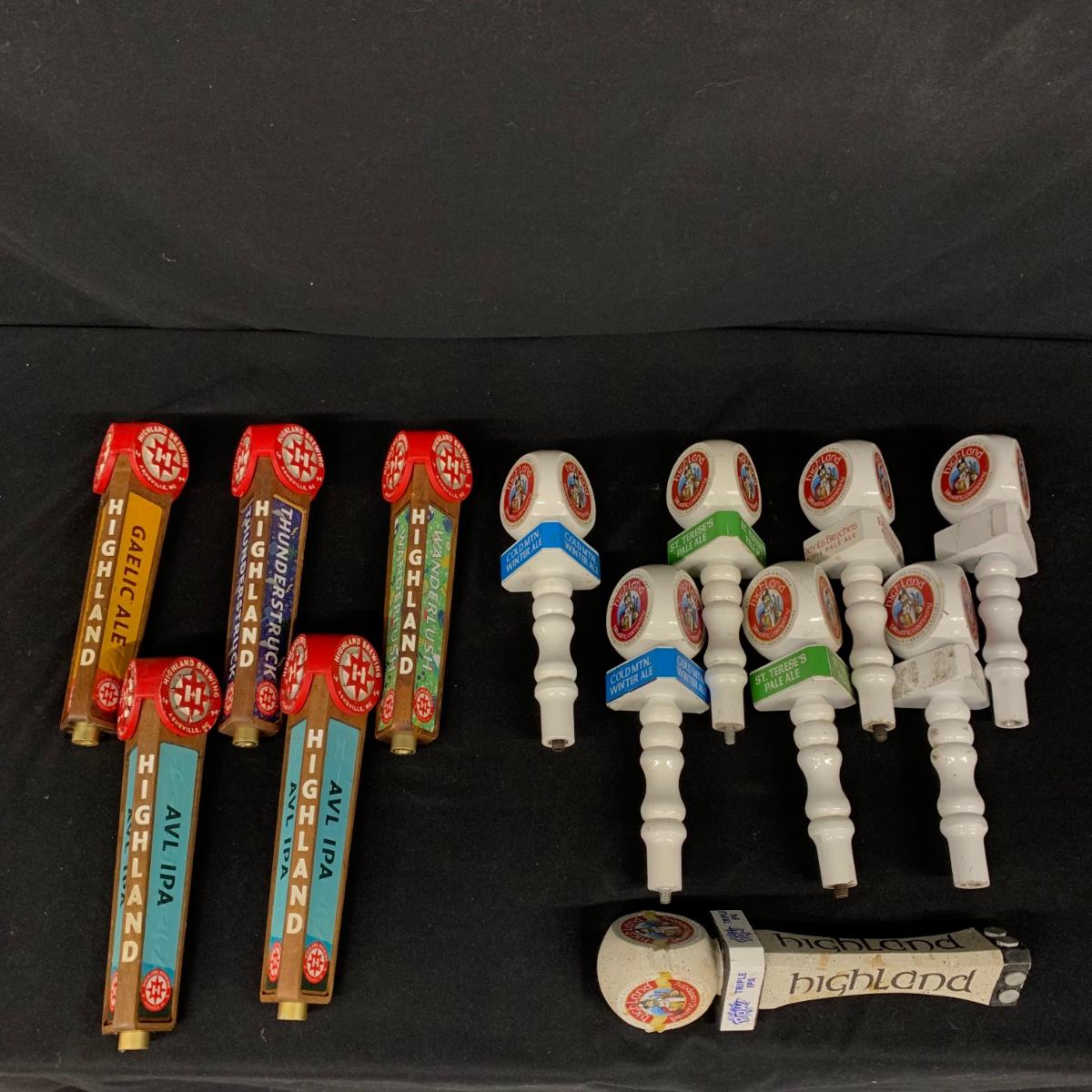 Thirteen Highland Brewing Company taps made of wood are included in this lot. Three different styles and multiple varieties of beer. All are used. Some are a bit dusty and at least one has some chipping in the paint. Taps measure approximately 3" x 10" Shipping available.