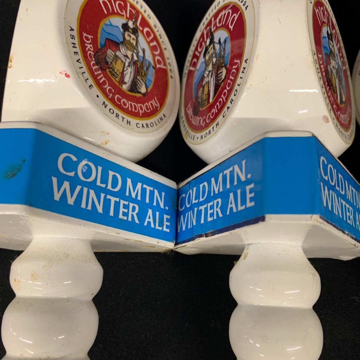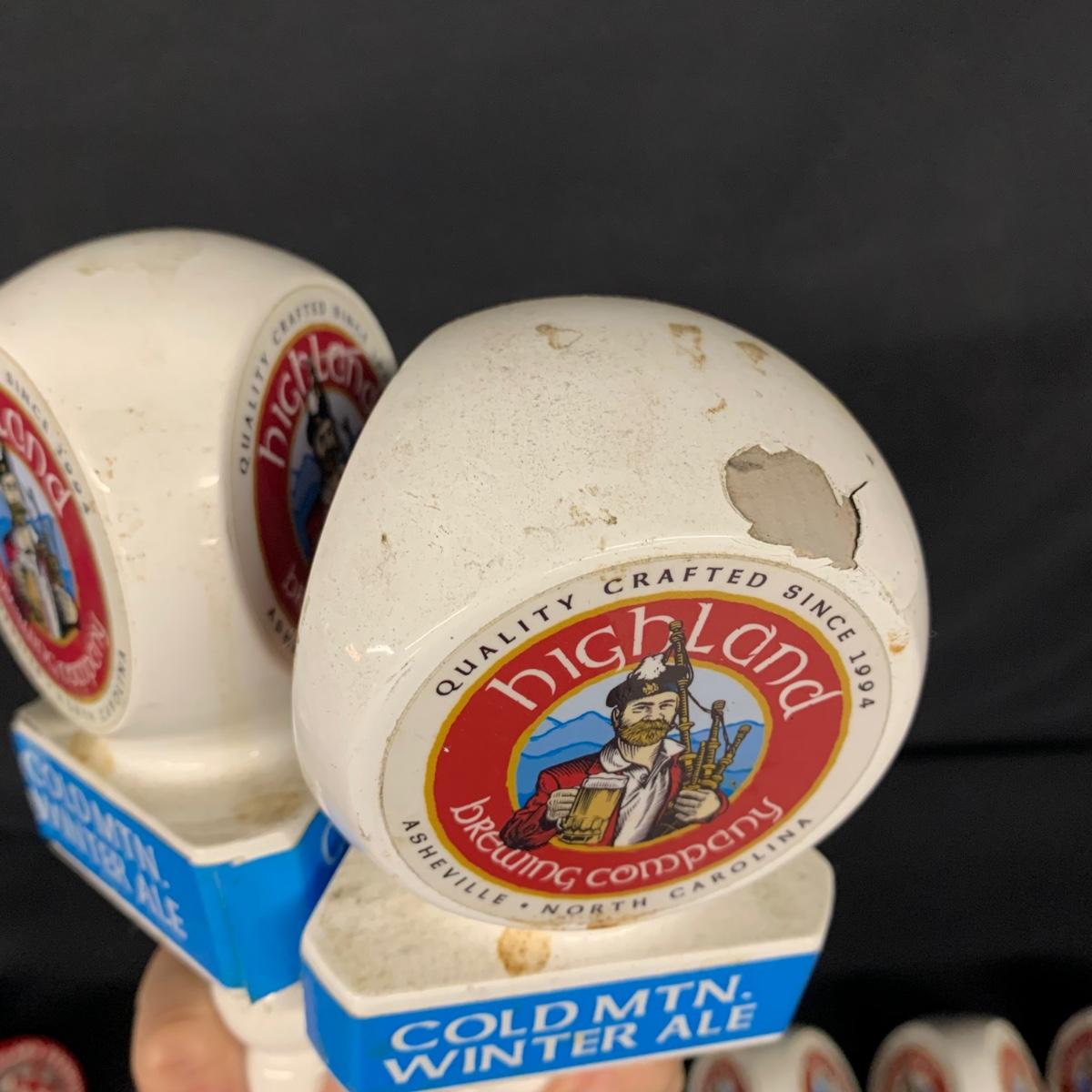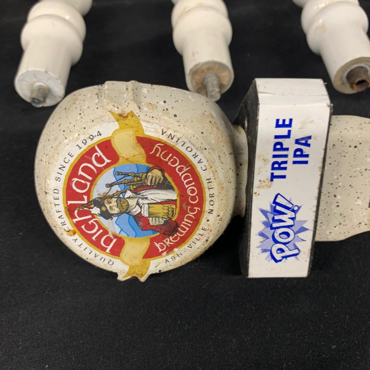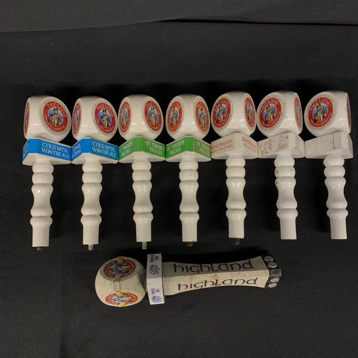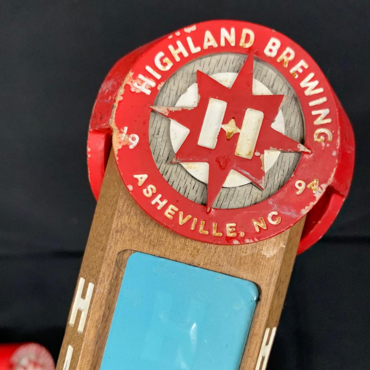 Thirteen Highland Brewing Company taps made of wood are included in this lot. Three different styles and multiple varieties of beer. All are used. Some are a bit dusty and at least one has some chipping in the paint. Taps measure approximately 3" x 10" Shipping available.
