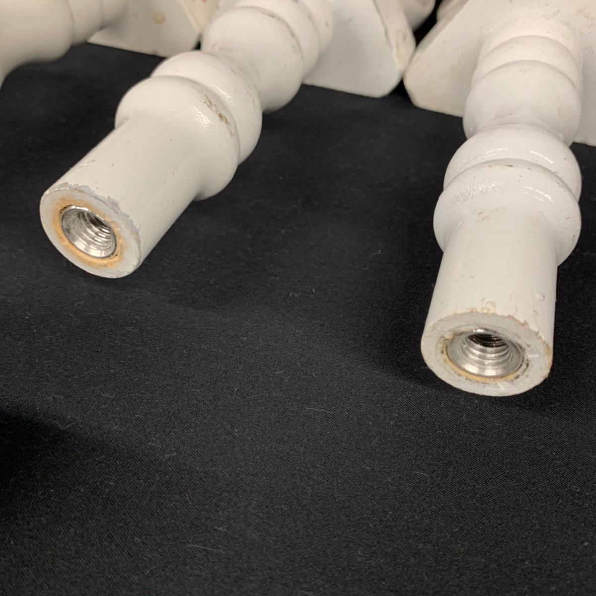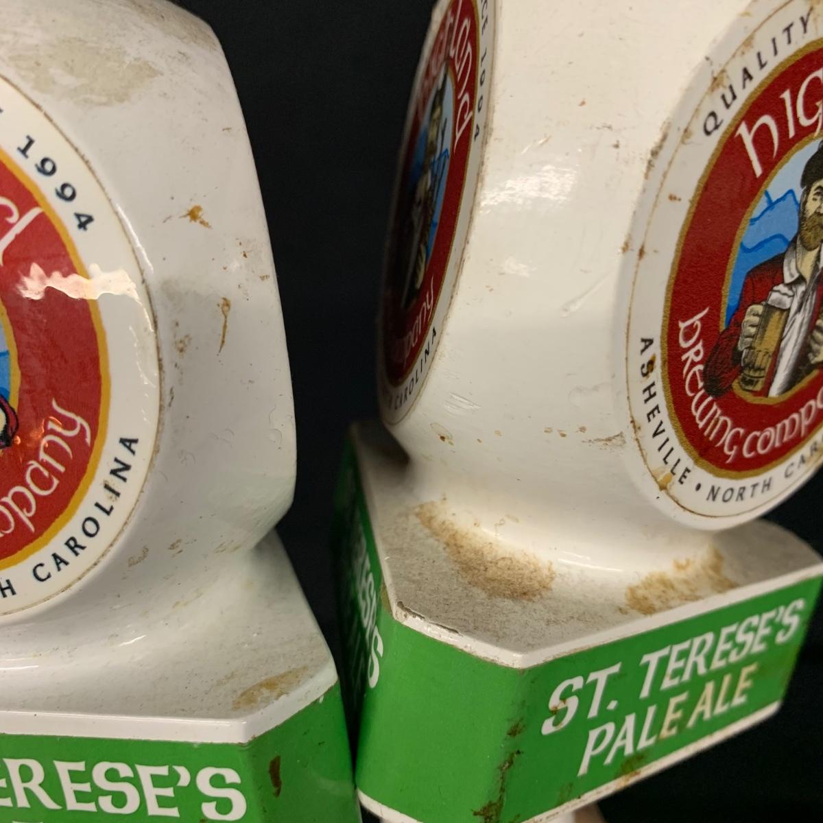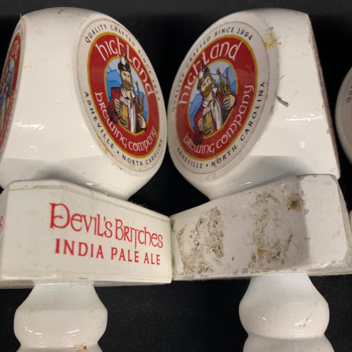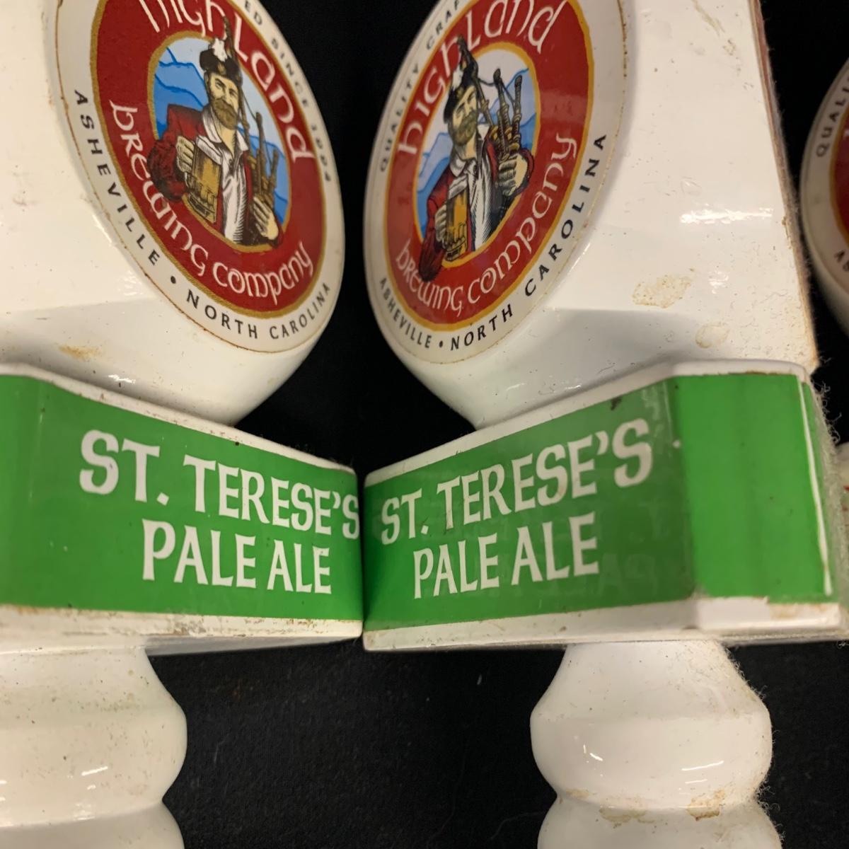 Thirteen Highland Brewing Company taps made of wood are included in this lot. Three different styles and multiple varieties of beer. All are used. Some are a bit dusty and at least one has some chipping in the paint. Taps measure approximately 3" x 10" Shipping available.