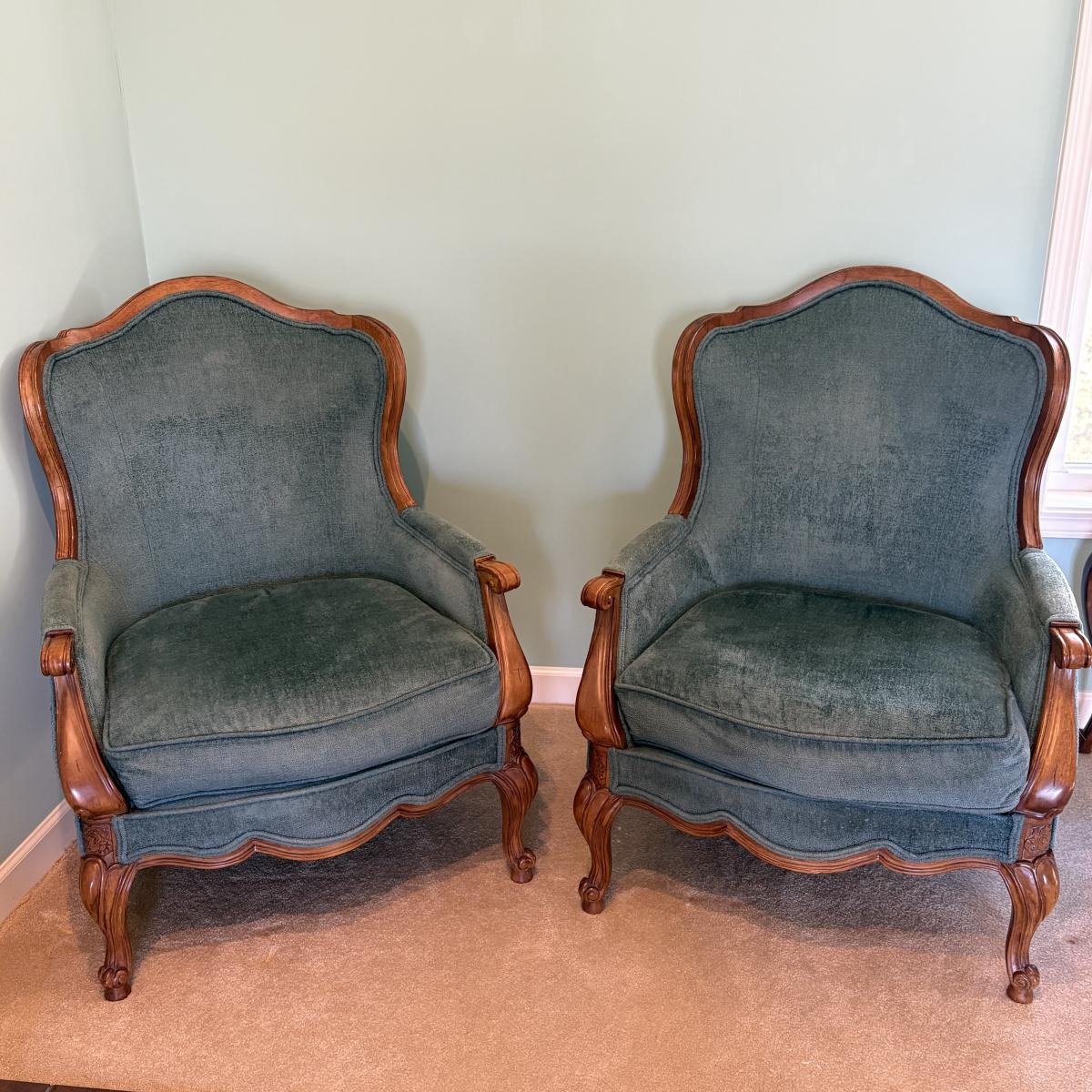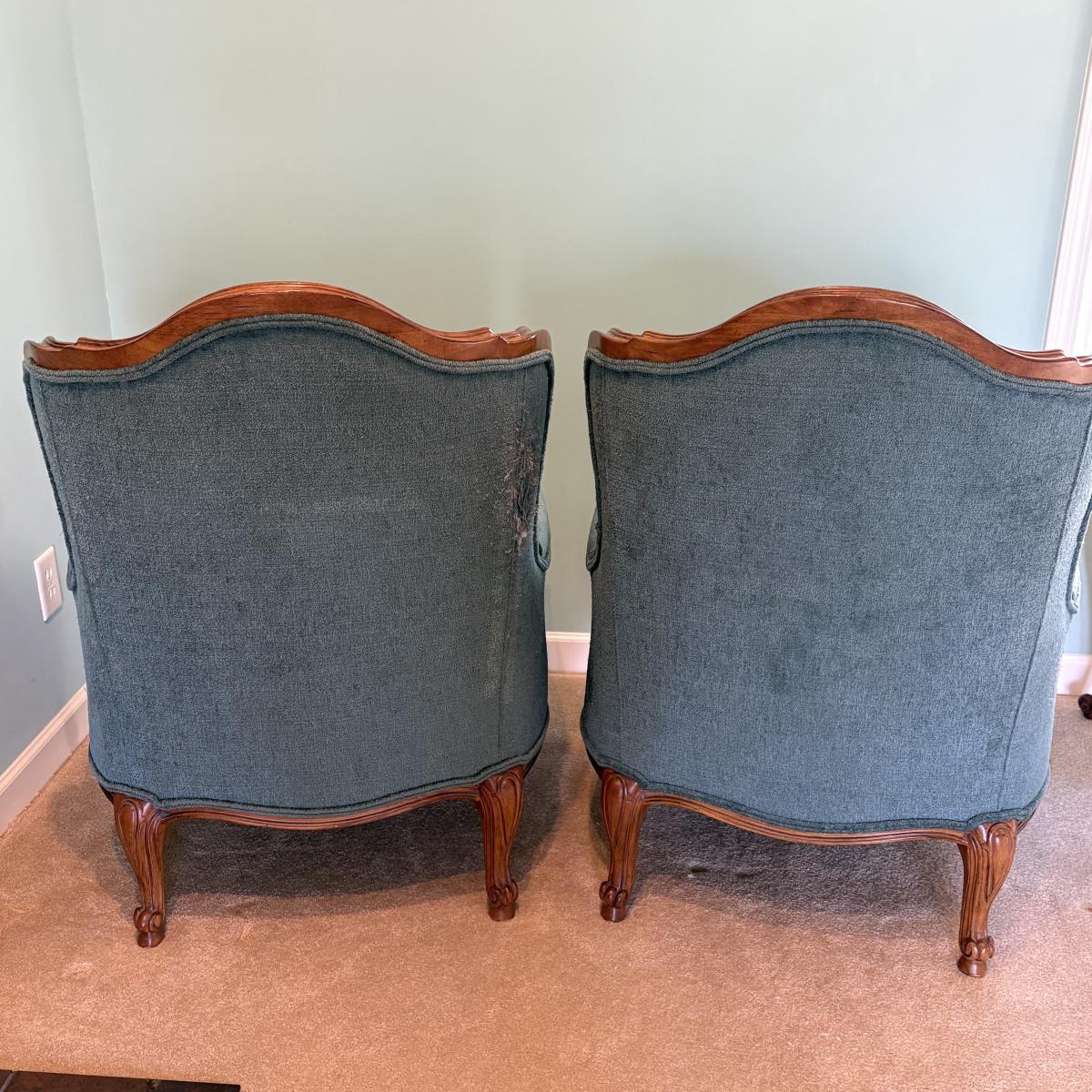 This set of two matching Highland House teal upholstered arm chairs comes with four matching teal pillows. The measurements of the chairs are approximately 29" x 23" x 40"H with a seat height or 18".