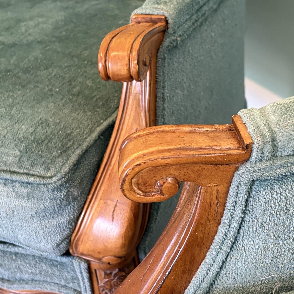 The chairs come from a house with a cat and there is one chair that has cat scratch damage (see pictures for reference). An extra roll of matching upholstery fabric is included in the lot.