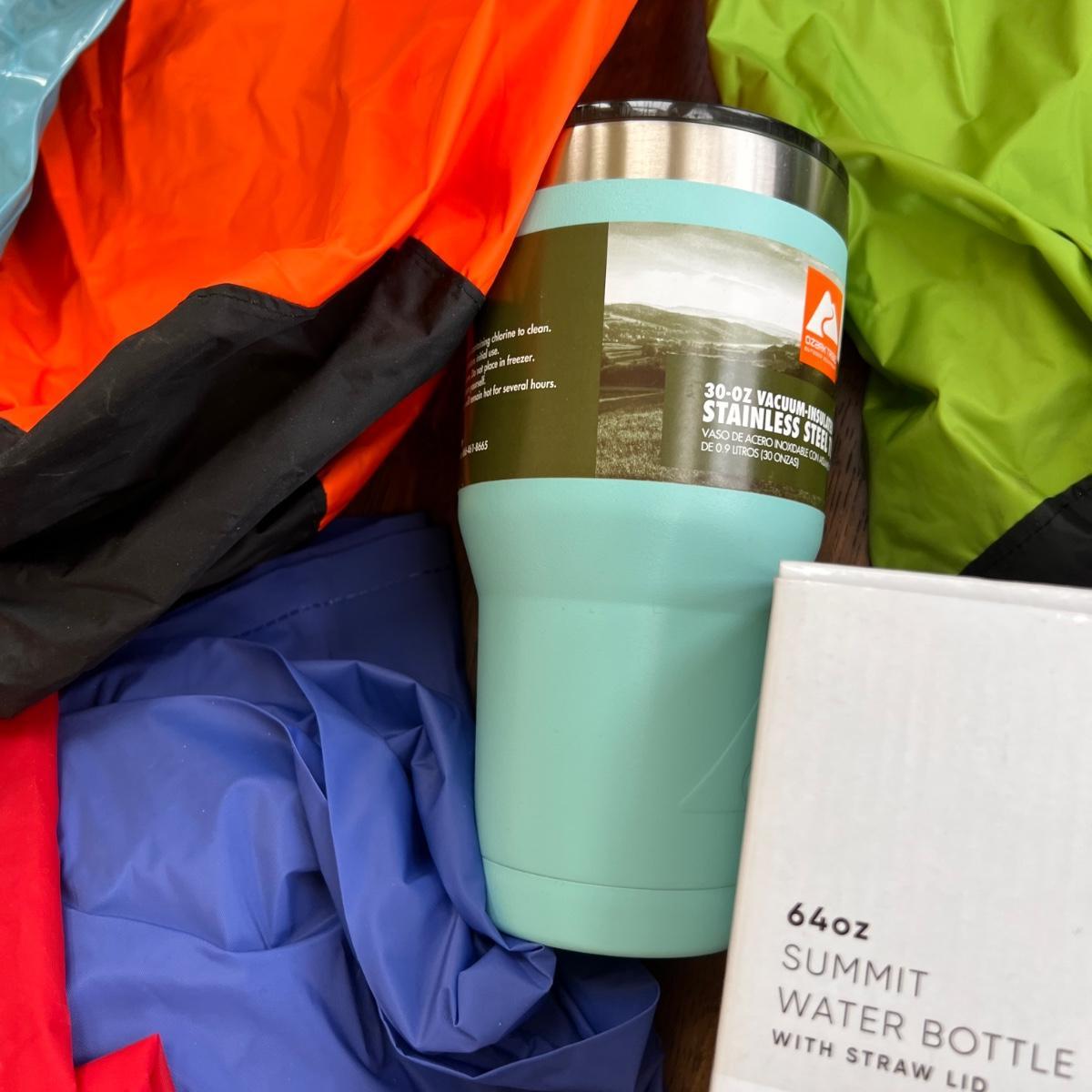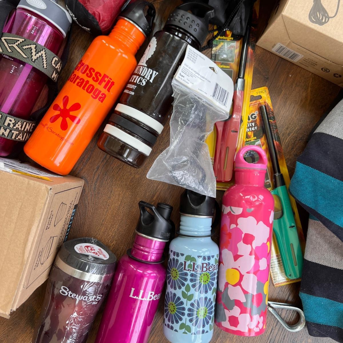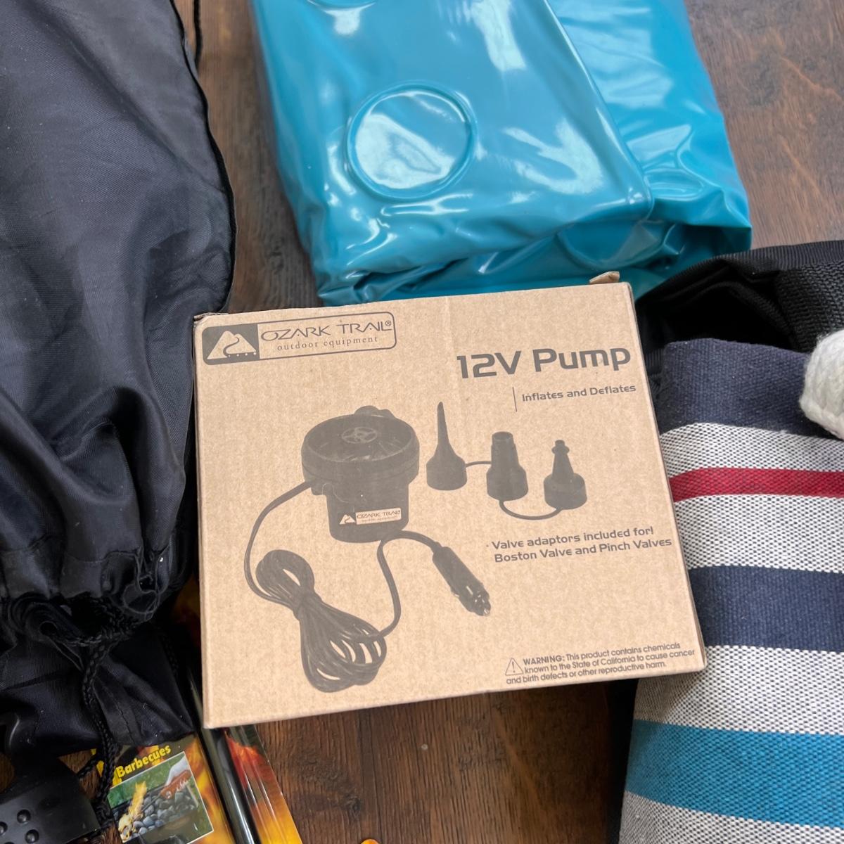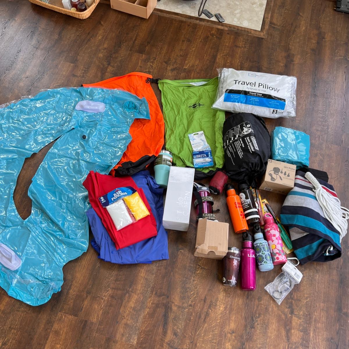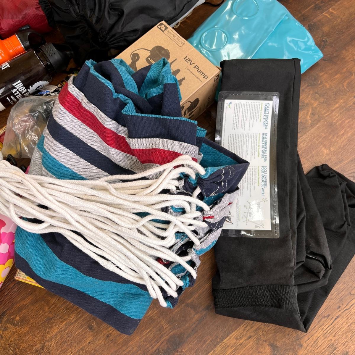 Big lot of camping travel items including a queen size air mattress, air pump, travel pillow, inflatable lounge pool chair, rain ponchos, tumblers (some new) and filters. Note: hammock does not come with frame poles.