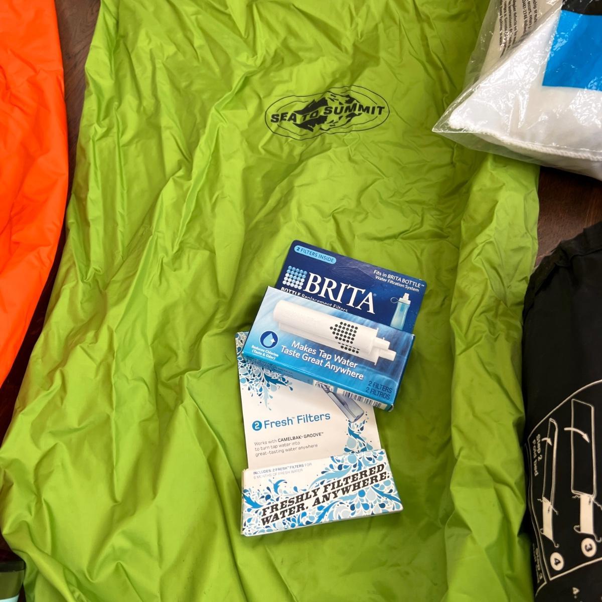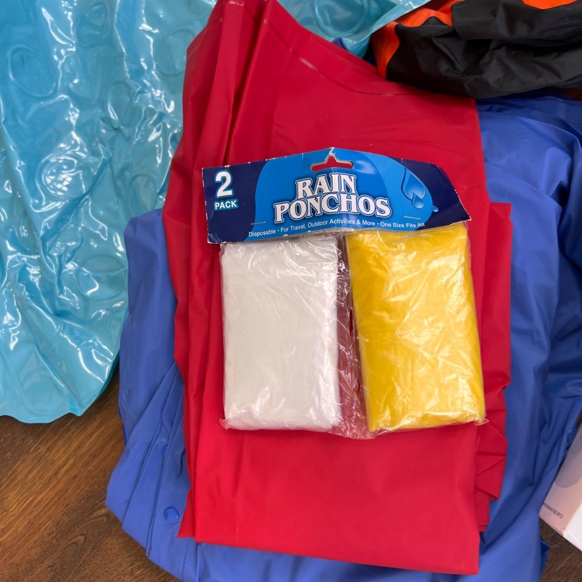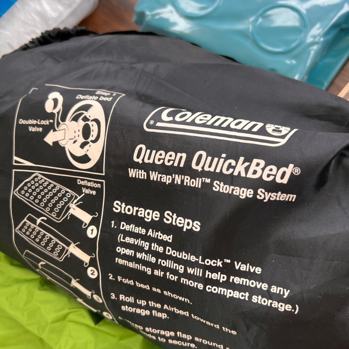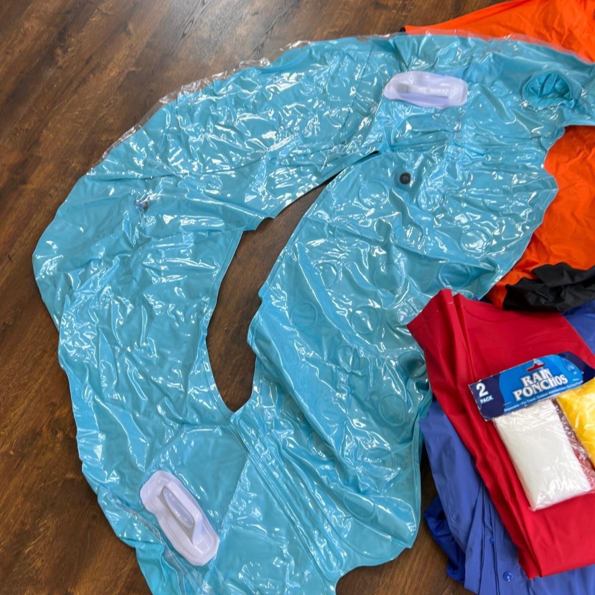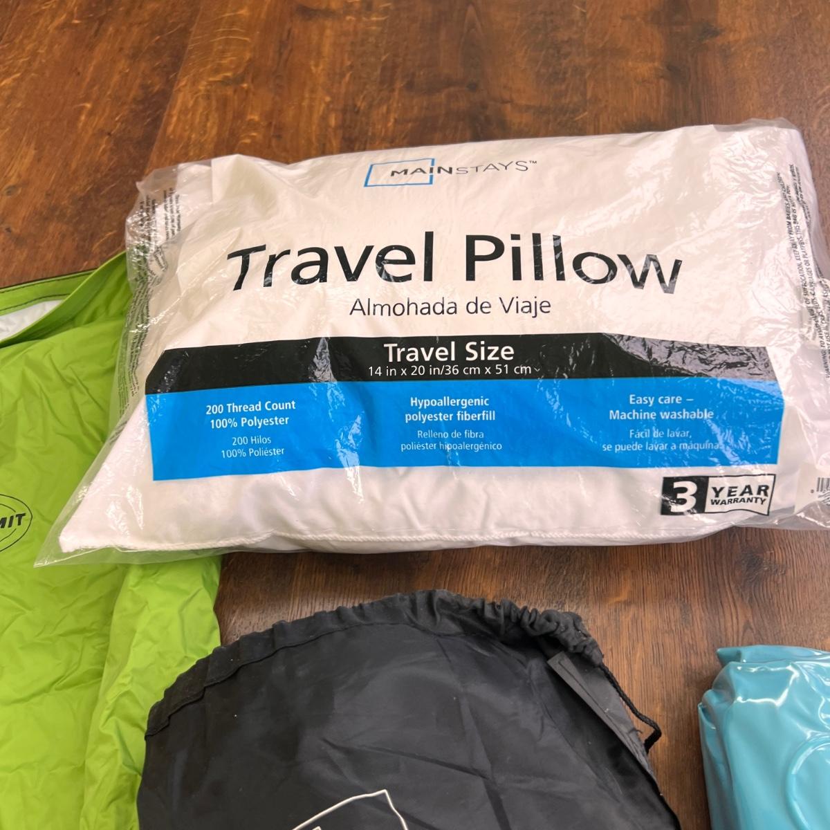 Big lot of camping travel items including a queen size air mattress, air pump, travel pillow, inflatable lounge pool chair, rain ponchos, tumblers (some new) and filters. Note: hammock does not come with frame poles.