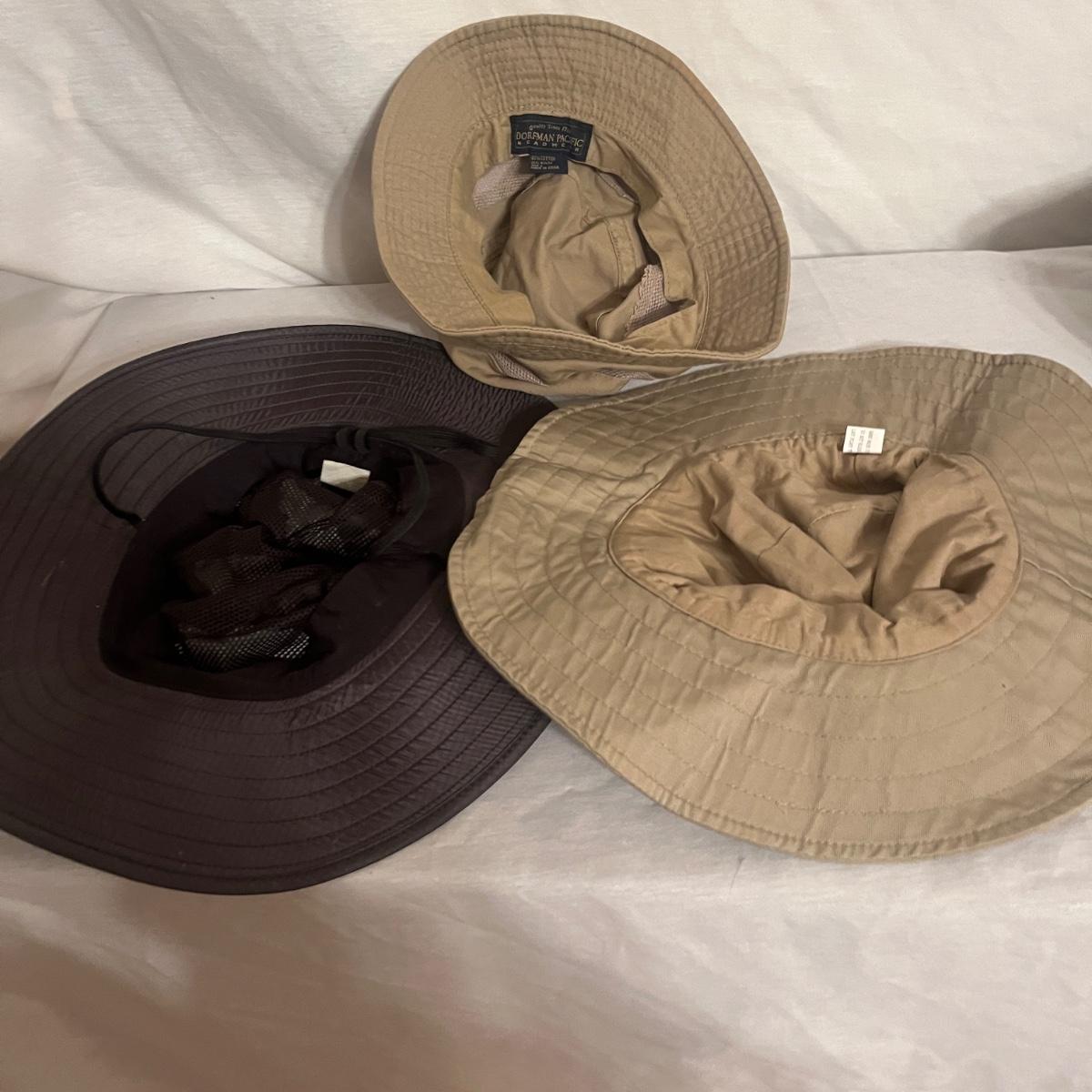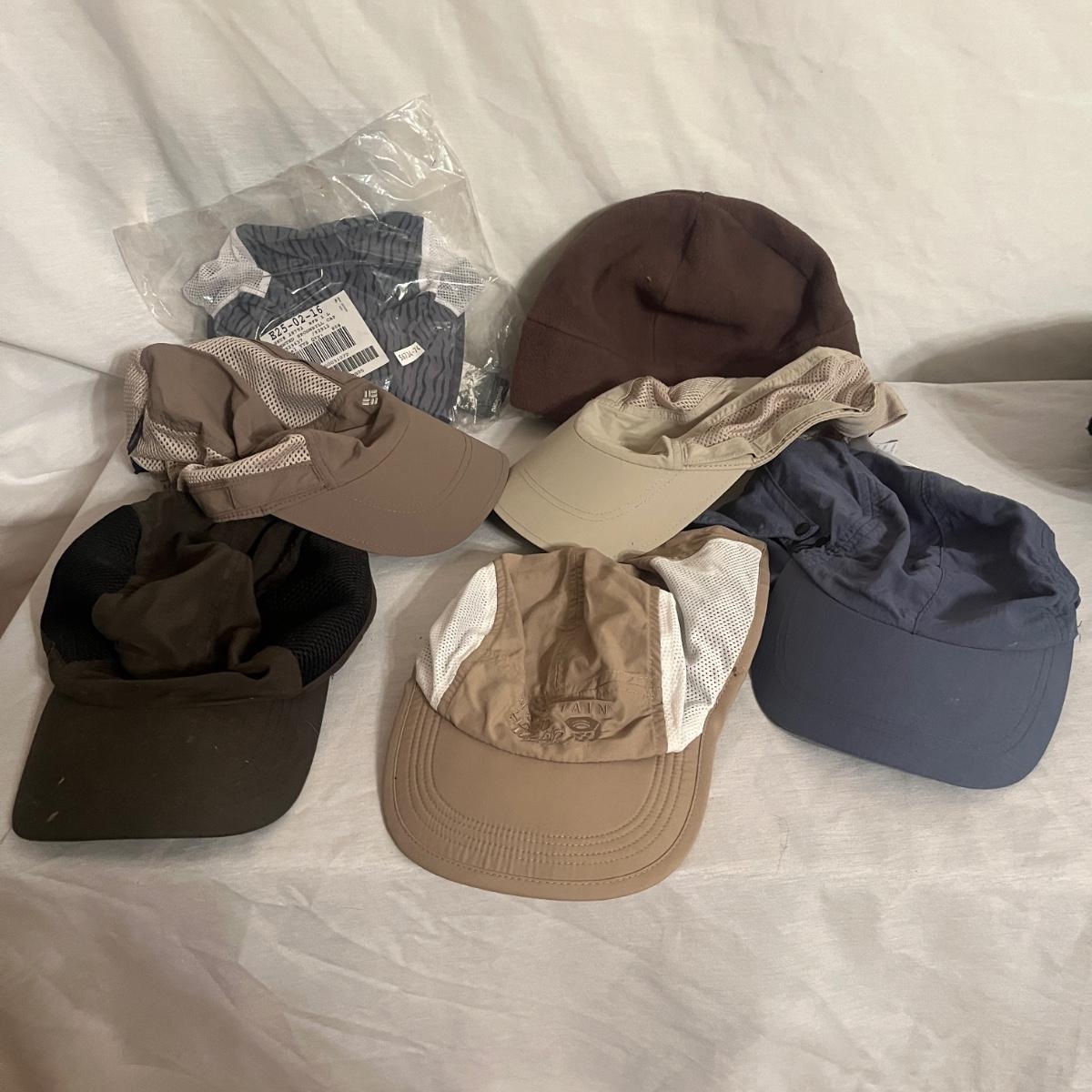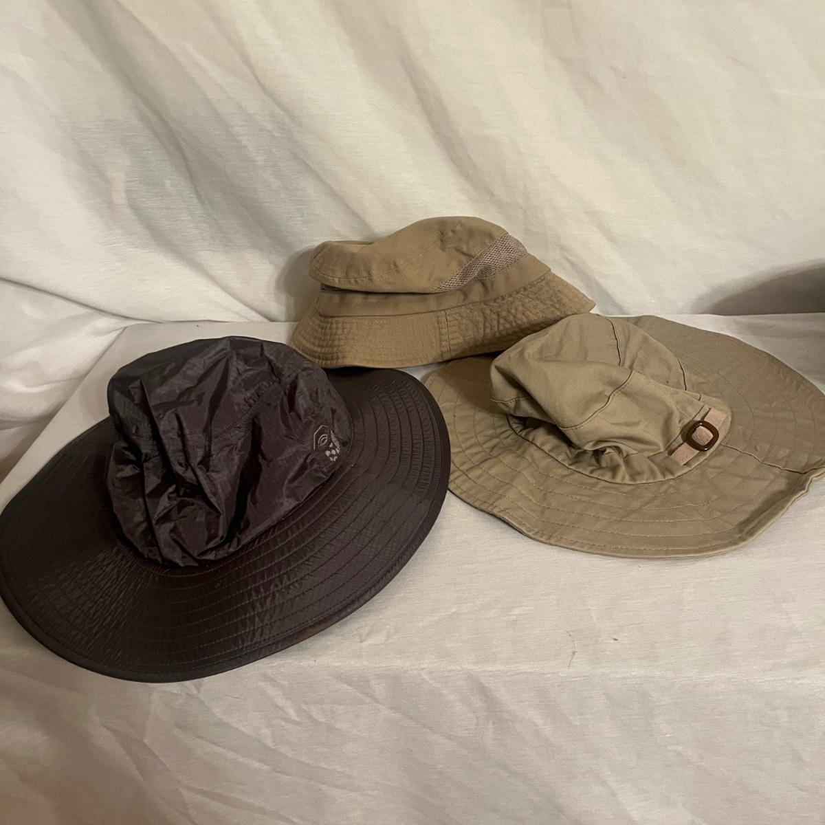 Lot includes two pairs waterproof trousers size medium, two sun hats, bucket hat, Merrell size ten women’s hiking shoes, pair of mittens, small backpack, Alpenlite small bag, spoonbill hats and a beanie hat.