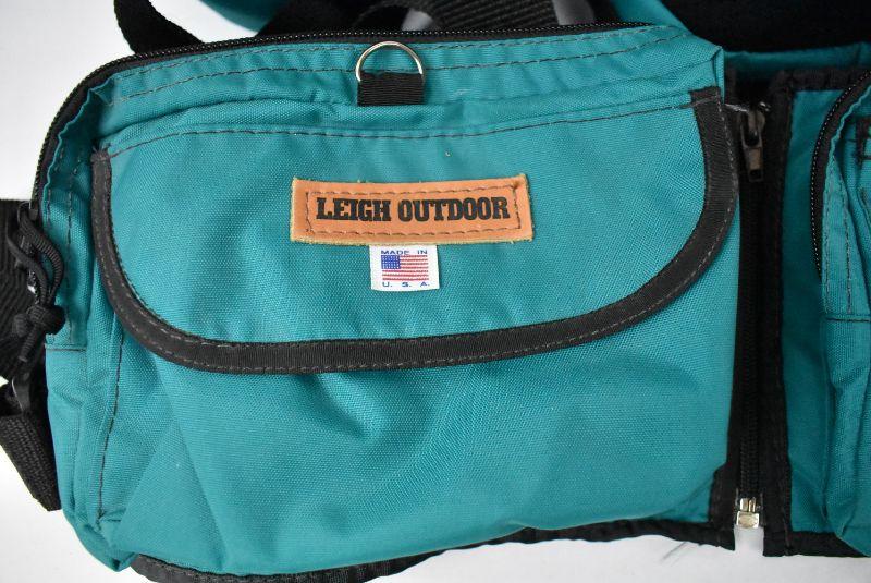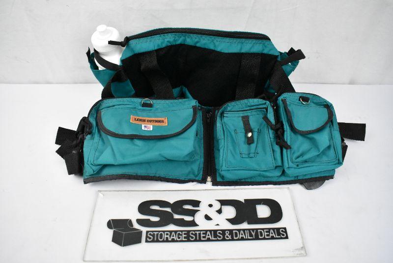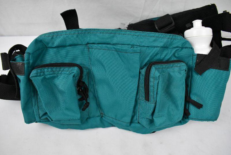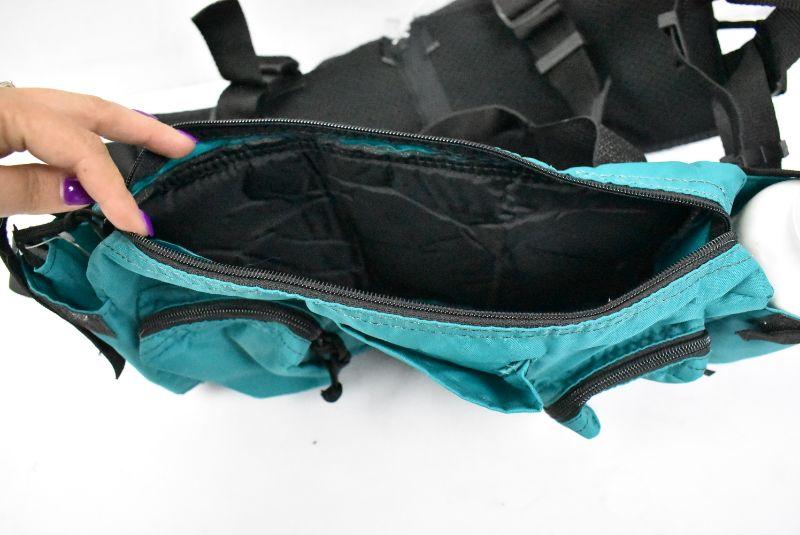 Hiking Gear Waist Pack with 12 compartments & water bottle. Teal & Black. Clean