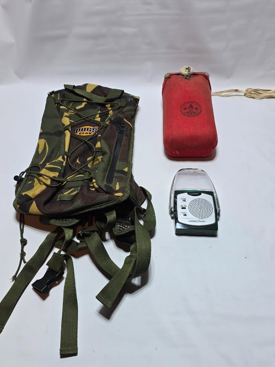 Hiking Starter kit - Pugs gear Camo Backpack - Vintage Boy scout BSA canteen - and an emergency radio