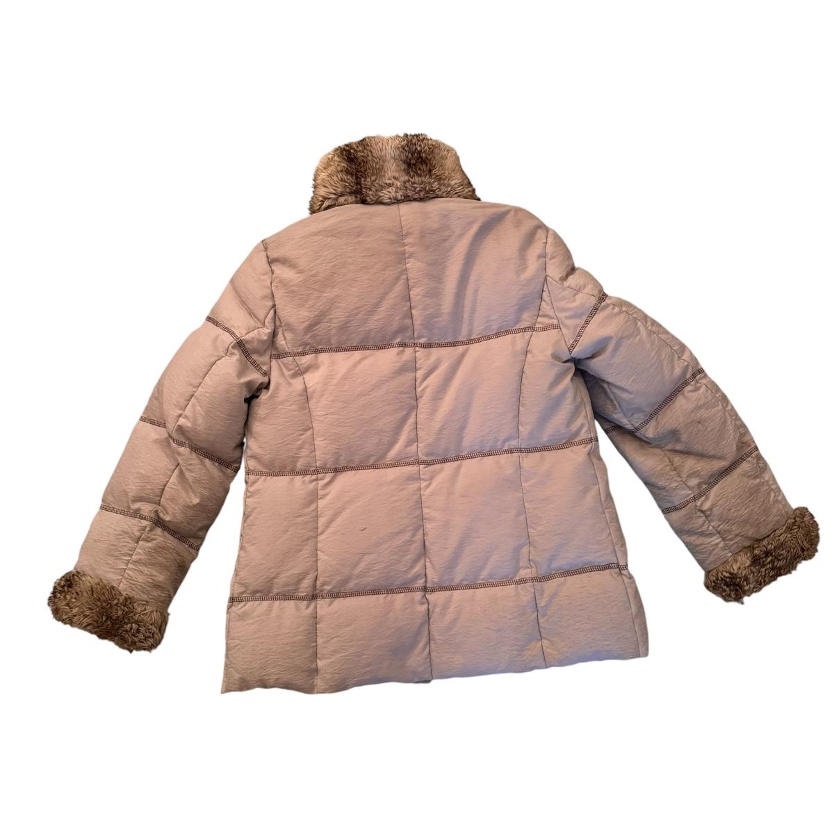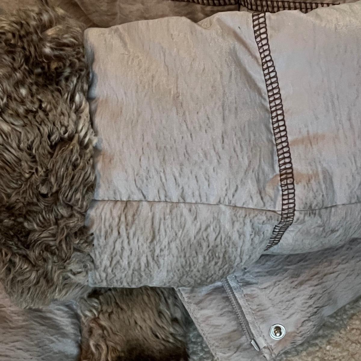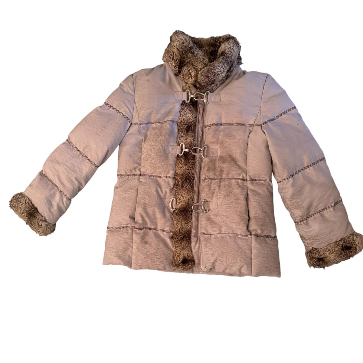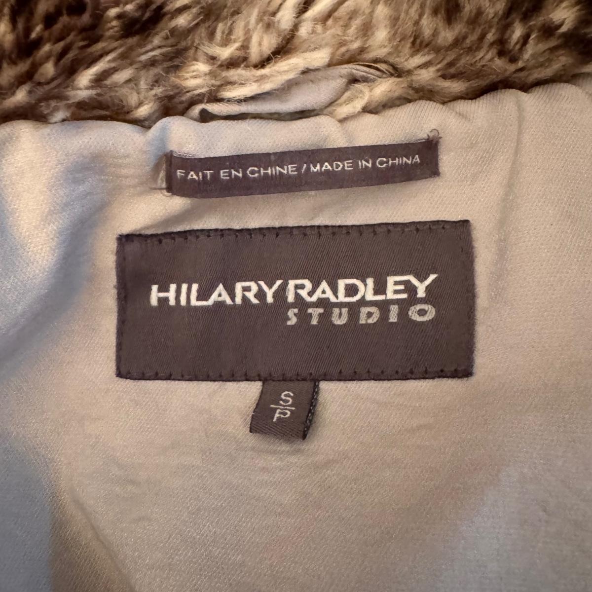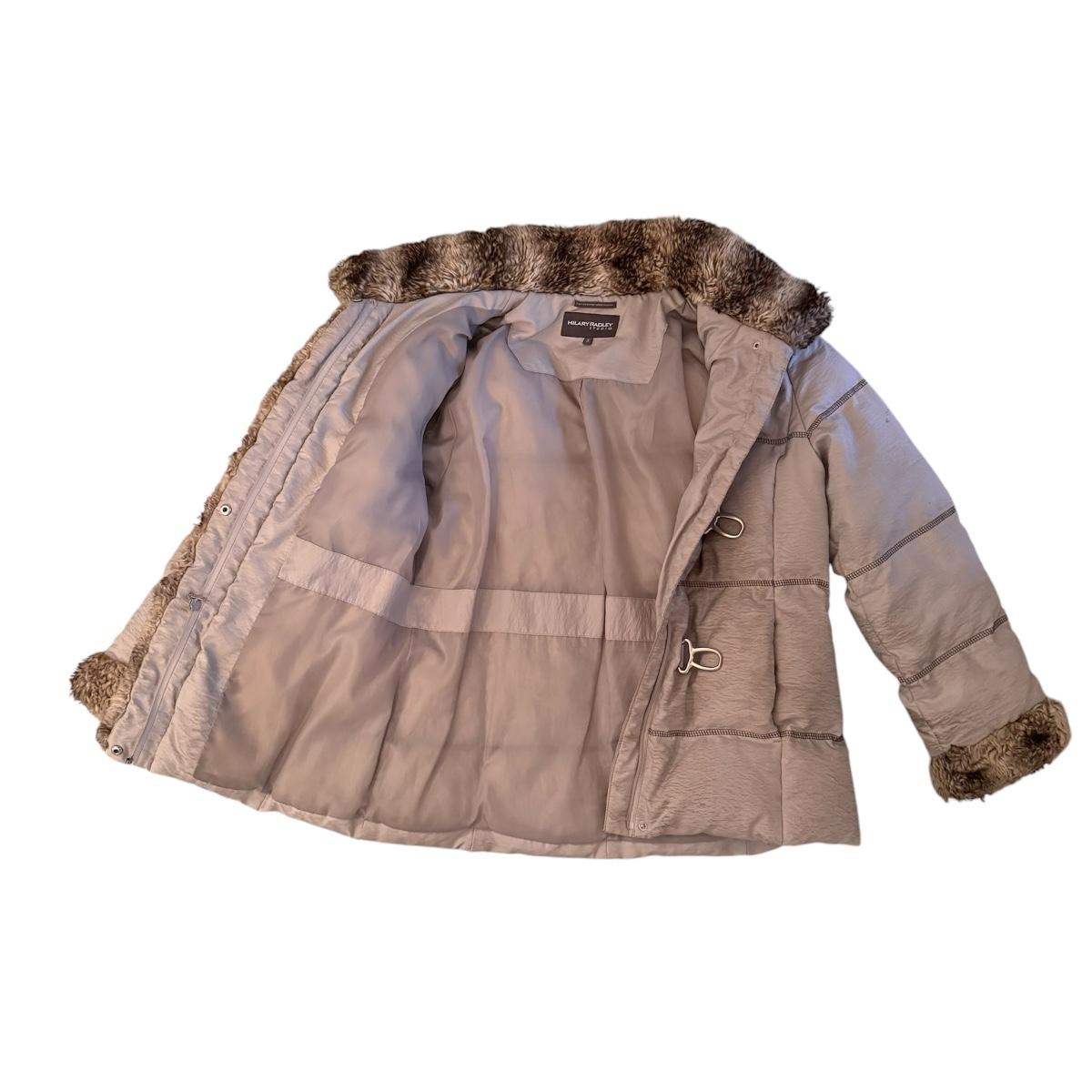 This lot includes one Hilary Radley down jacket in a size small. The jacket has a faux fur lining and is down. The jacket zips up and has snap buttons for closure. It also has three clasps on the outside, but two are broken. There is a small stain on one of the sleeves and an area in the front and some dirt on the sleeves. See pictures included. Shipping available.