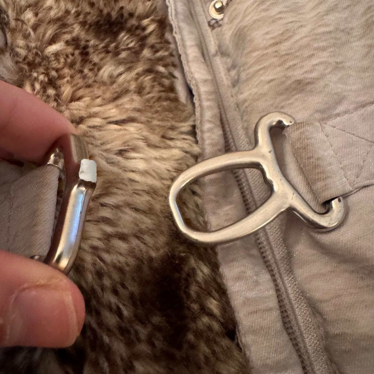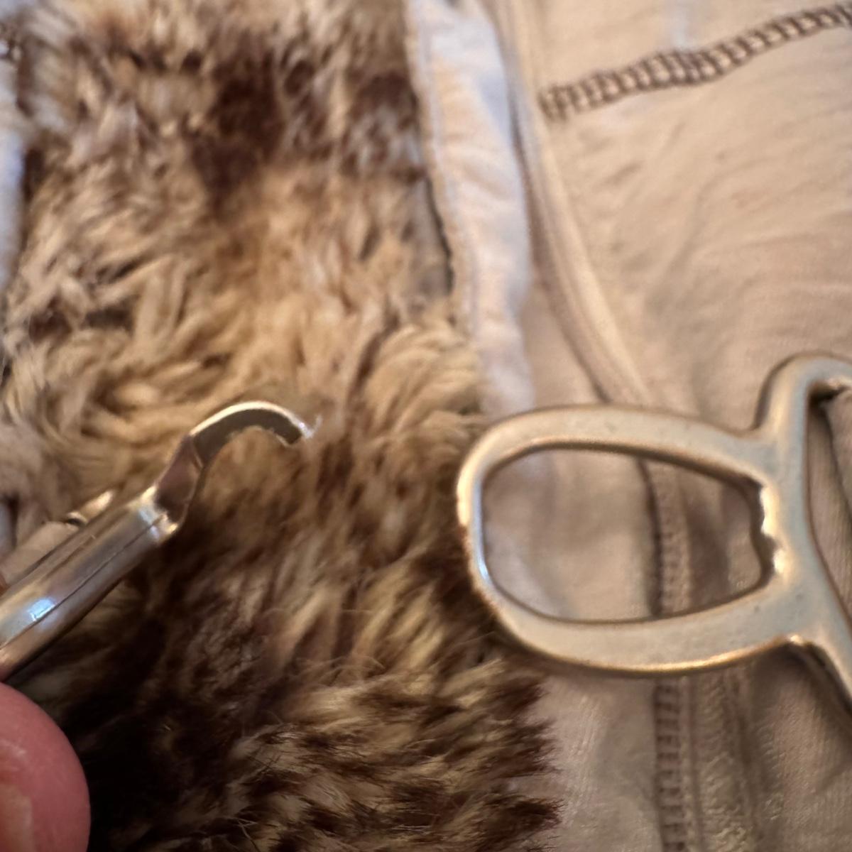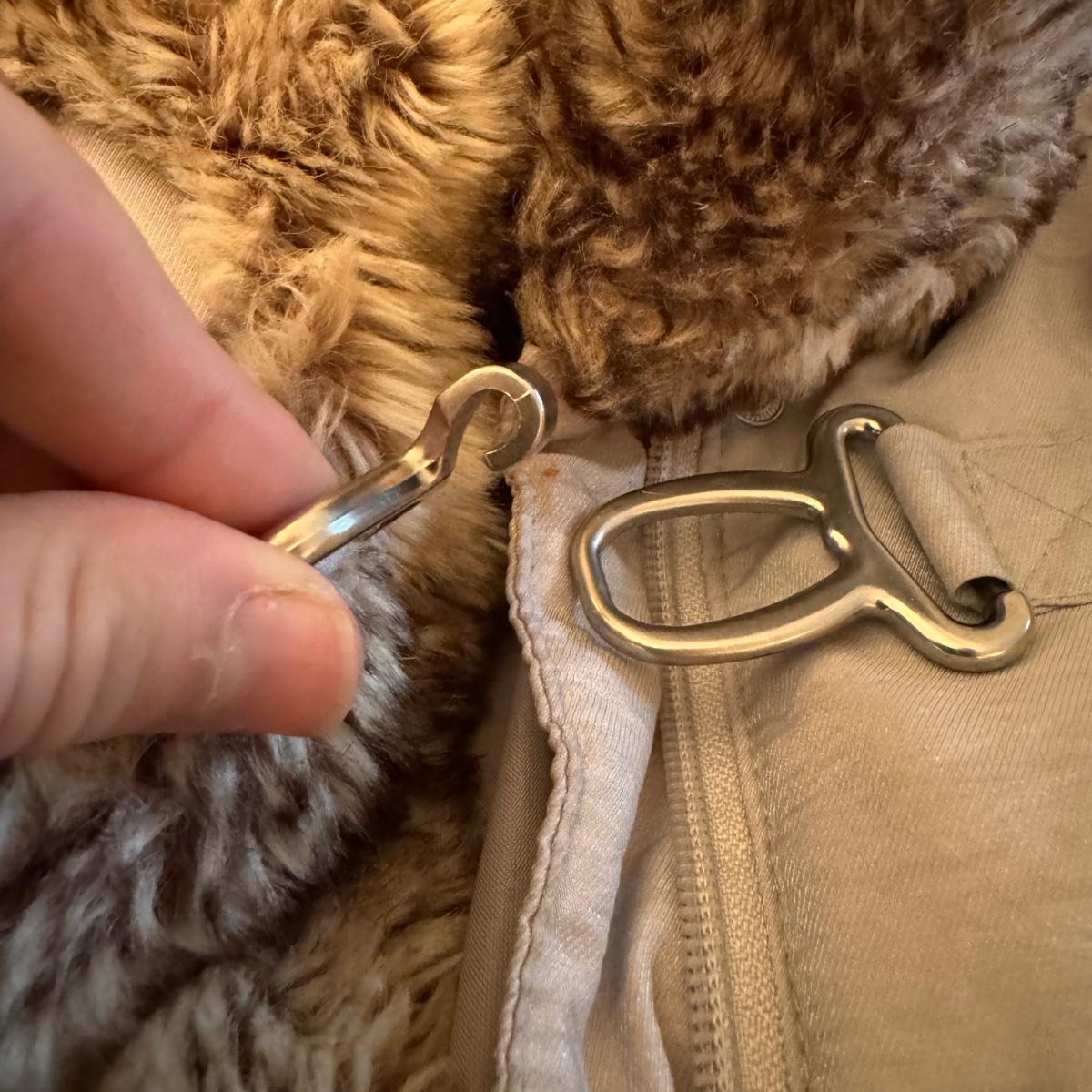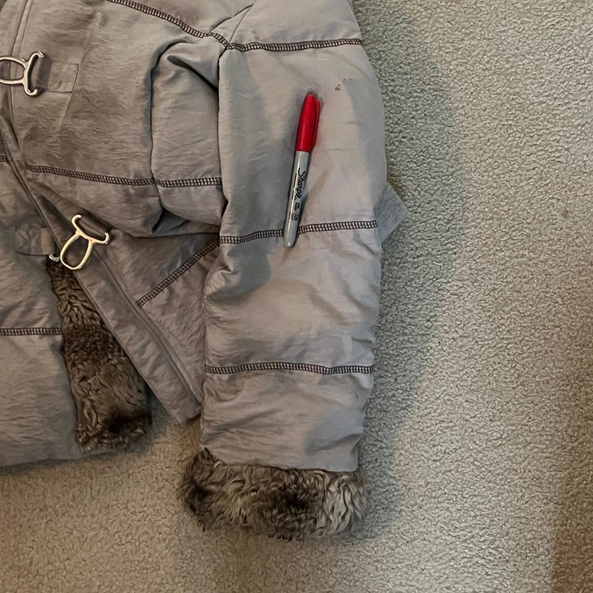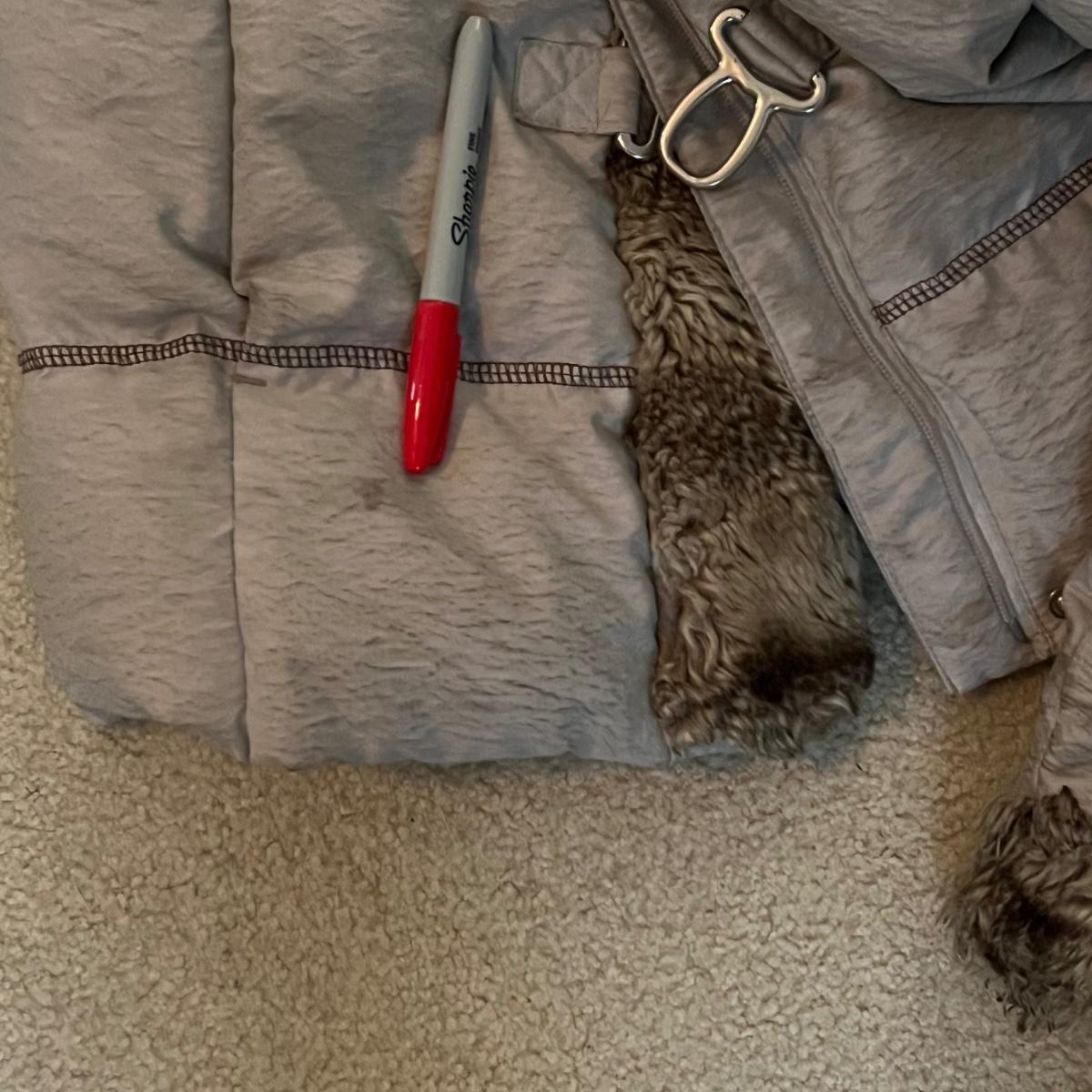 This lot includes one Hilary Radley down jacket in a size small. The jacket has a faux fur lining and is down. The jacket zips up and has snap buttons for closure. It also has three clasps on the outside, but two are broken. There is a small stain on one of the sleeves and an area in the front and some dirt on the sleeves. See pictures included. Shipping available.
