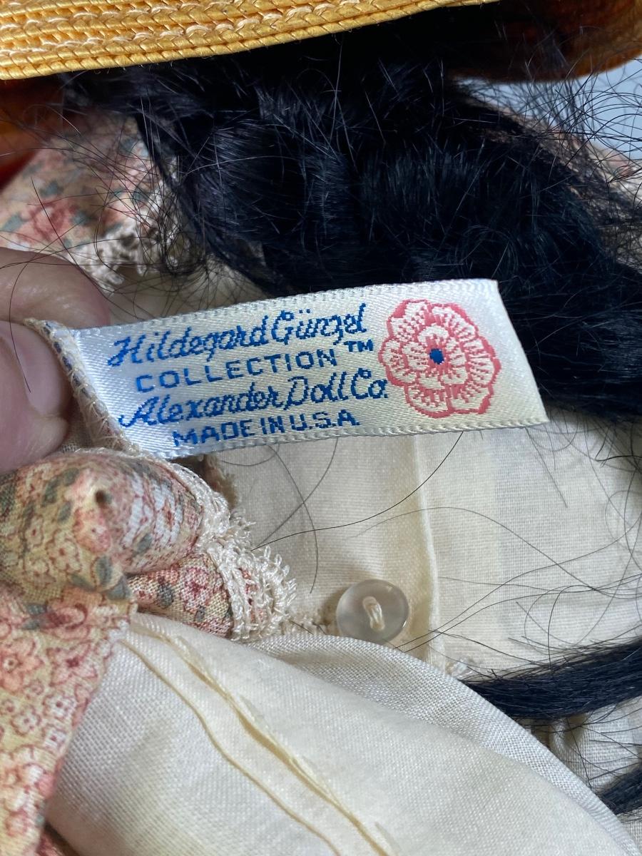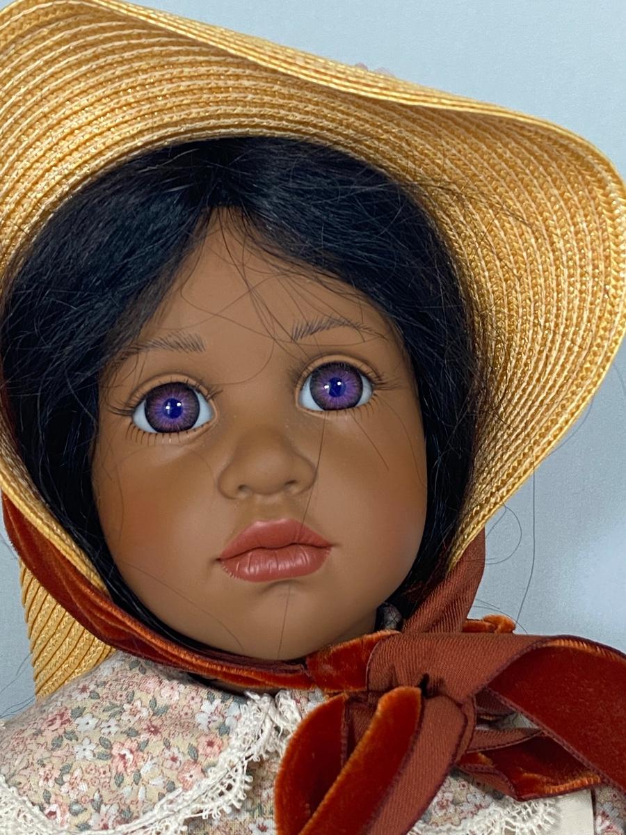 Vinyl body doll from the Hildegard Gunzel Collection. "Ebony" African American doll with violet-colored eyes. In original outfit. About 20" size. Soft body with some wire for posing, will not stand without support.