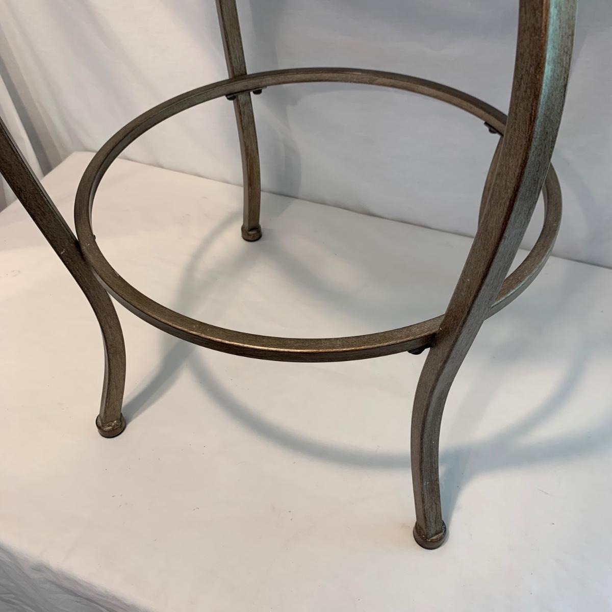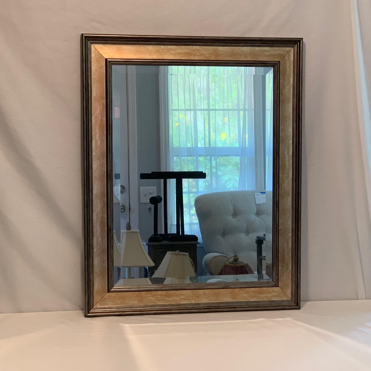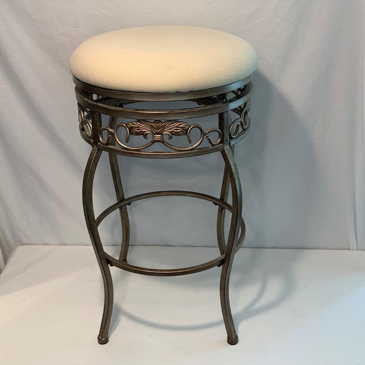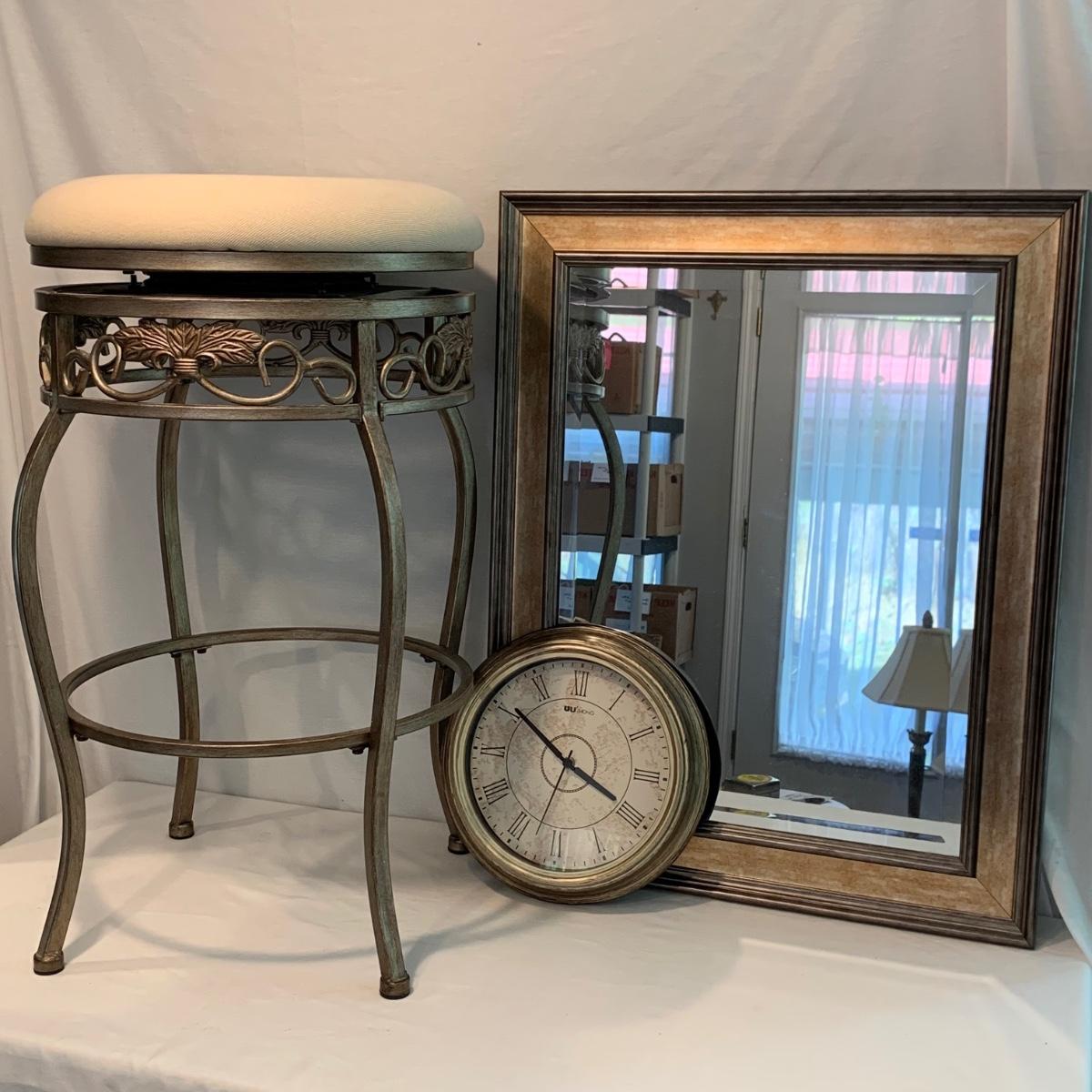 Swivel stool with decorative metal base and cream colored cushion from Hillsdale Furniture. Seat is 17.5”D and stool is 30”H. A replacement cushion is included as well. The clock and mirror frame are plastic. The clock is currently functioning. The mirror is beveled and the frame is 24” x 30”. Each item has a finish with brushed metal appearance.