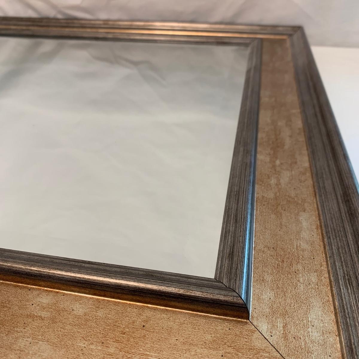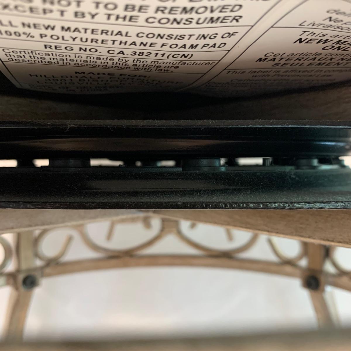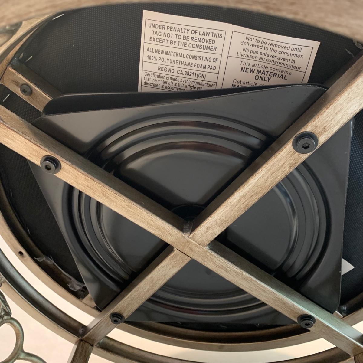 Swivel stool with decorative metal base and cream colored cushion from Hillsdale Furniture. Seat is 17.5”D and stool is 30”H. A replacement cushion is included as well. The clock and mirror frame are plastic. The clock is currently functioning. The mirror is beveled and the frame is 24” x 30”. Each item has a finish with brushed metal appearance.