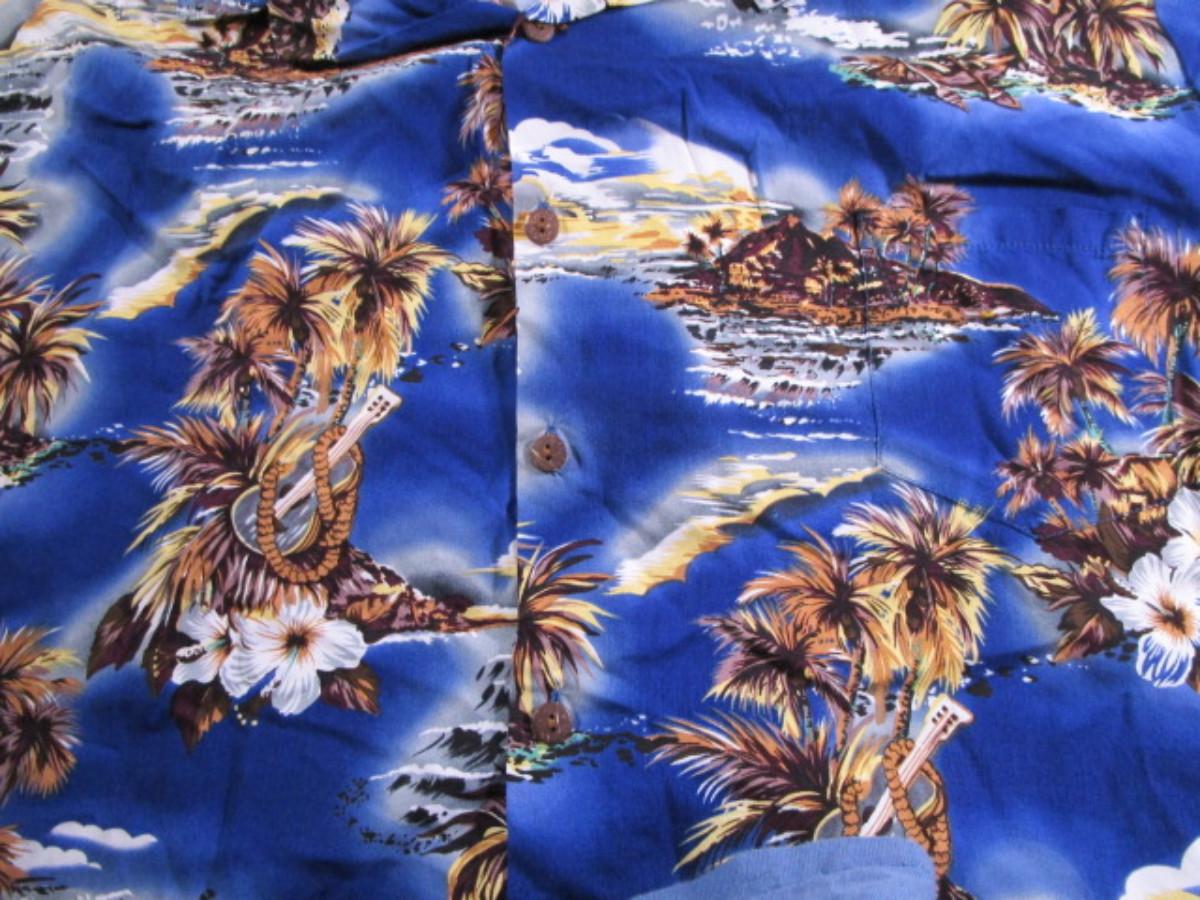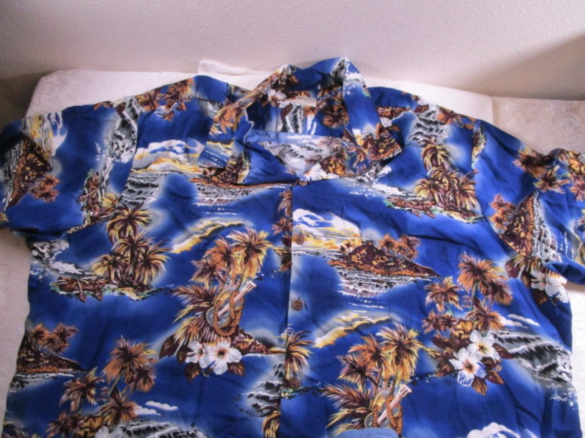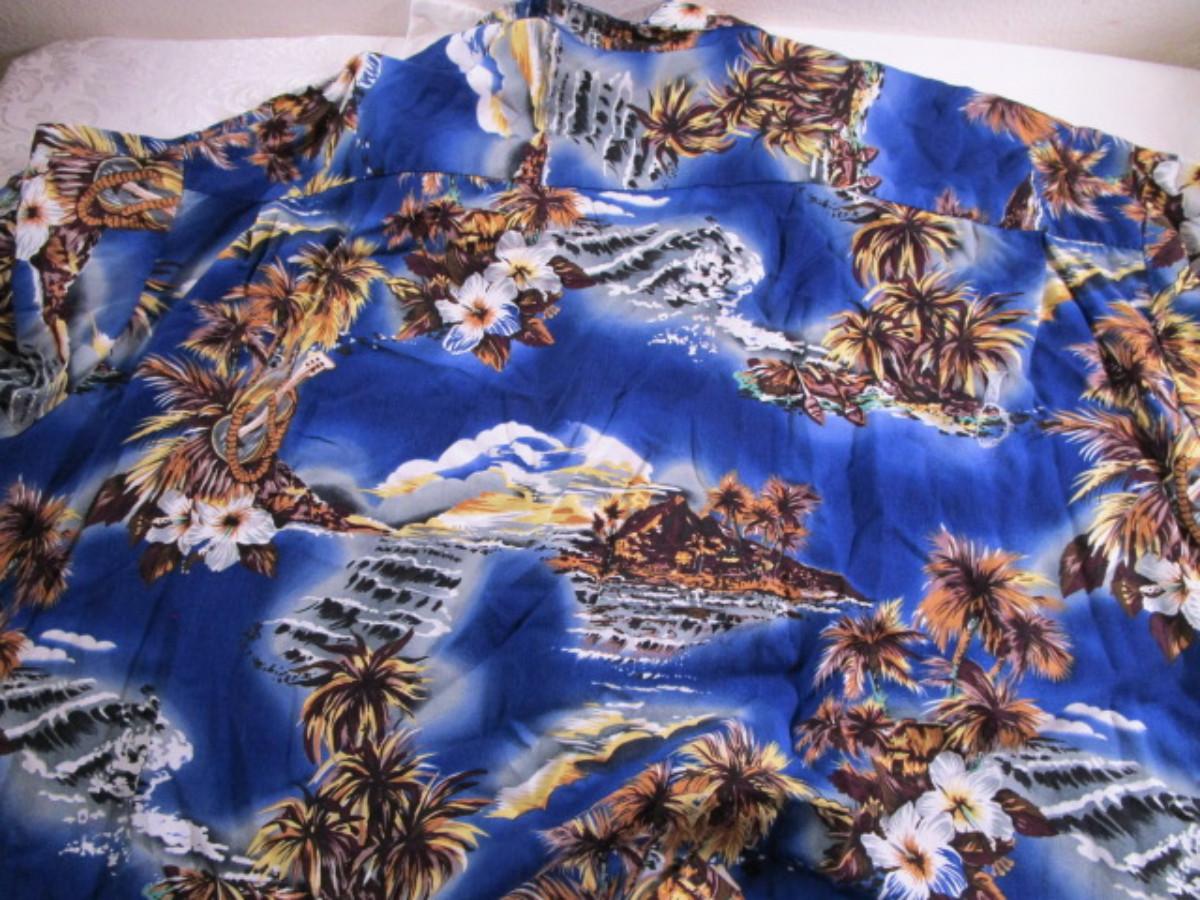100% rayon, Size 5X, excellent condition, short-sleeved, has chest pocket
