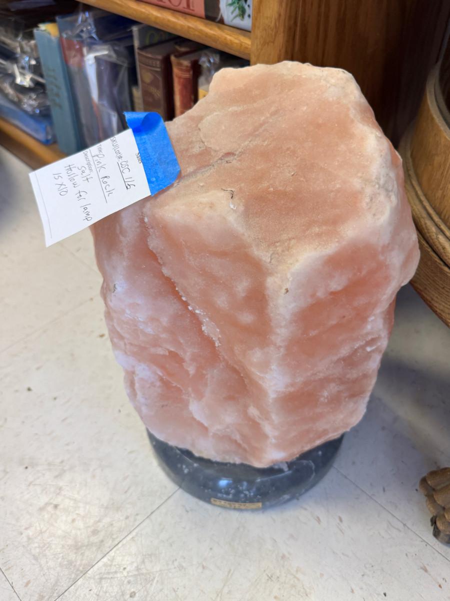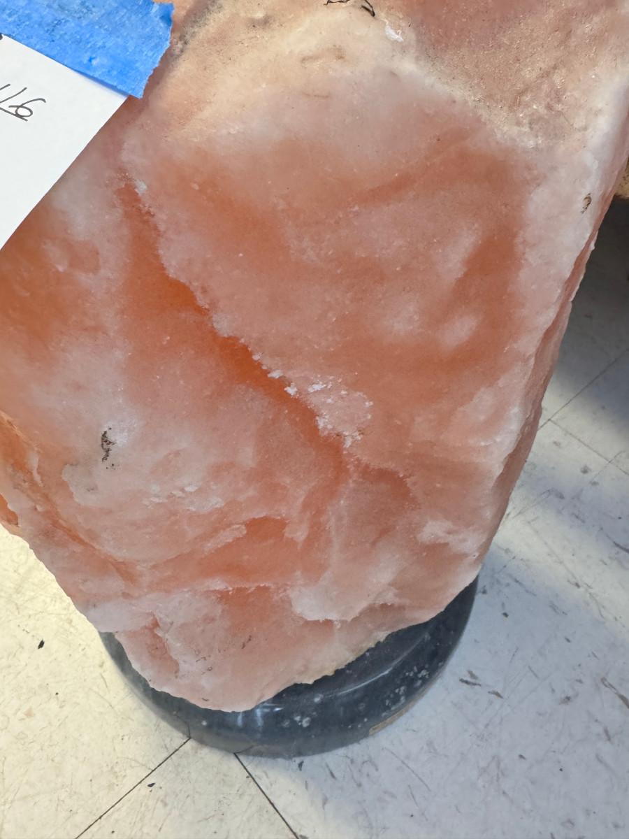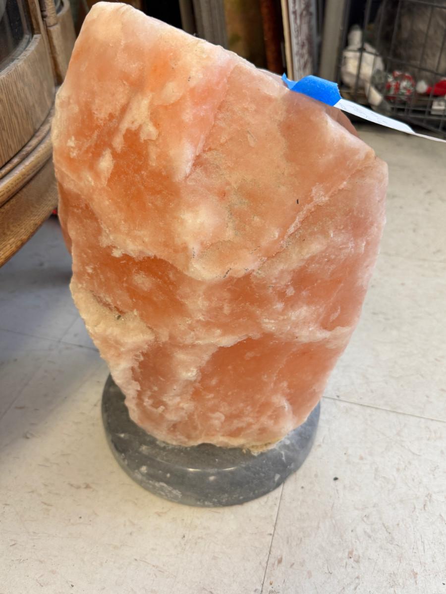 Himalayan Pink Rock Salt lamp. This very heavy piece sits on a marble base with a hole to insert a bulb, which is NOT included. Himalayan salt lamps are crystals carved from amber-colored rock salt, hollowed out to fit a light bulb inside. When you light them, they give out a warm, reddish-pink glow.