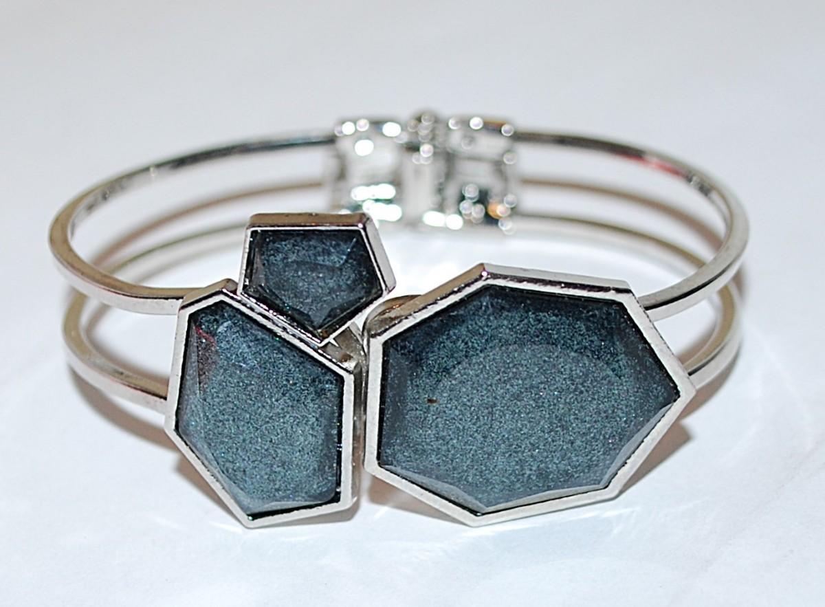 HINGED Spring Snap-Open BRACELET (2¼" Opening) with Hexagon Shape Glittery BLACK Graphite Style Beveled Stones