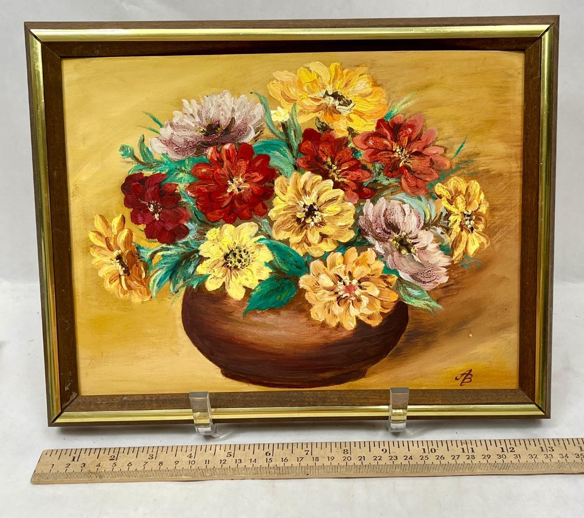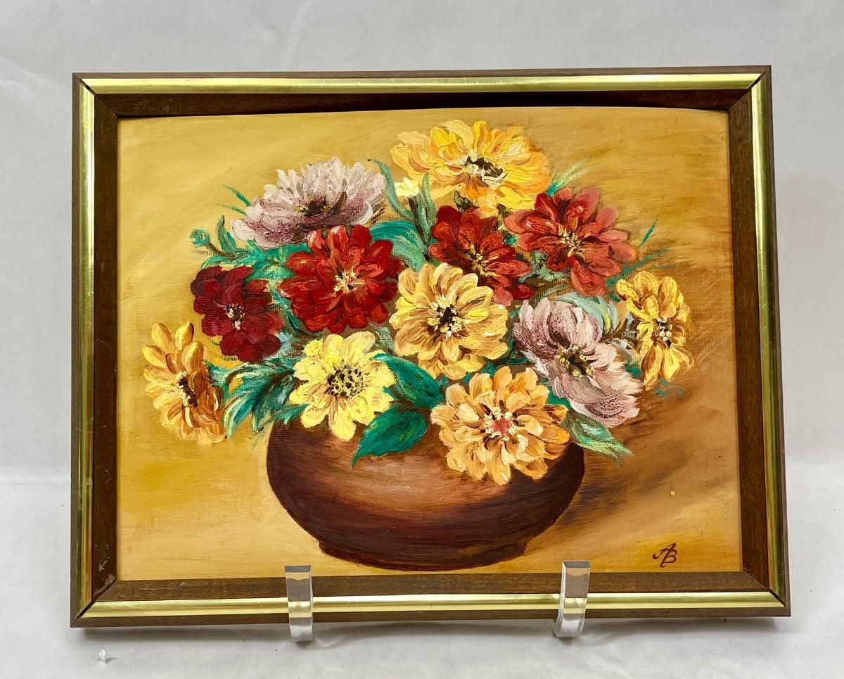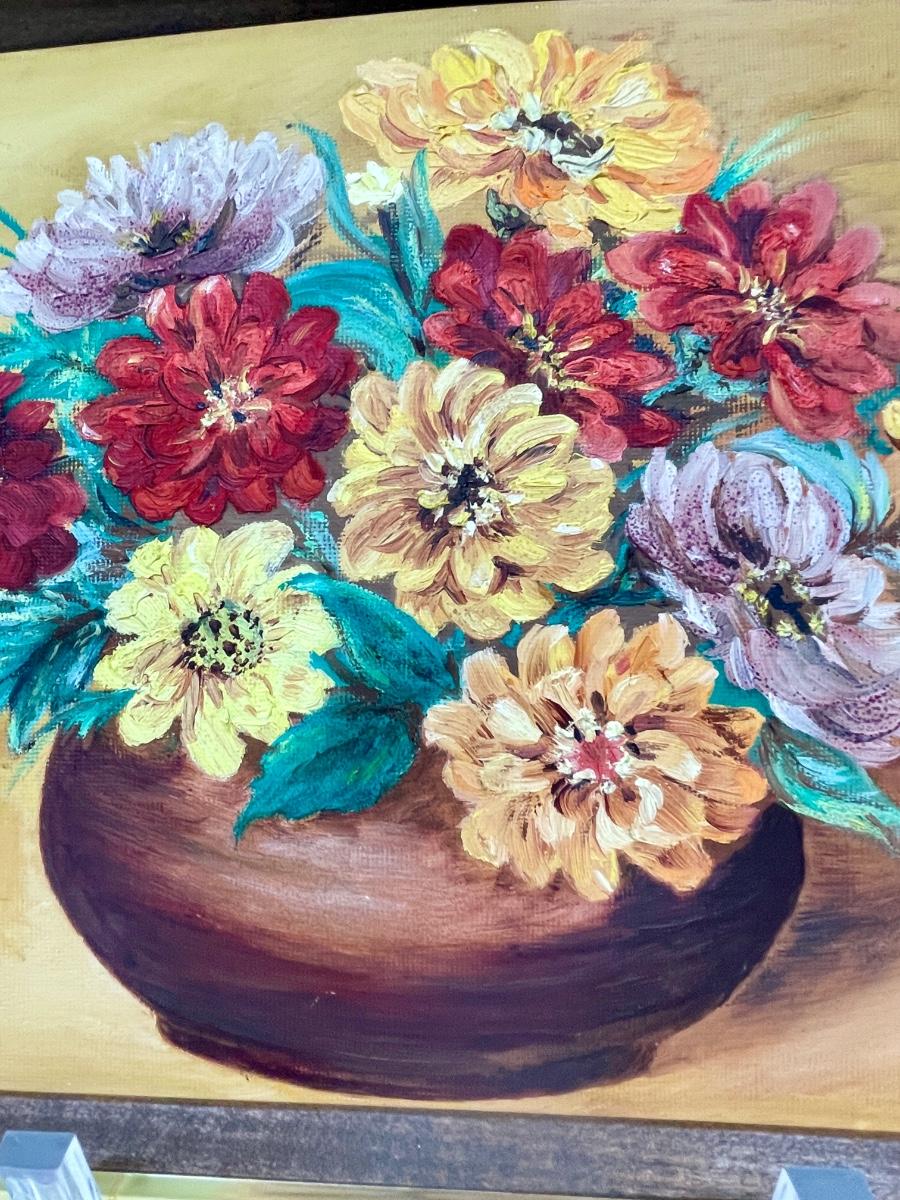 Oil on Canvas Still Life: Flowers in Bowl signed