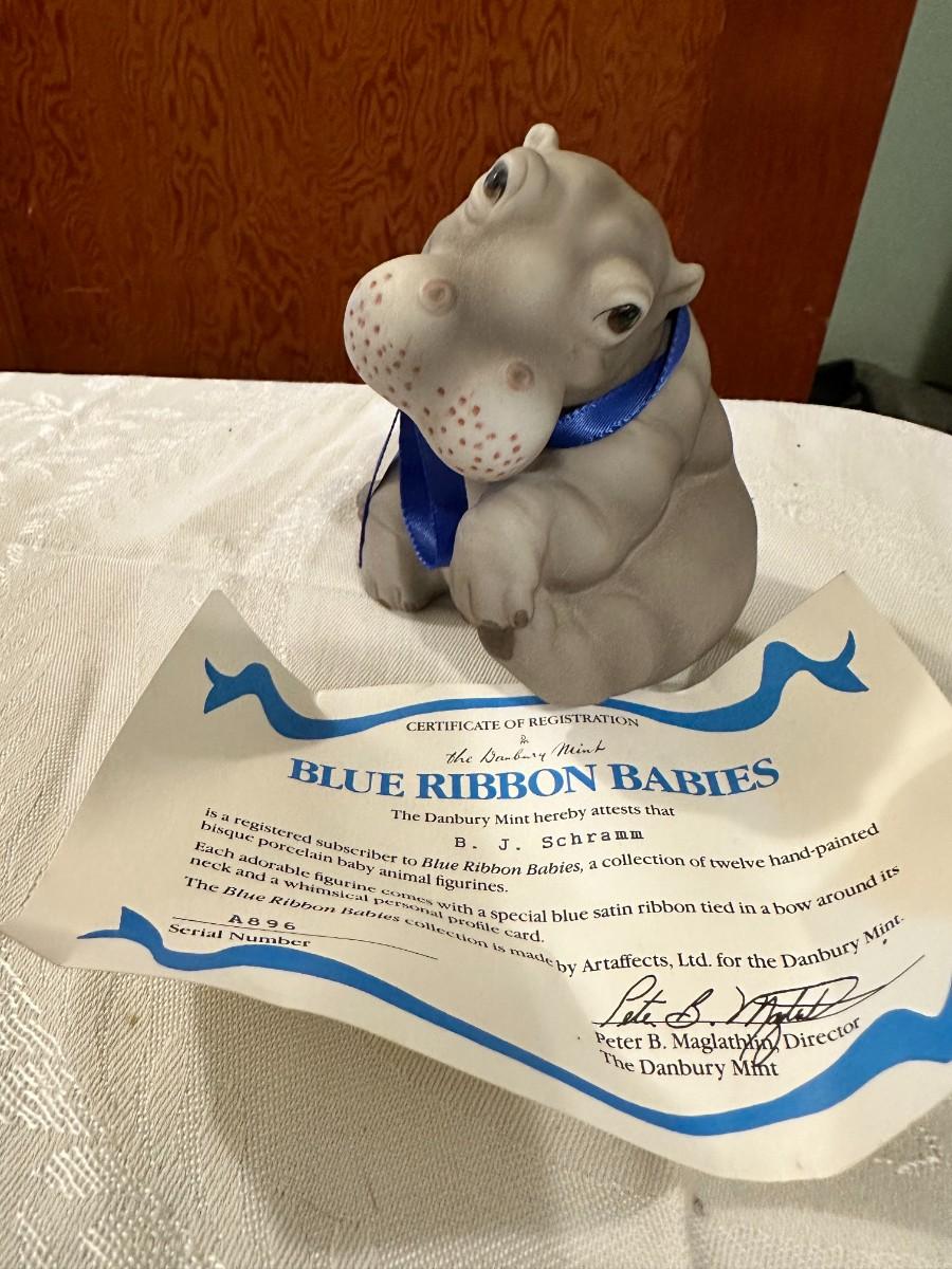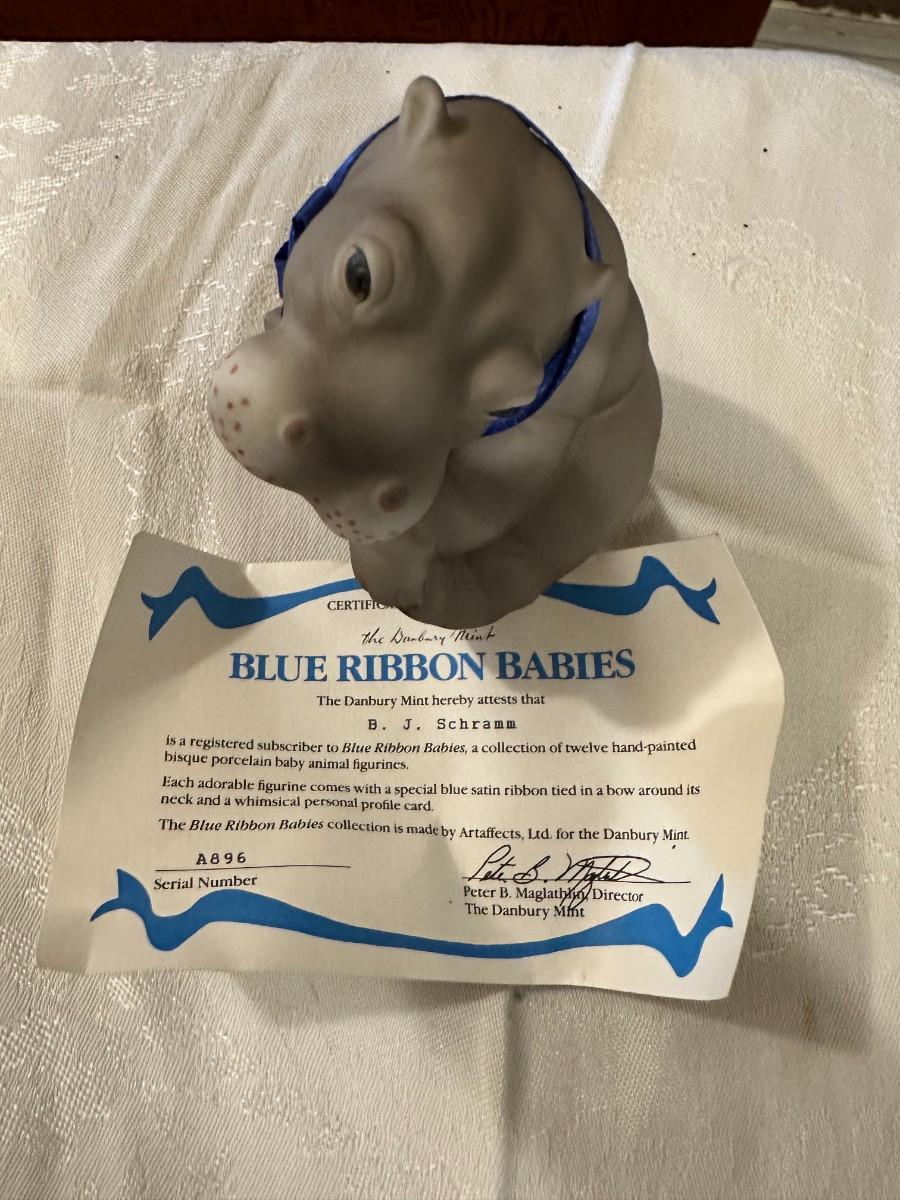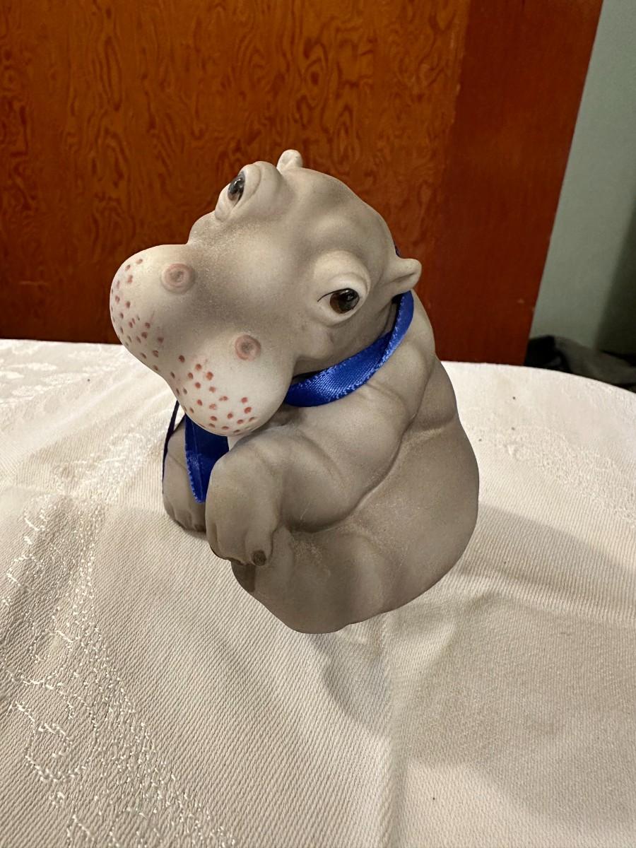 Hippo Hippopotamus Artaffects Figure Figurine Statue with blue Ribbon Ceramic