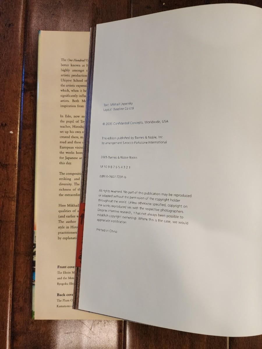 Beautiful book Mikhail Uspensky examines the artistic qualities of a selection of Hiroshige's prints (and earlier works) held in Russian museums. The author discusses the history of ukiyo-e style in Hiroshige's works and those of other practitioners. Illustrations are accompanied by explanations and poetic captions.