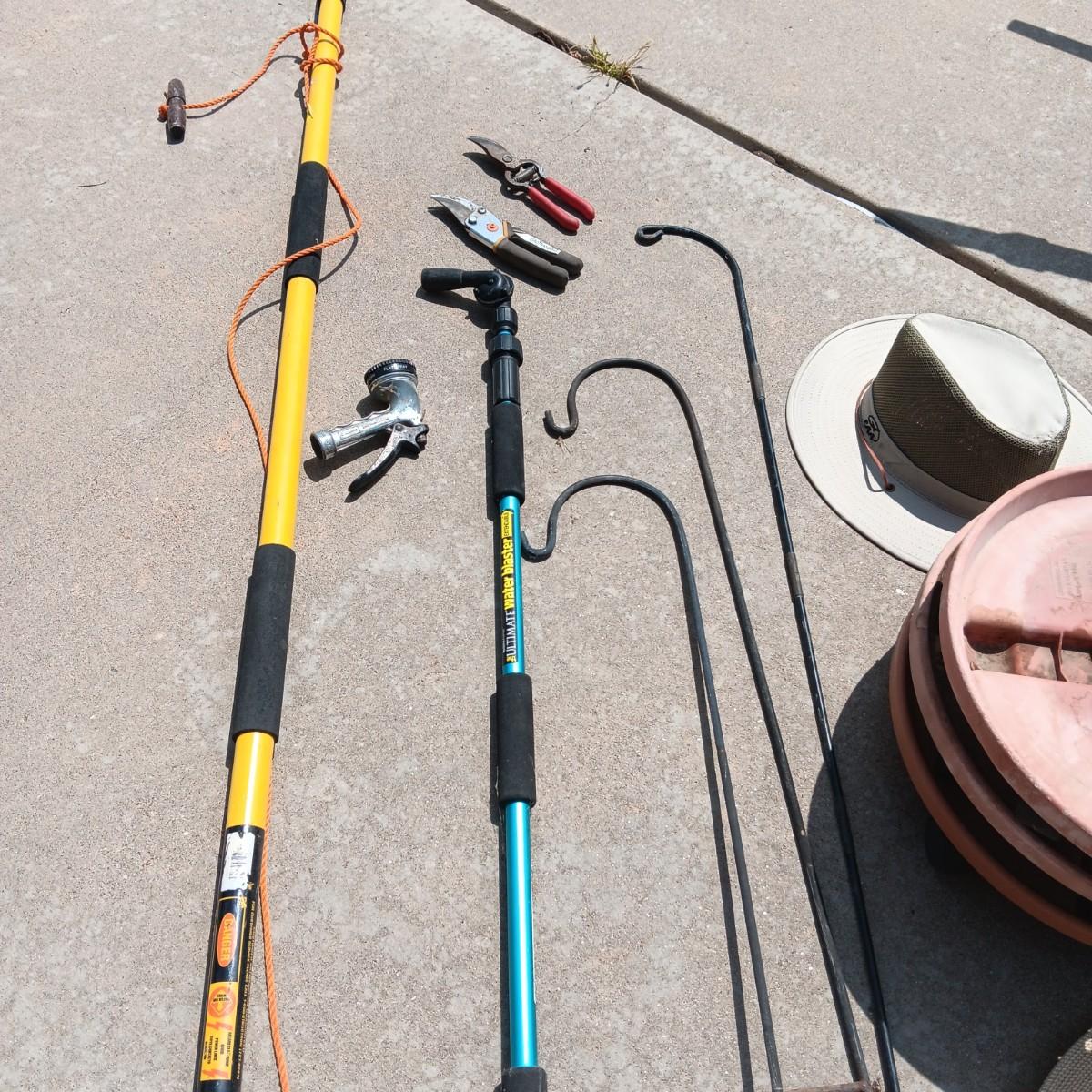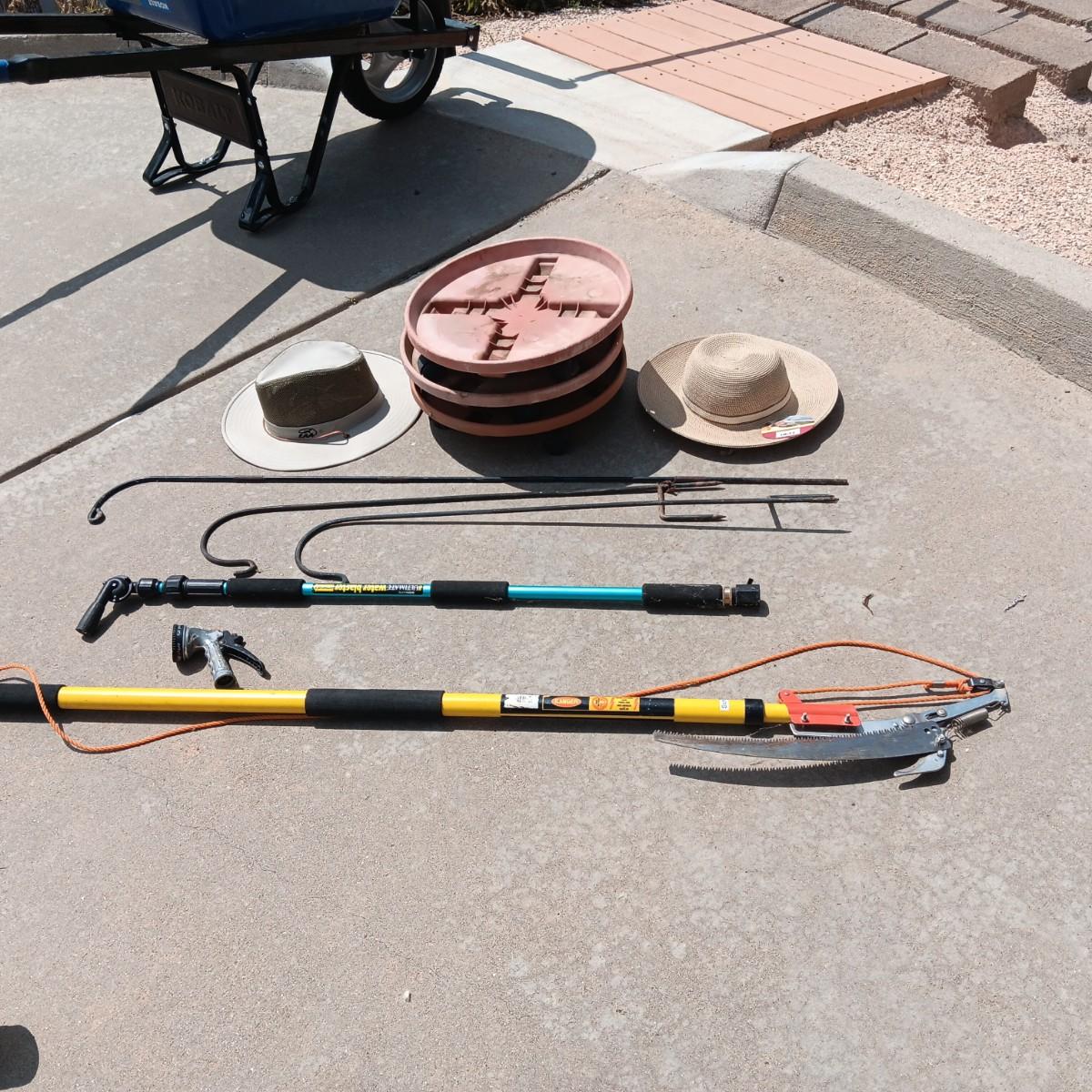 HIS AND HERS SUN HATS, 3 PLANT DOLLIES, LIMB CUTTER AND MORE