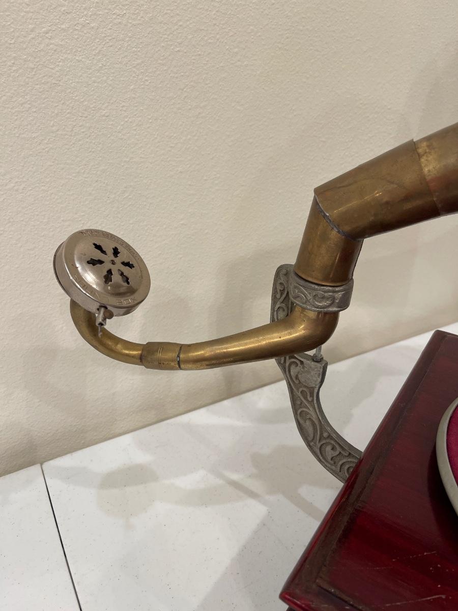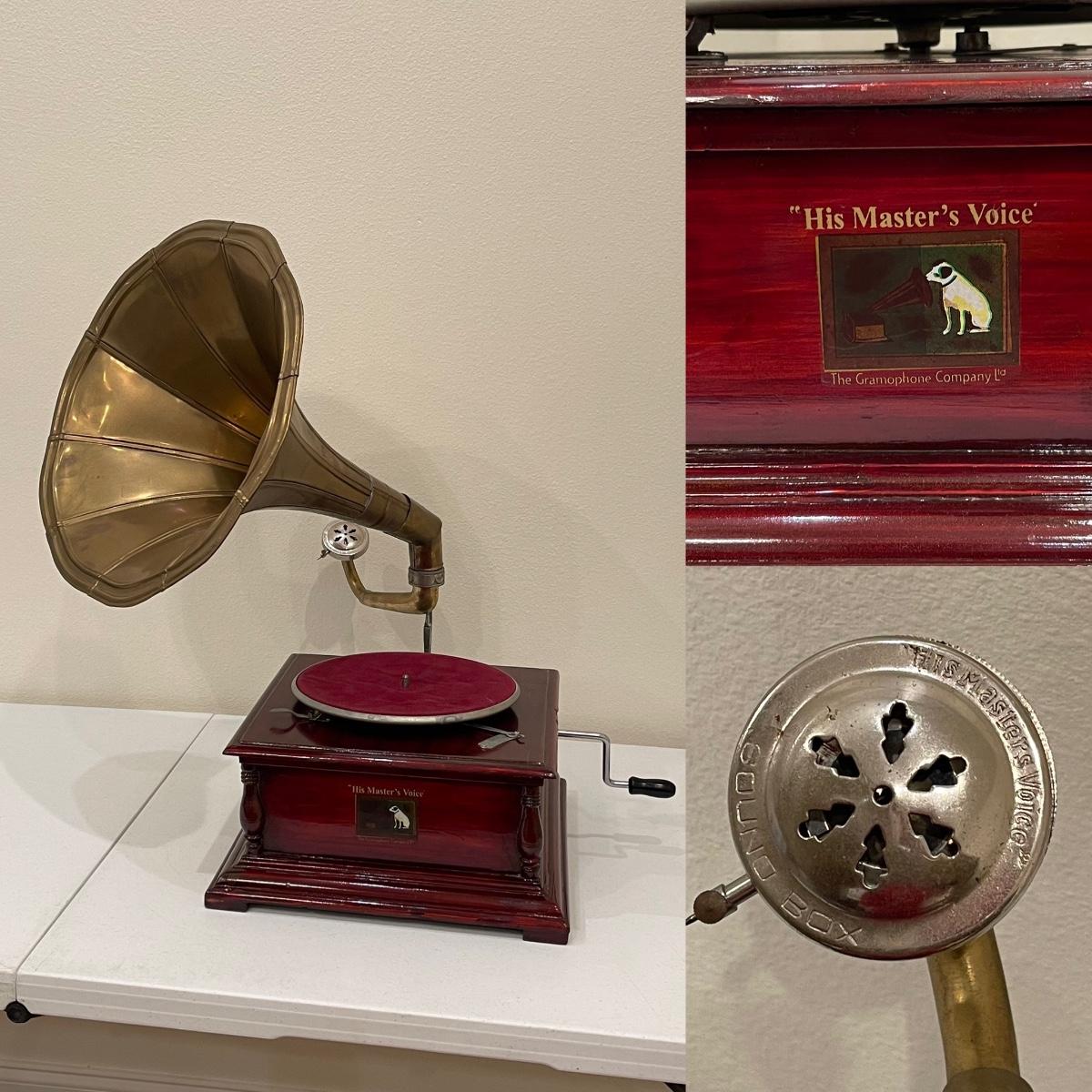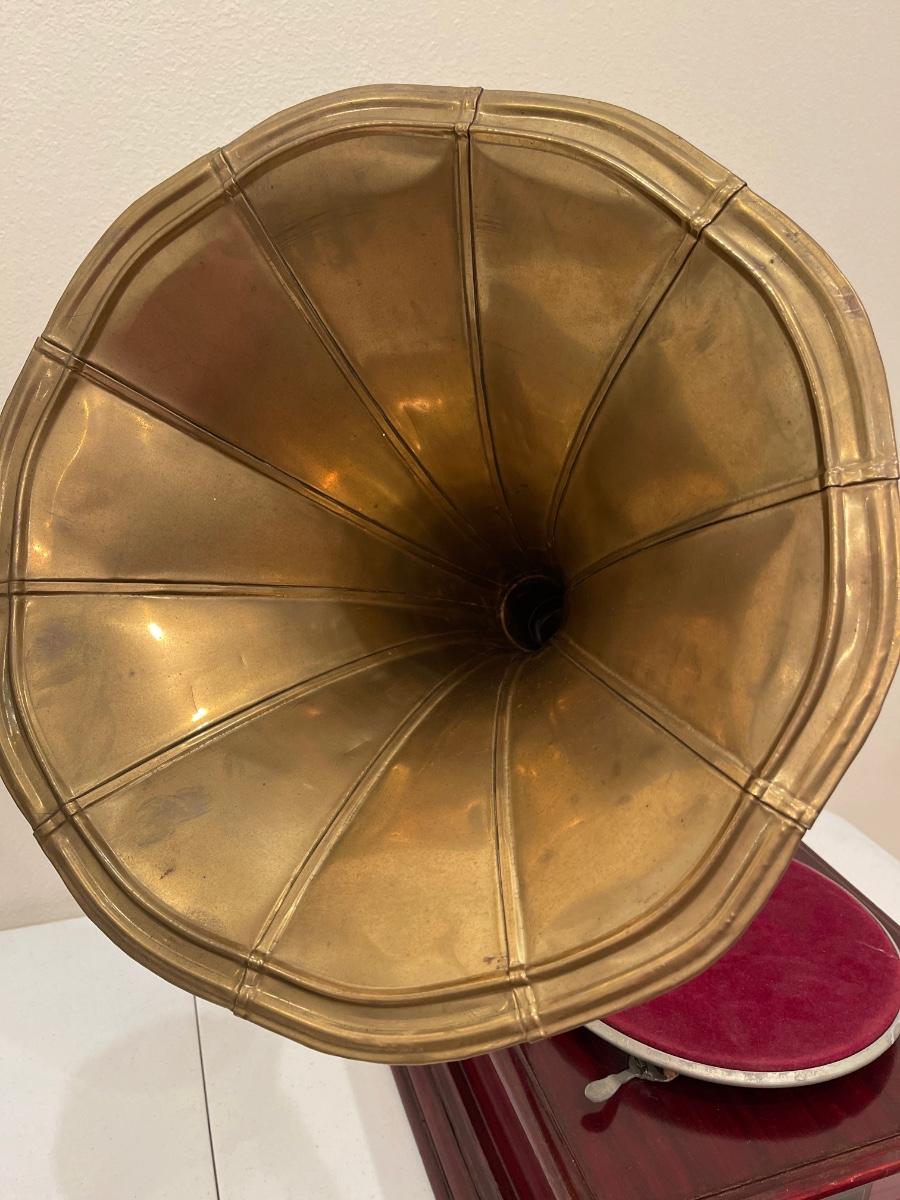 Spins, if you want it use it, it will need a new needle ~ Approximately size ~ 27” H x 24” x 24” ~ Horn is brass