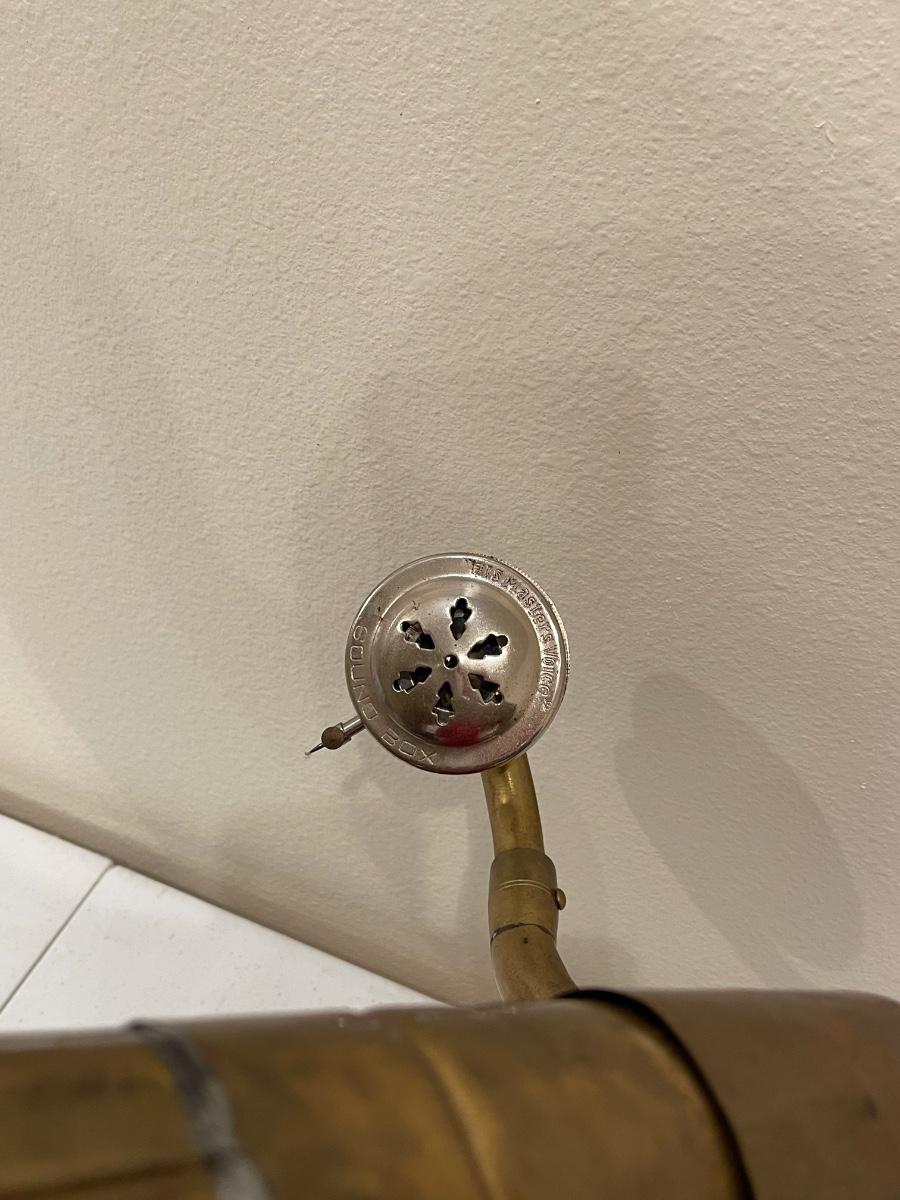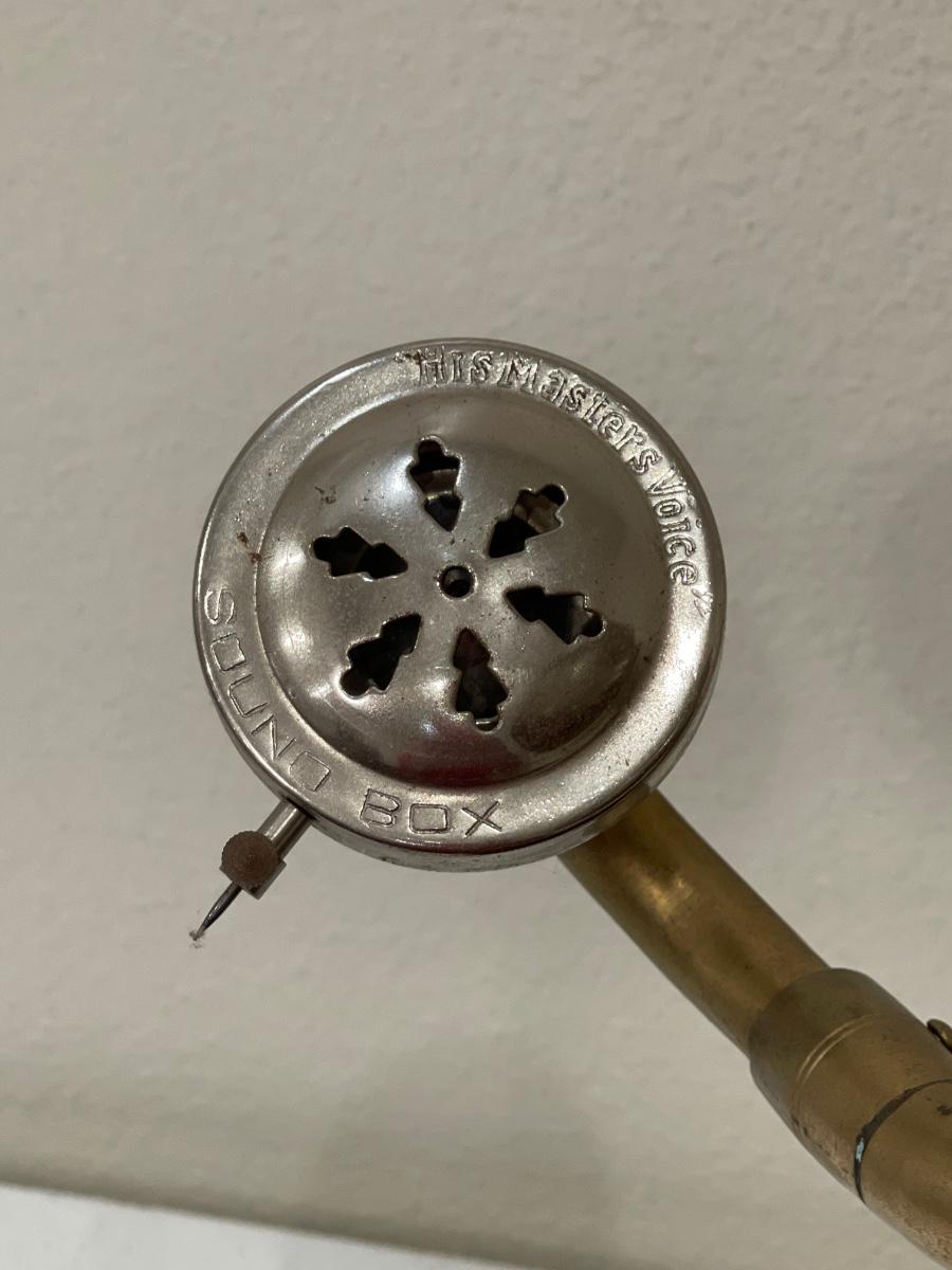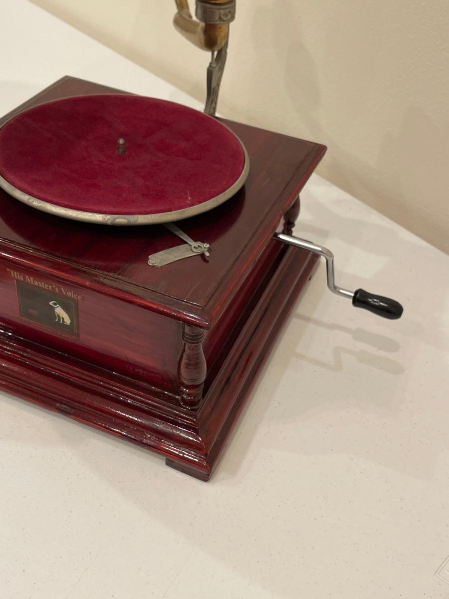 Spins, if you want it use it, it will need a new needle ~ Approximately size ~ 27” H x 24” x 24” ~ Horn is brass