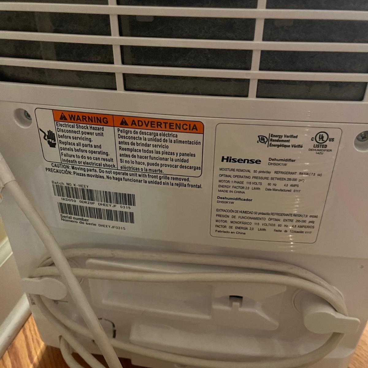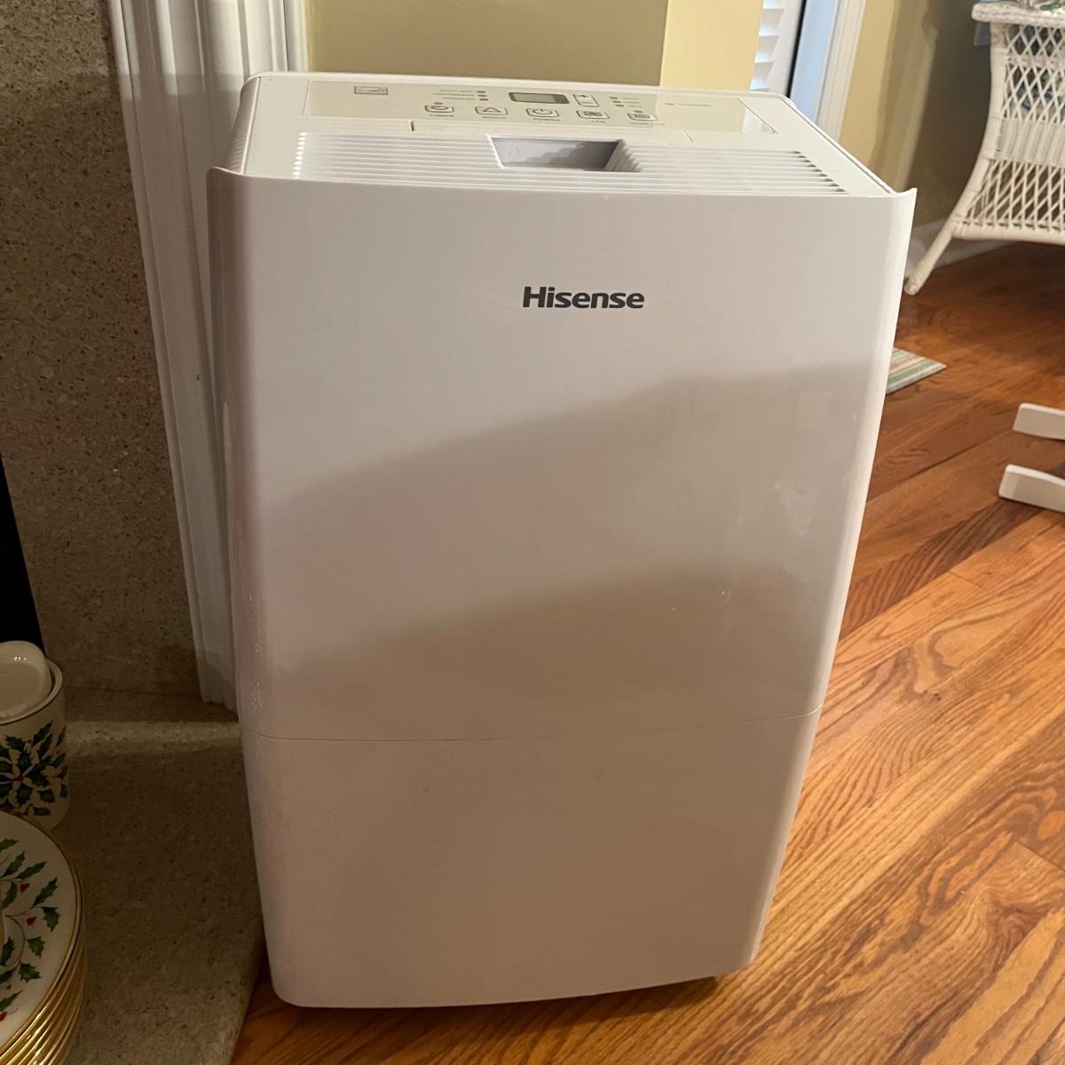 Lot includes a Hisense Dehumidifier that measures 10” x 14” x 25”H. Item was plugged in and powered on.