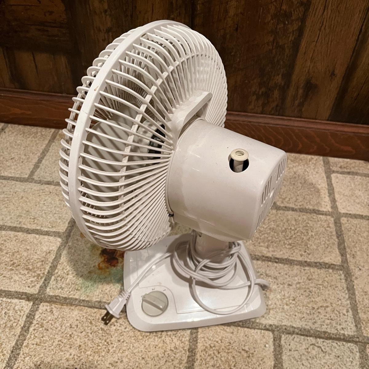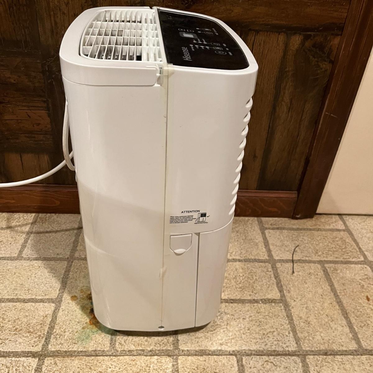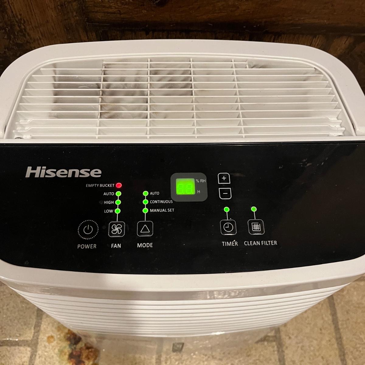 Lot includes a Hisense dehumidifier, Sunbeam oscillating fan and a small Lasko oscillating desk fan. All items powered on when plugged in. Dehumidifier measures 14” x 10” x 20”H.