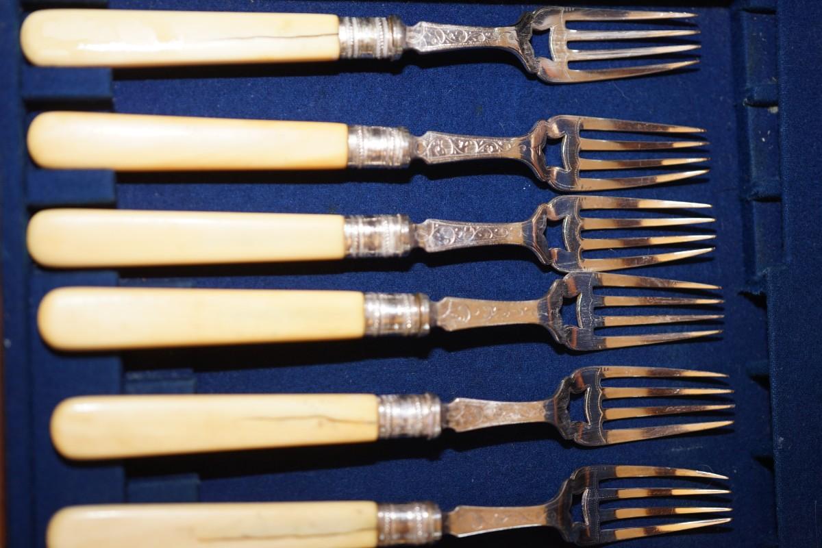 The handles are of bone. Some of the handles do have cracks typical for age. they do not effect the stability of the piece. Very impressive set and original.