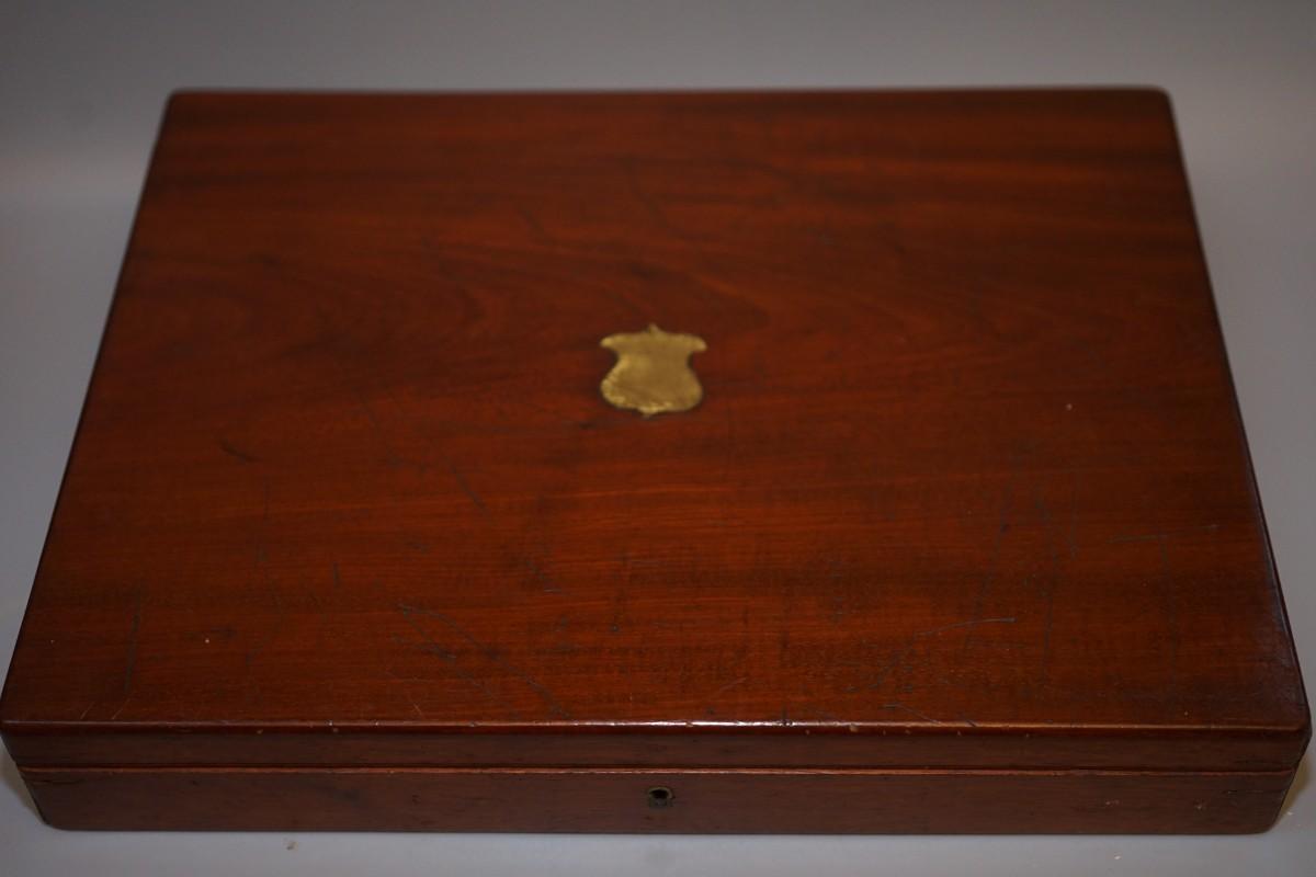 The box has a very good rich color to the wood. there are some deep scratches that are older. There is a brass shield in the center of the box that is for the owners initials to be engraved. The shield does not have an monogram .