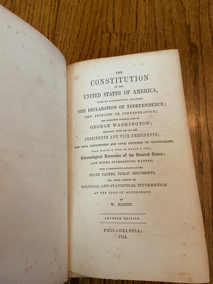 The Consitution of the United States of America with alphabetical analysis Hickey, W. (1854). 7th edition. Philadelphia Brown hardcover. ,