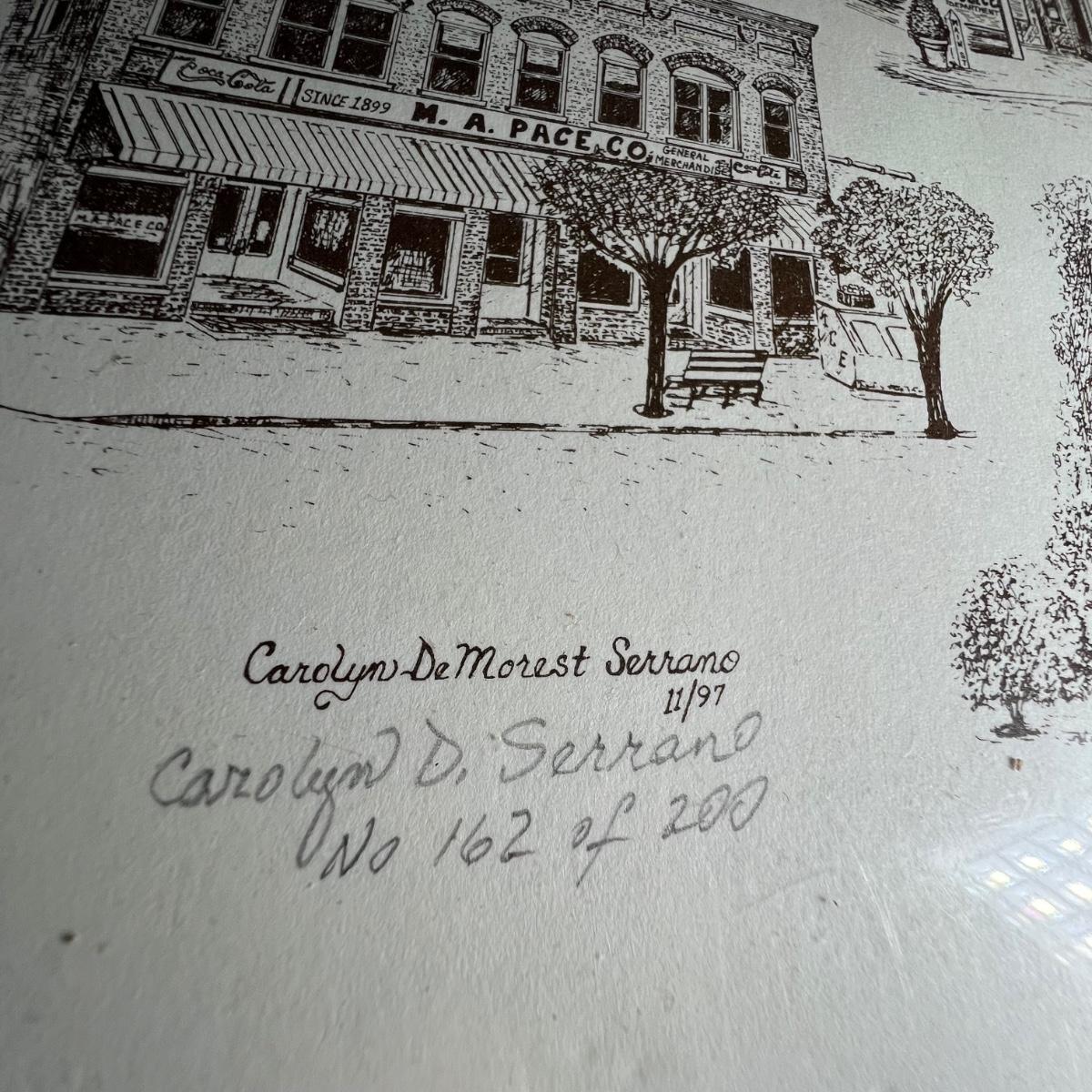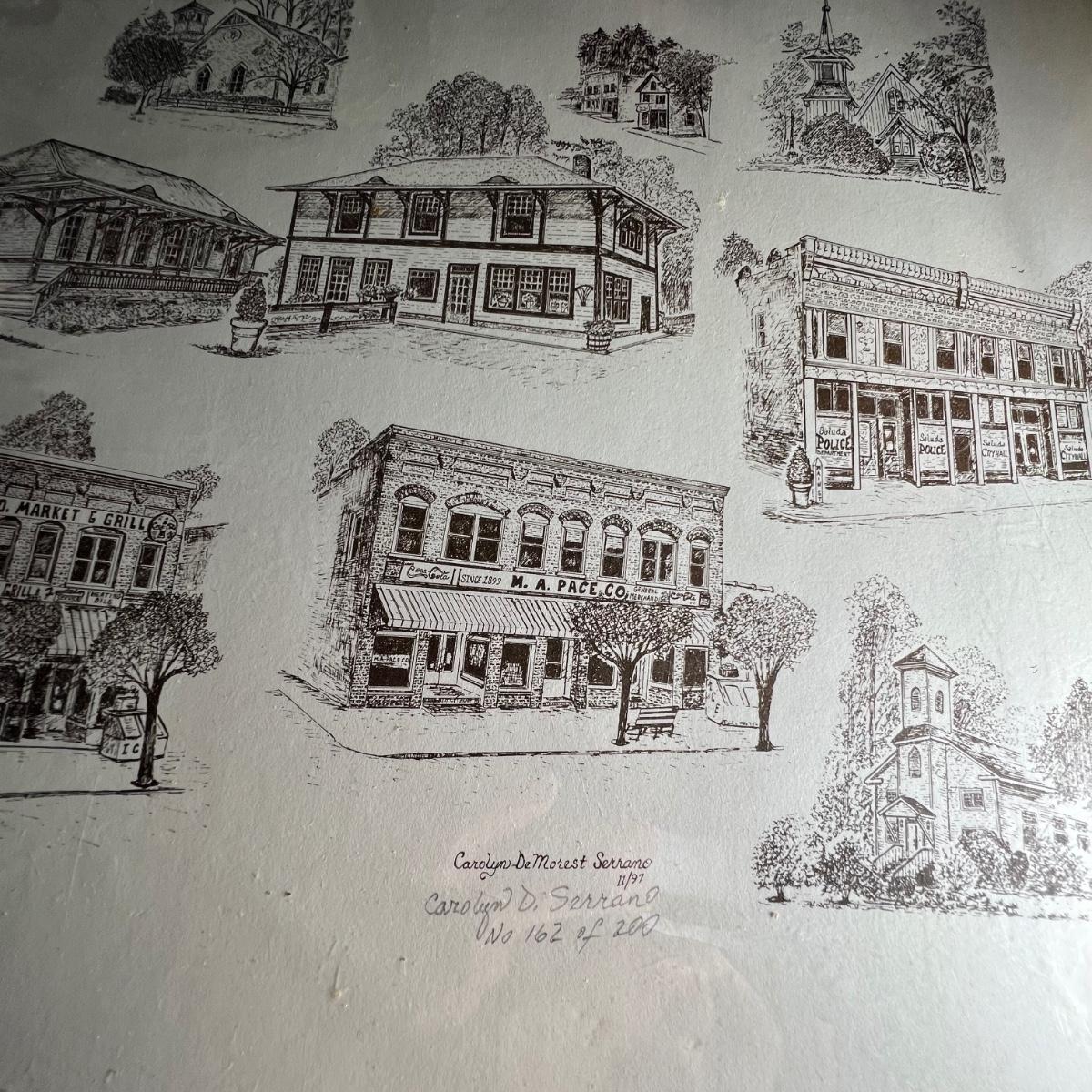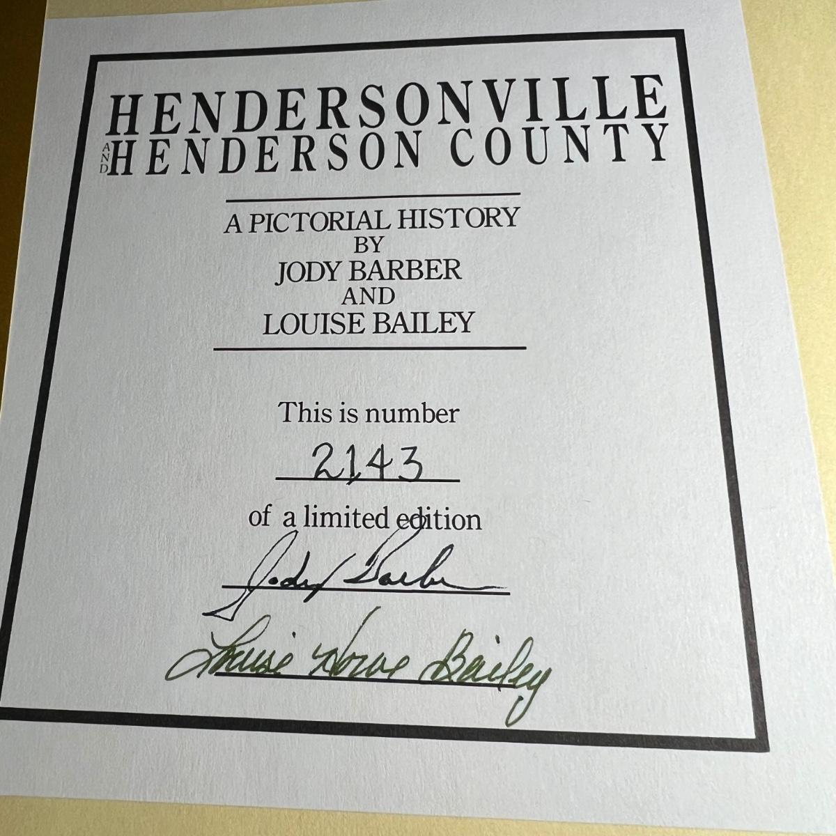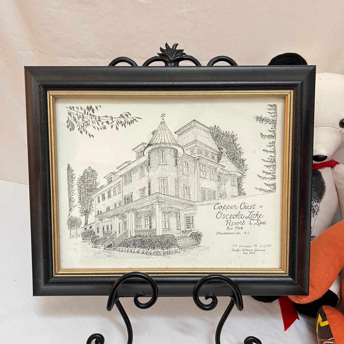 A great assortment of Hendersonville and Saluda items that includes “˜A Pictorial History’ hardback book that is signed and numbered. The Copper Crest print is framed in a black resin like frame that measures 11” x 13”. The unframed pen and ink print is also signed by artist Carolyn Demorest Serrano, it has a small dent, see image. Last but not least are three Norma Jean memory bears. Display stand not included.