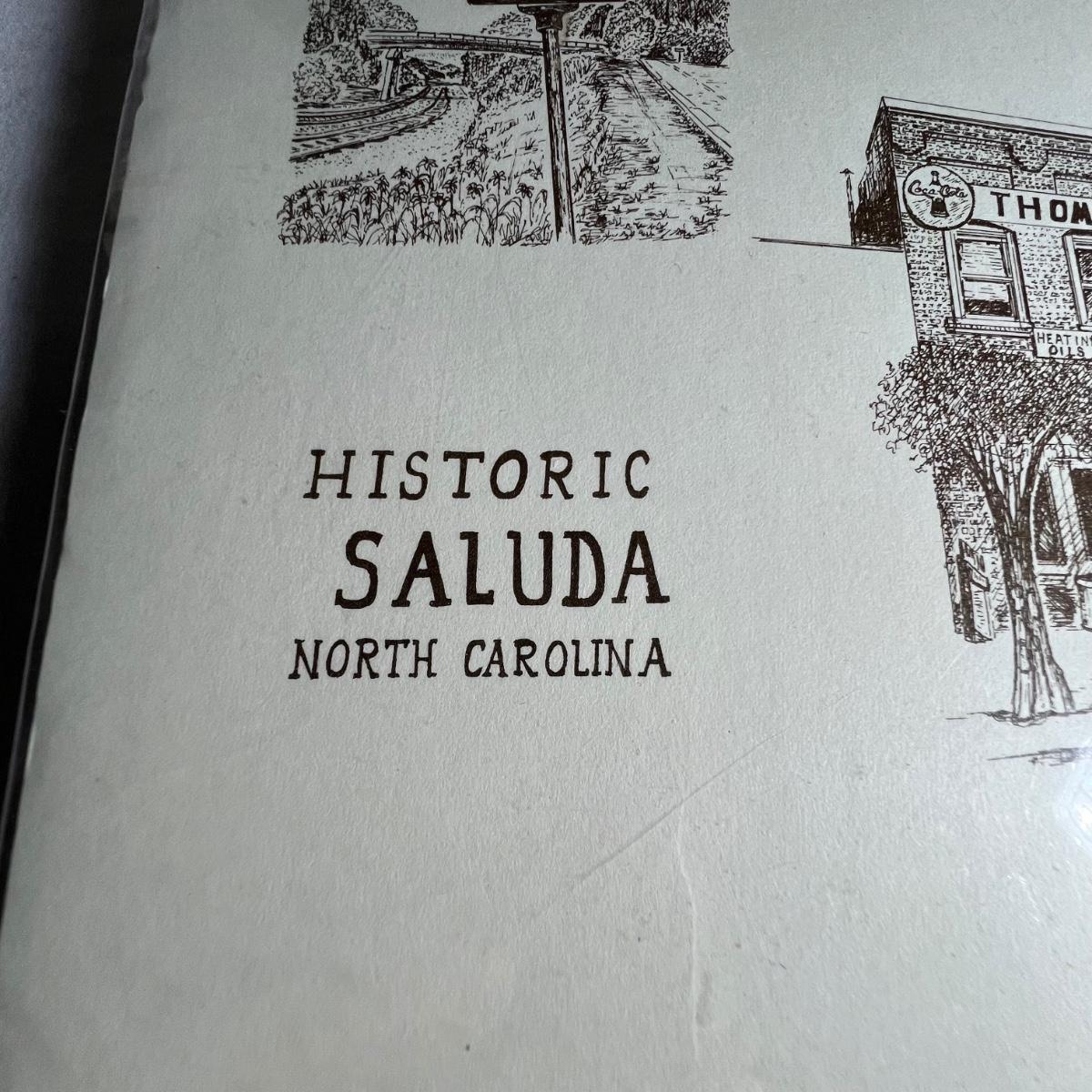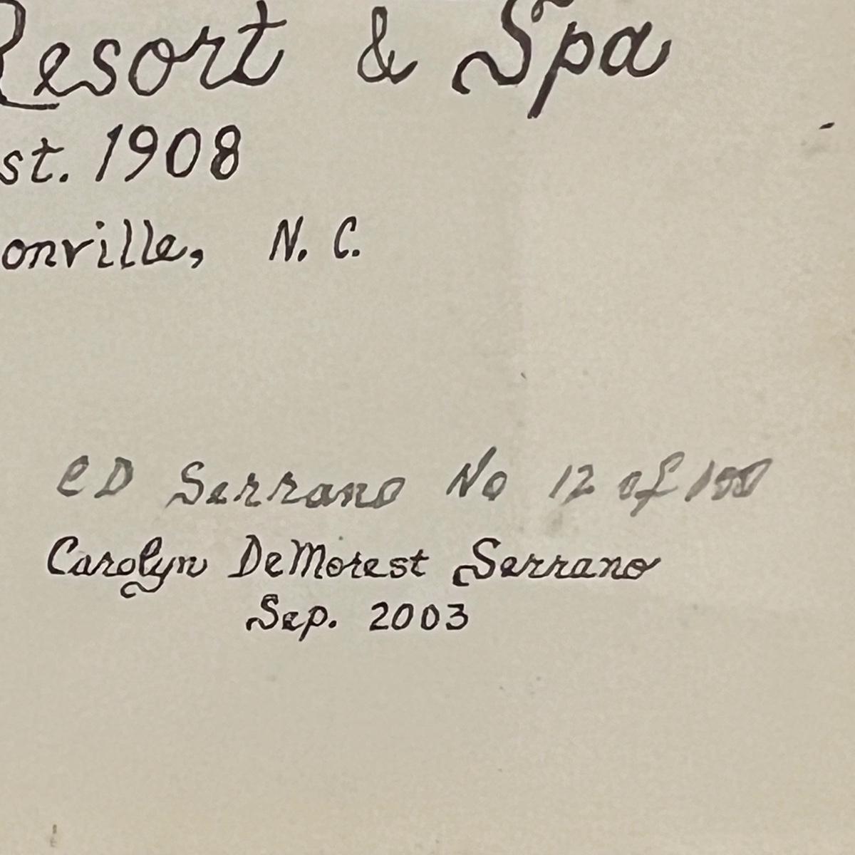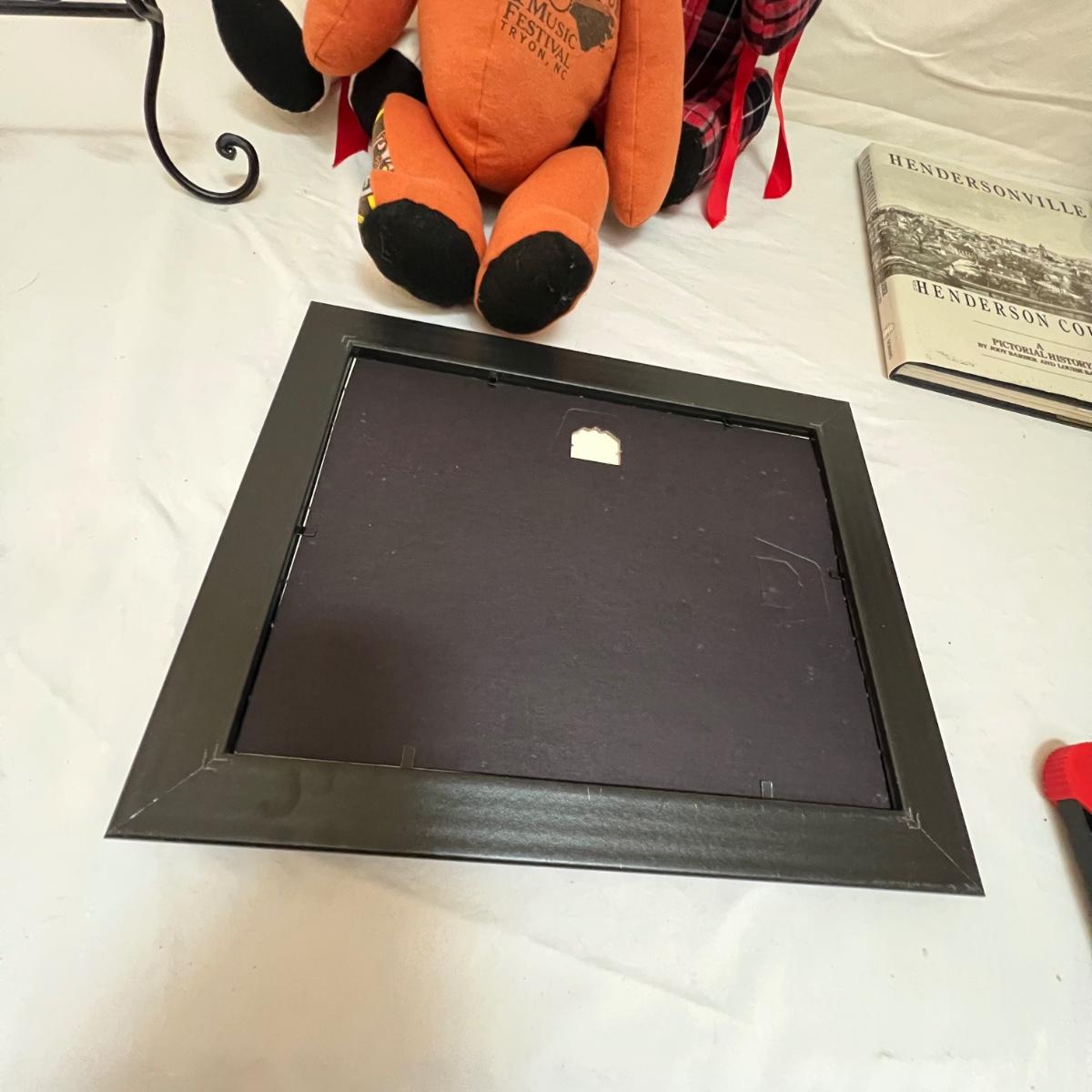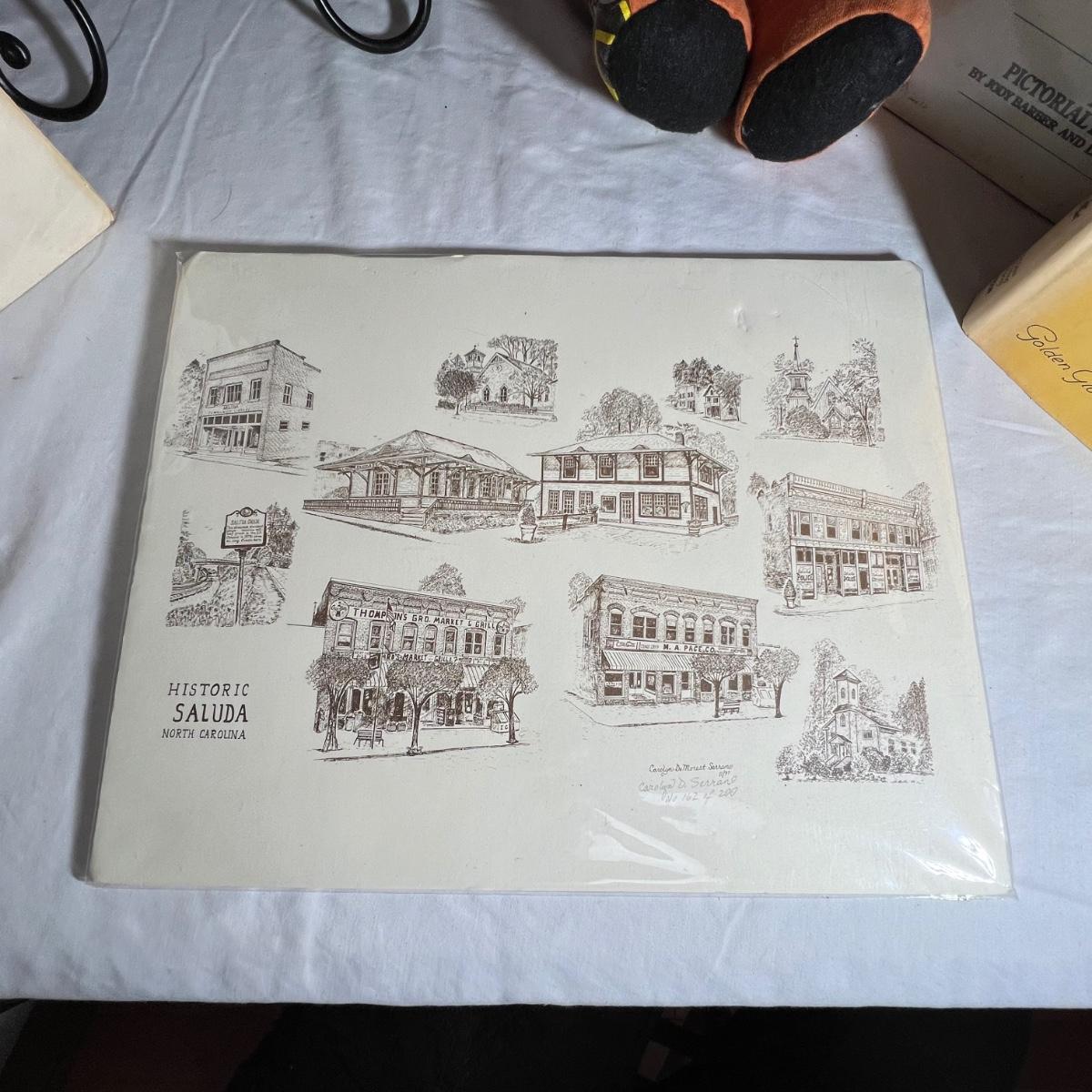 A great assortment of Hendersonville and Saluda items that includes “˜A Pictorial History’ hardback book that is signed and numbered. The Copper Crest print is framed in a black resin like frame that measures 11” x 13”. The unframed pen and ink print is also signed by artist Carolyn Demorest Serrano, it has a small dent, see image. Last but not least are three Norma Jean memory bears. Display stand not included.