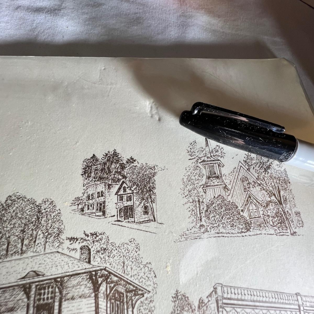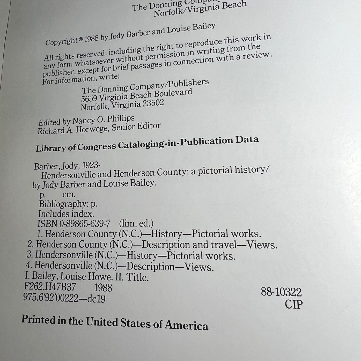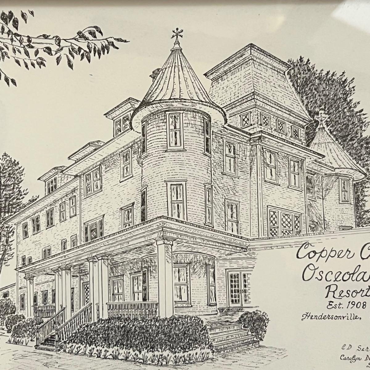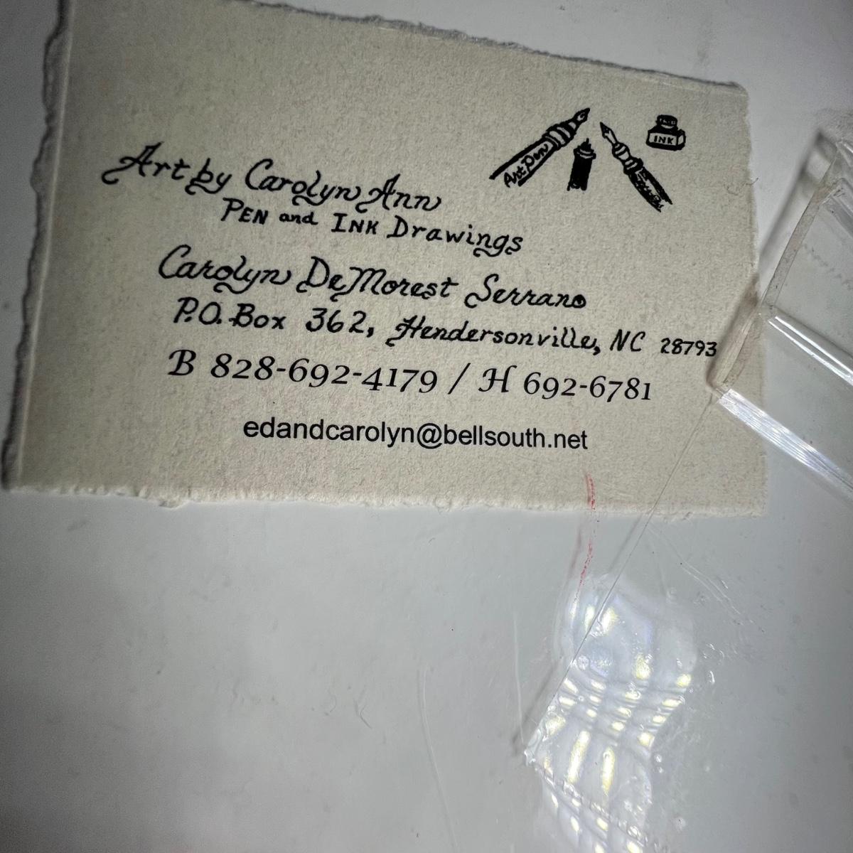 A great assortment of Hendersonville and Saluda items that includes “˜A Pictorial History’ hardback book that is signed and numbered. The Copper Crest print is framed in a black resin like frame that measures 11” x 13”. The unframed pen and ink print is also signed by artist Carolyn Demorest Serrano, it has a small dent, see image. Last but not least are three Norma Jean memory bears. Display stand not included.
