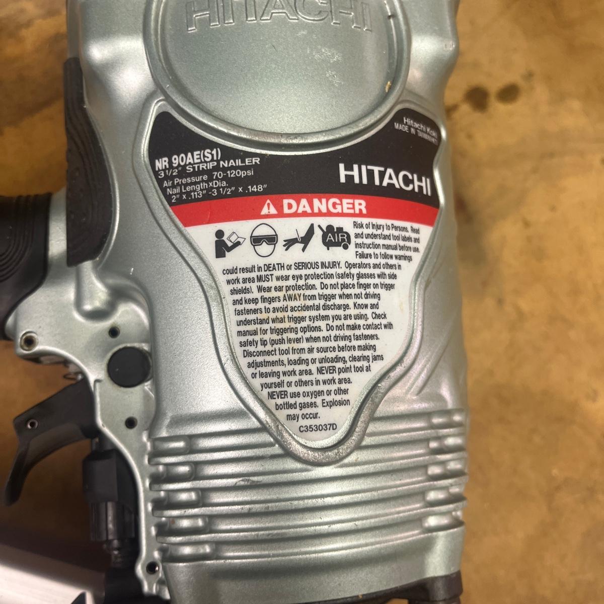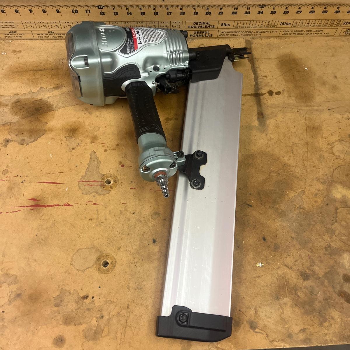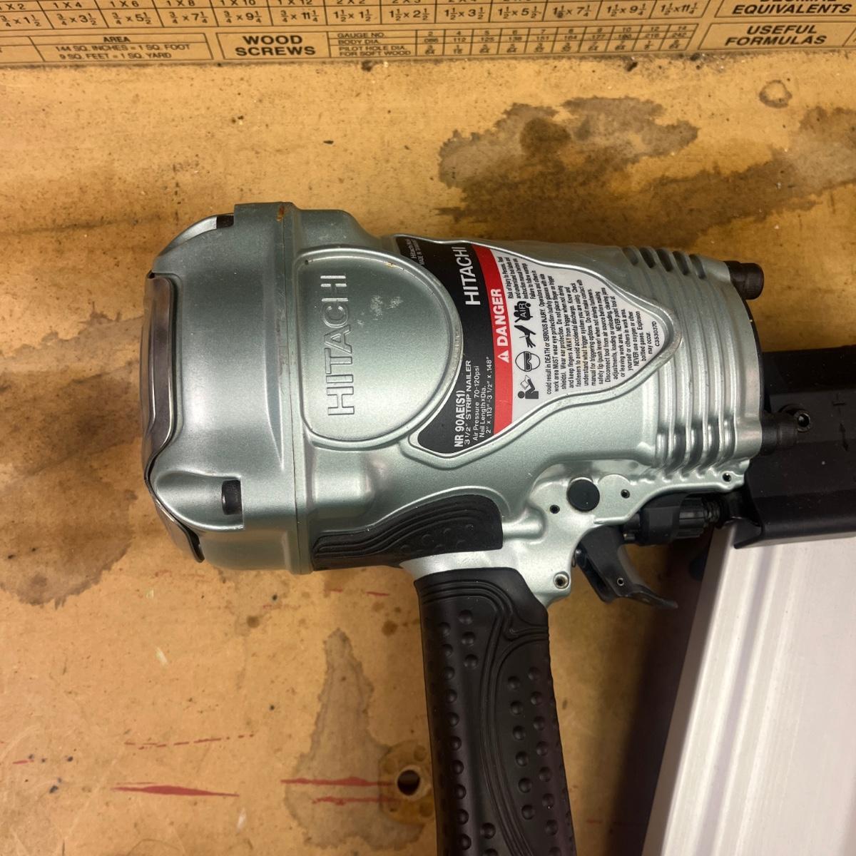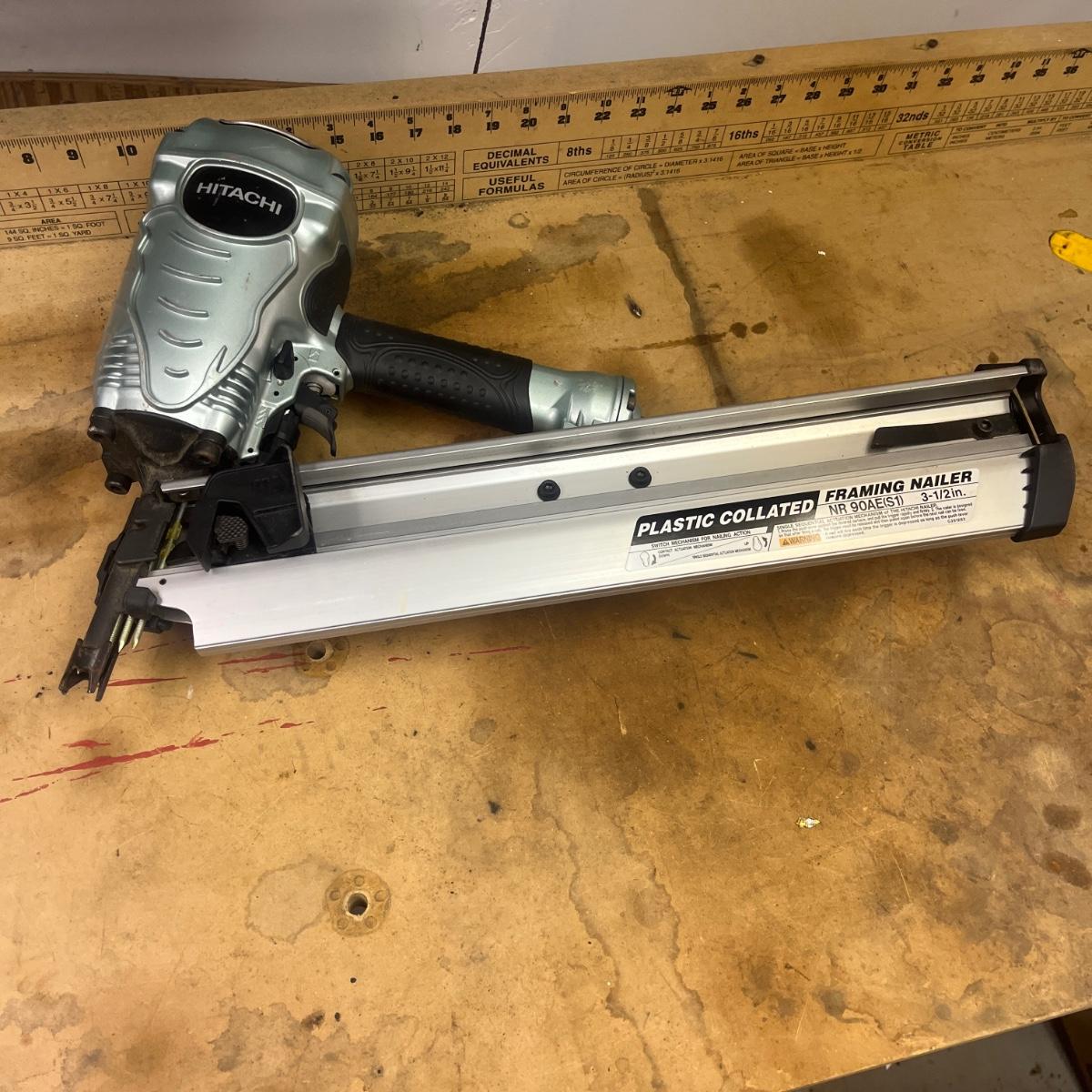 Lot includes a Hitachi pneumatic framing nailer. Nailer measures 14” x 5” x 20”long. Item was not tested.