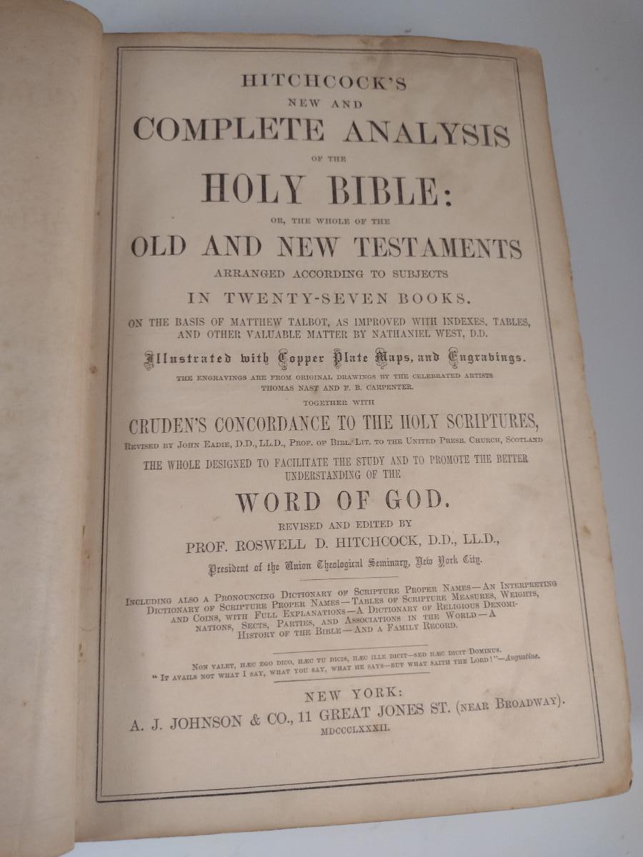 Hitchcock's New and Complete Analysis of the Holy Bible- Antique Printing (1882). Item is in heavily used condition- please see all pictures.