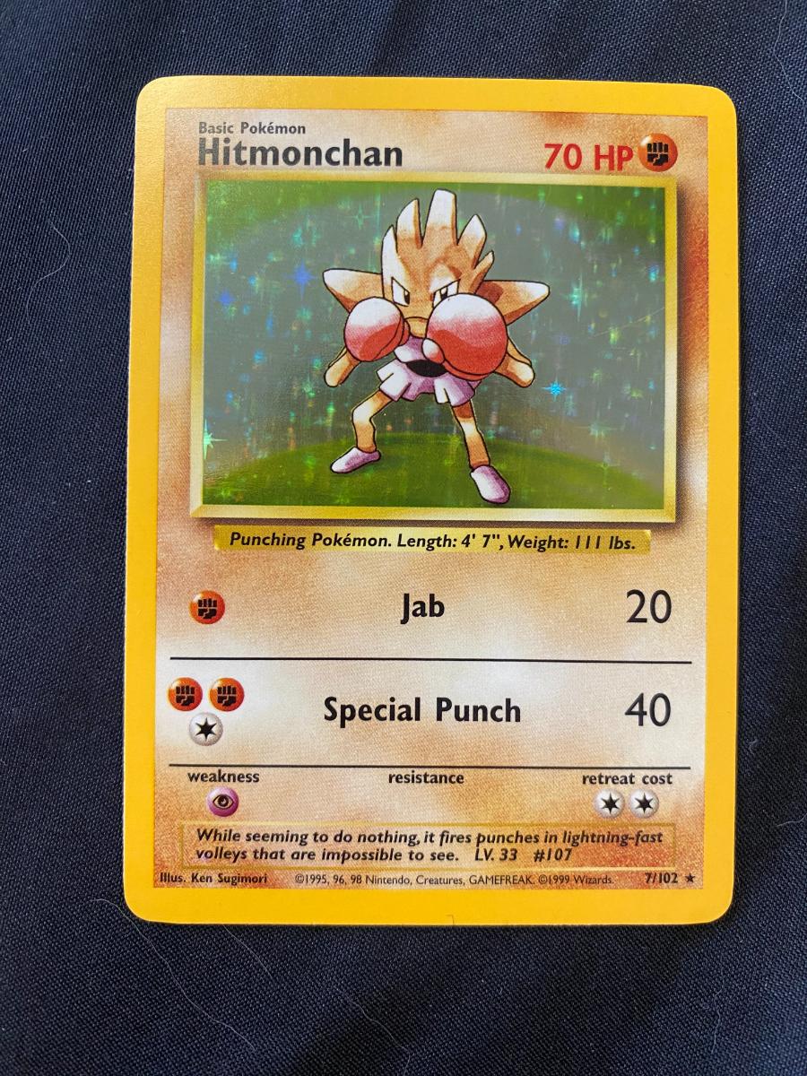Hitmonchan Holo card from the Pokémon TCG Base Set. Features holographic foil artwork. The card is in light play condition, indicating minimal surface wear and potential minor edge wear. Includes 70 HP, Jab attack (20 damage), and Special Punch attack (40 damage). Printed by Wizards of the Coast, part of the original Base Set release.