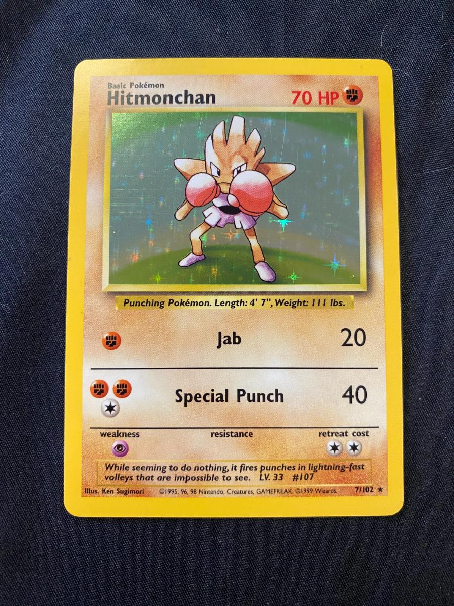 This is a Hitmonchan Holo Pokemon card from the original Base Set, card #7/102. The card has a light play condition with visible signs of use but remains in collectible condition. Features holographic artwork and standard card back. A sought-after card for fans and collectors of the Pokemon TCG.