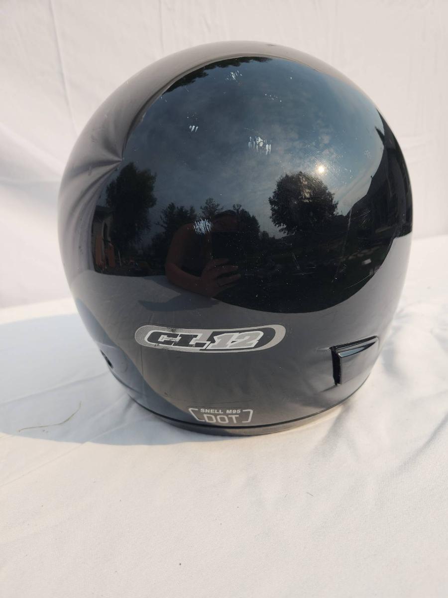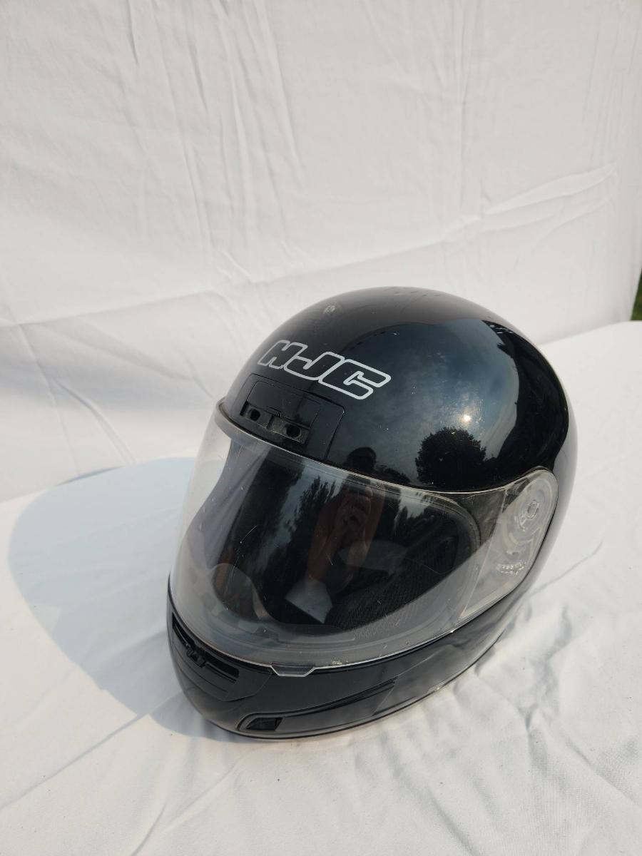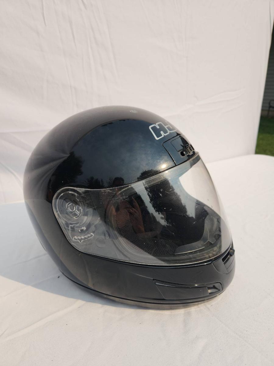HJC black full-face motorcycle helmet featuring a clear visor and internal padded lining. The helmet is DOT certified, indicating it meets safety standards for motorcycles. The outer shell shows light wear. Size and specific model details are not specified.