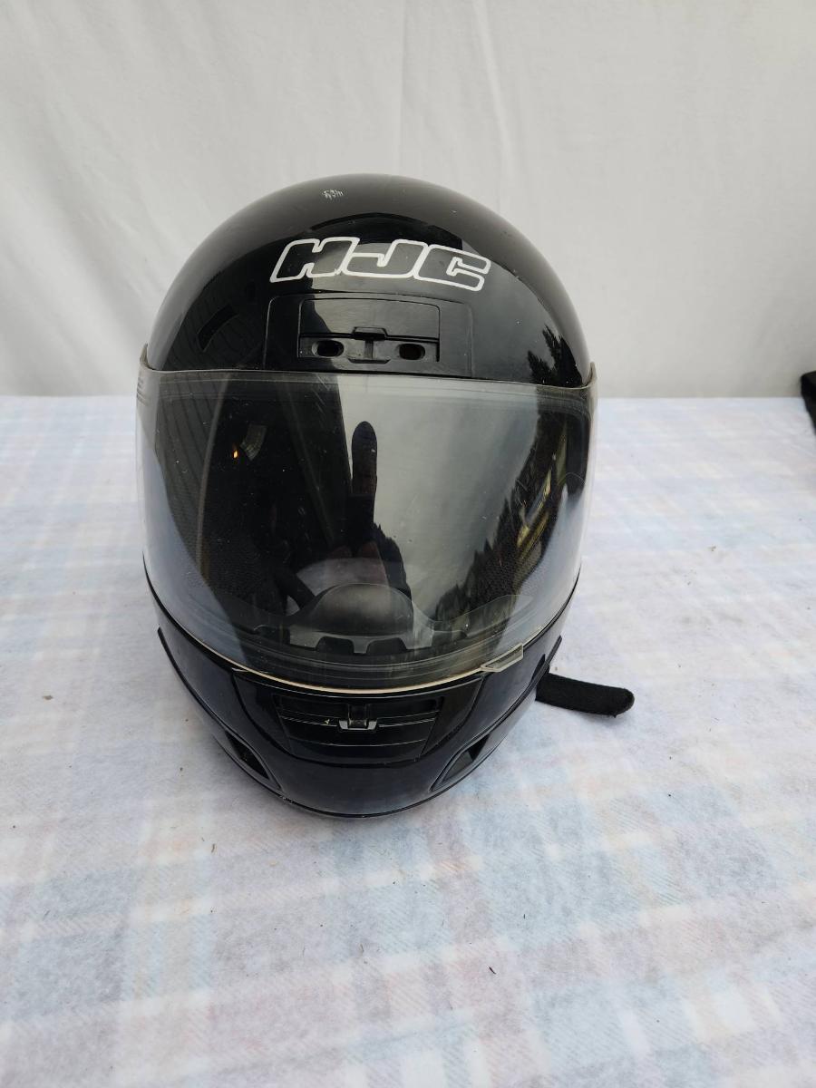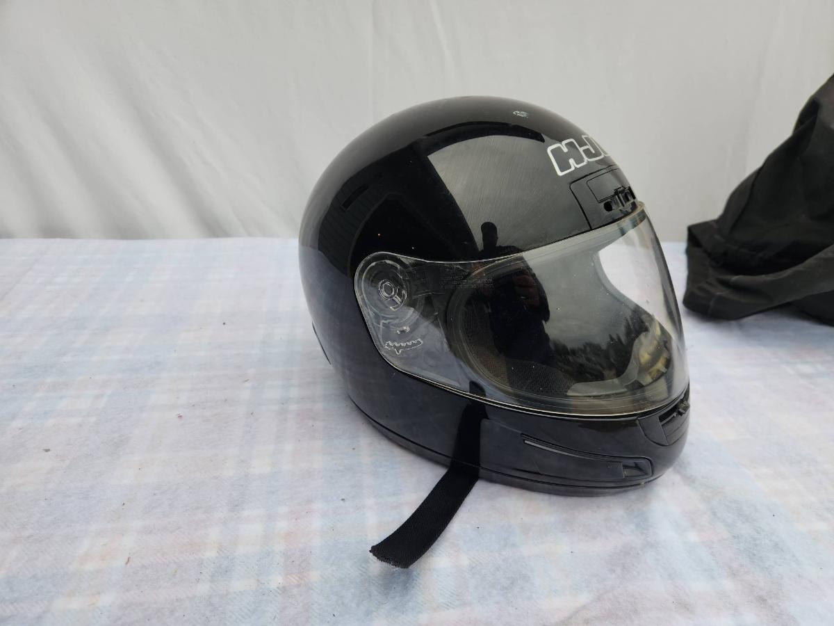 HJC full-face motorcycle helmet in black color featuring a transparent visor. Shows visible signs of wear with scratches present on the surface. Equipped with an adjustable strap for a secure fit. Includes branding on the front. Condition consistent with used protective gear. Size and model details are not specified.