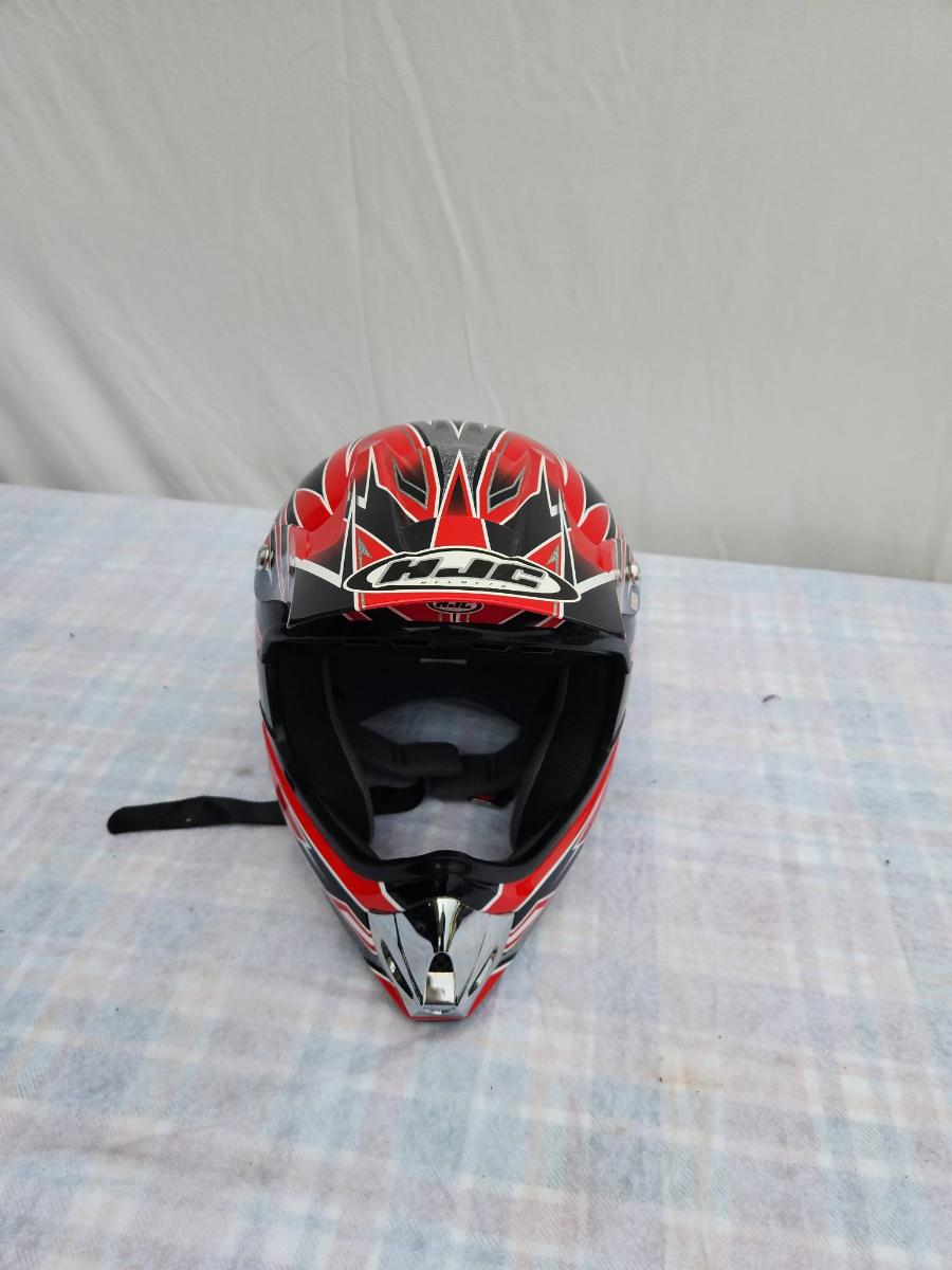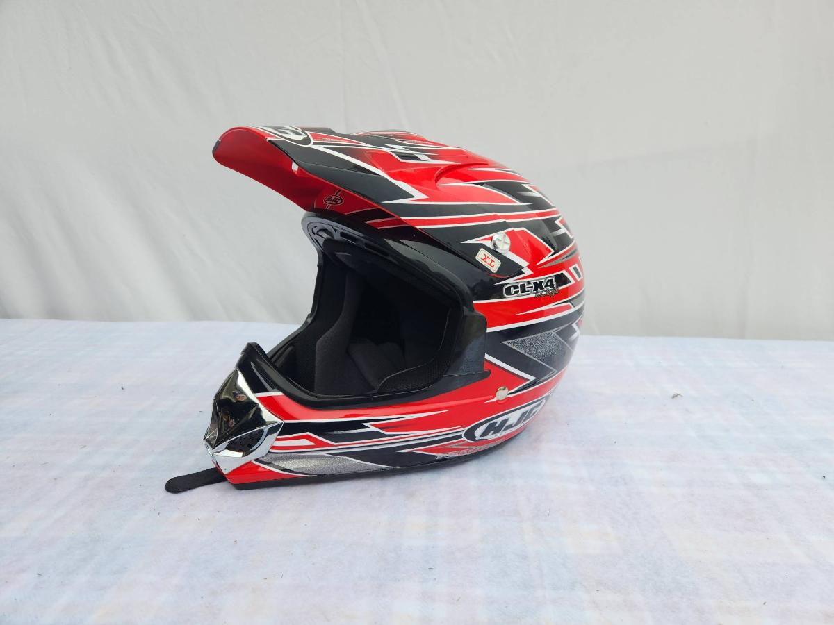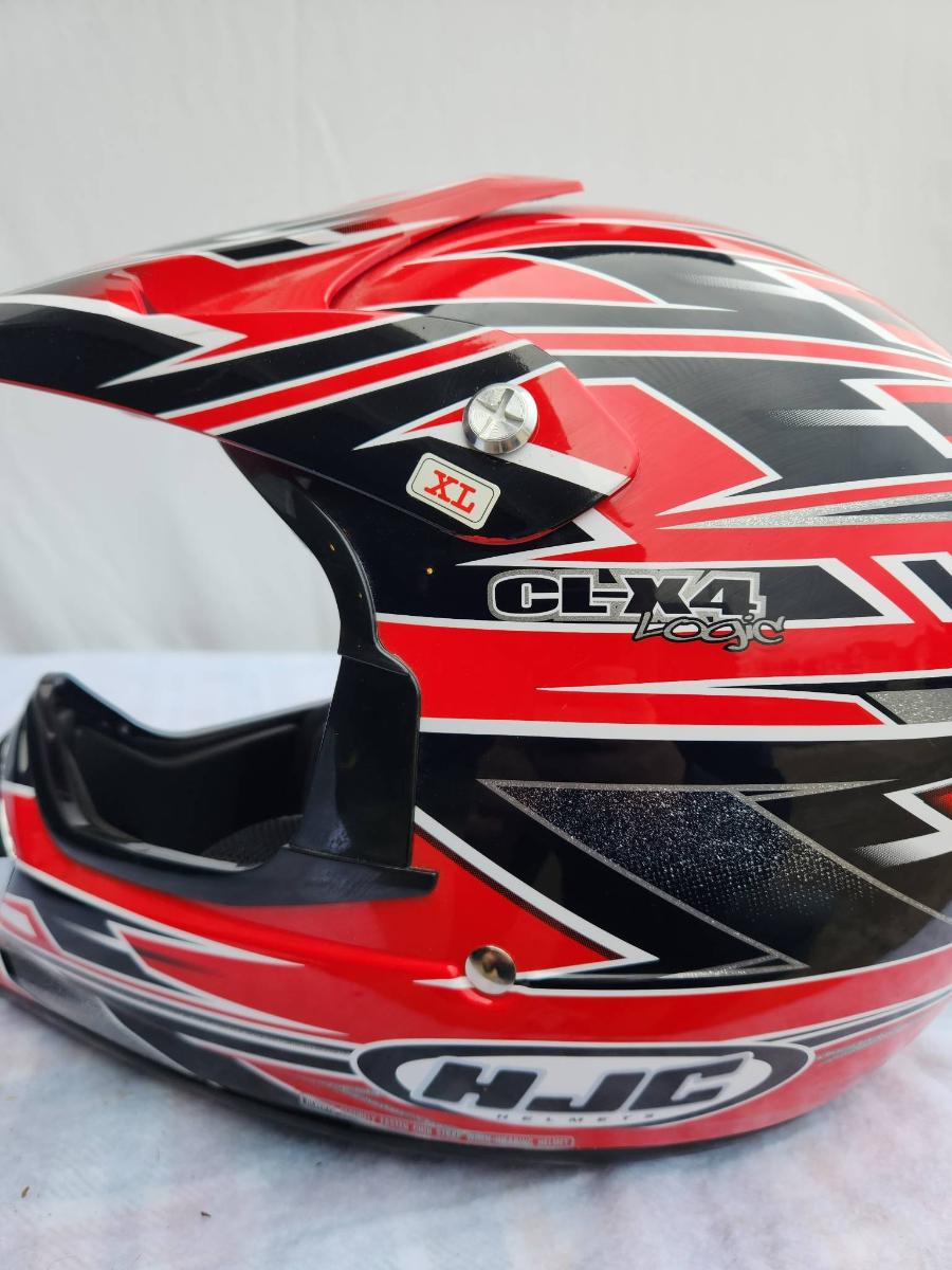 HJC CL-X4 off-road motorcycle helmet in red and black with distinct graphic design. Size XL. The helmet features a durable shell, adjustable visor, and a comfortable inner lining. It is suitable for off-road and motocross use. Signs of light use may be present.