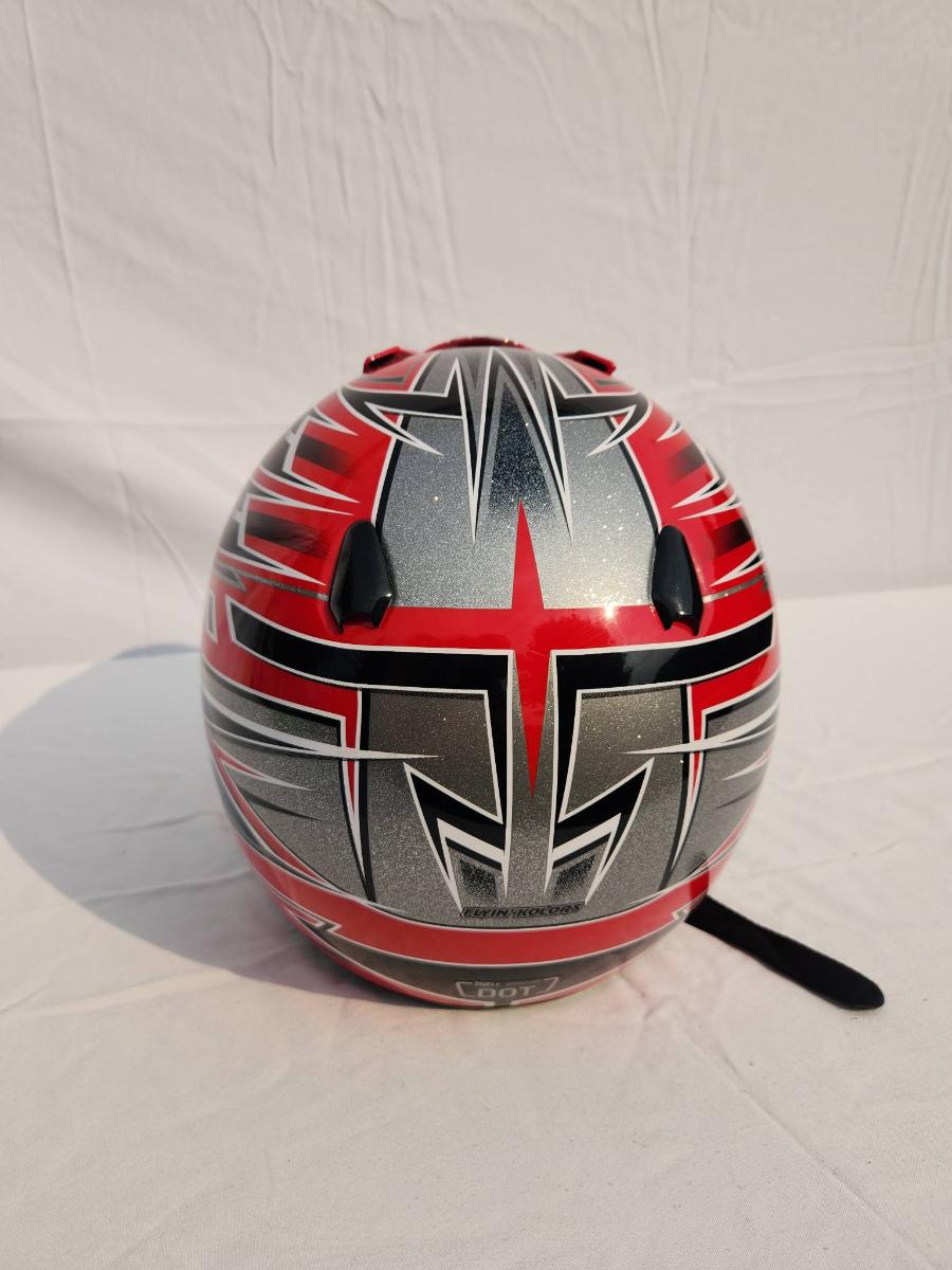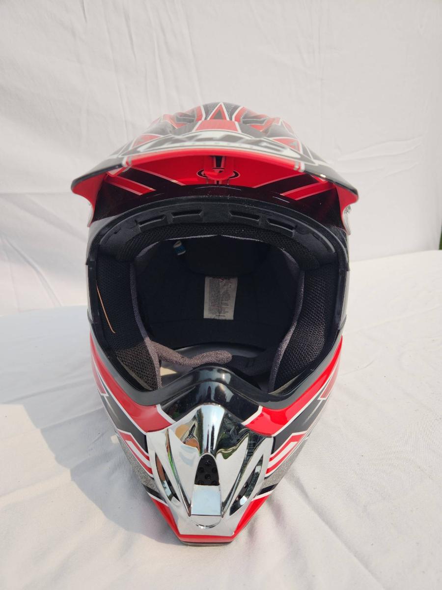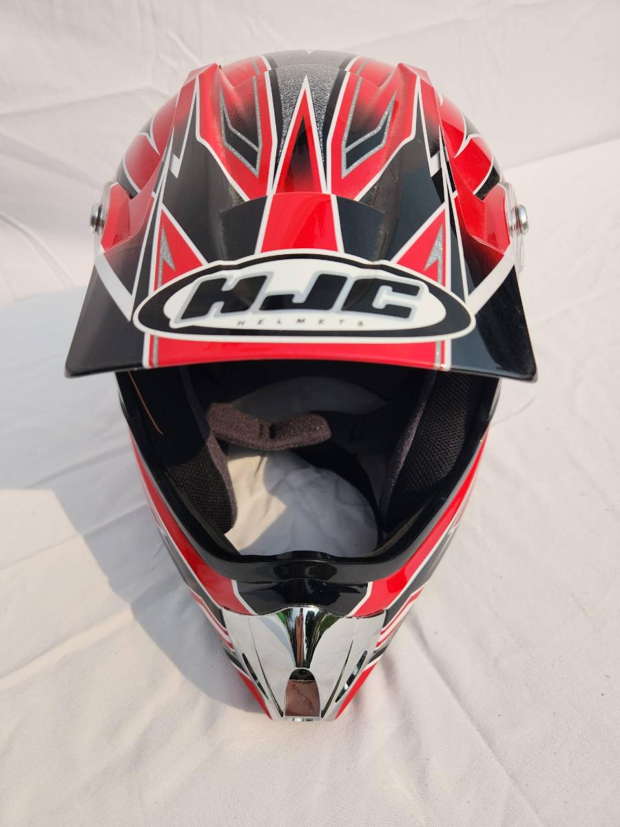 HJC CL-XY1 motocross helmet featuring bold red and black graphic designs. Size XL, constructed for motocross and off-road use. Includes a visor for sun protection, interior padding for comfort, and a durable outer shell. Appears in good condition with no significant visible damage noted on the exterior or interior. Ideal for motocross enthusiasts or riders seeking performance headgear.